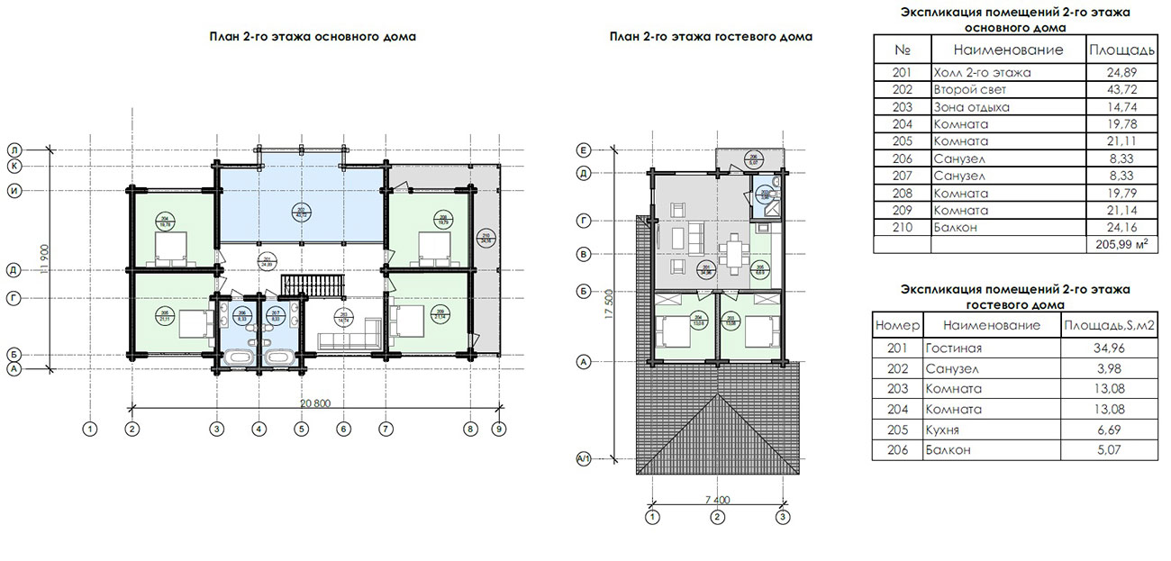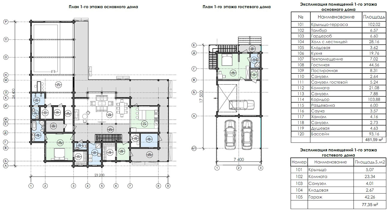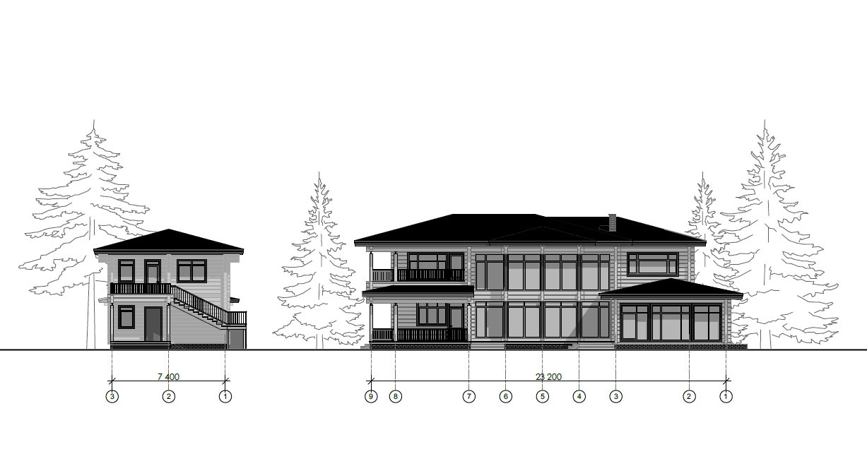 На участке расположен комплекс из двух строений: основной дом общей площадью 687,56 м² и гостевой дом со встроенным гаражом площадью 154,21 м².