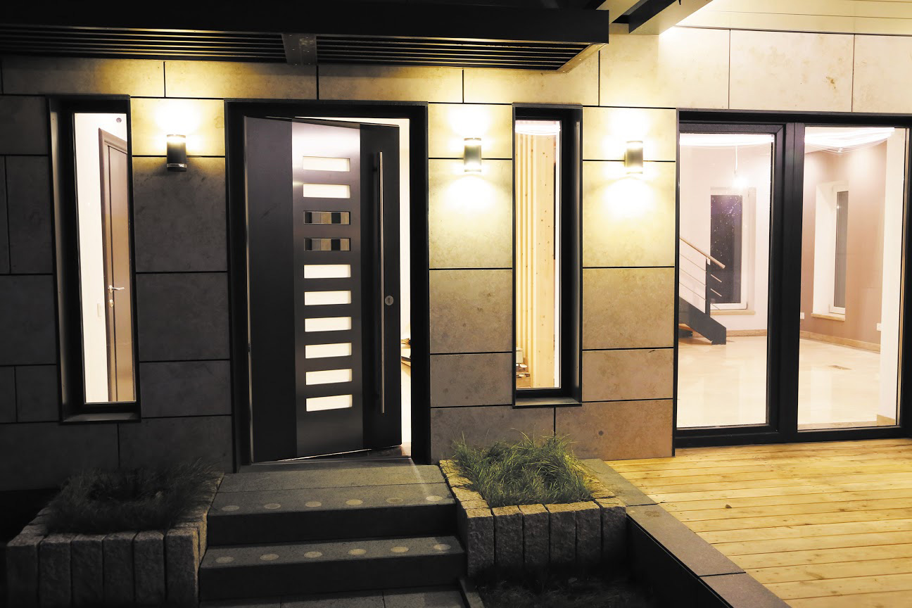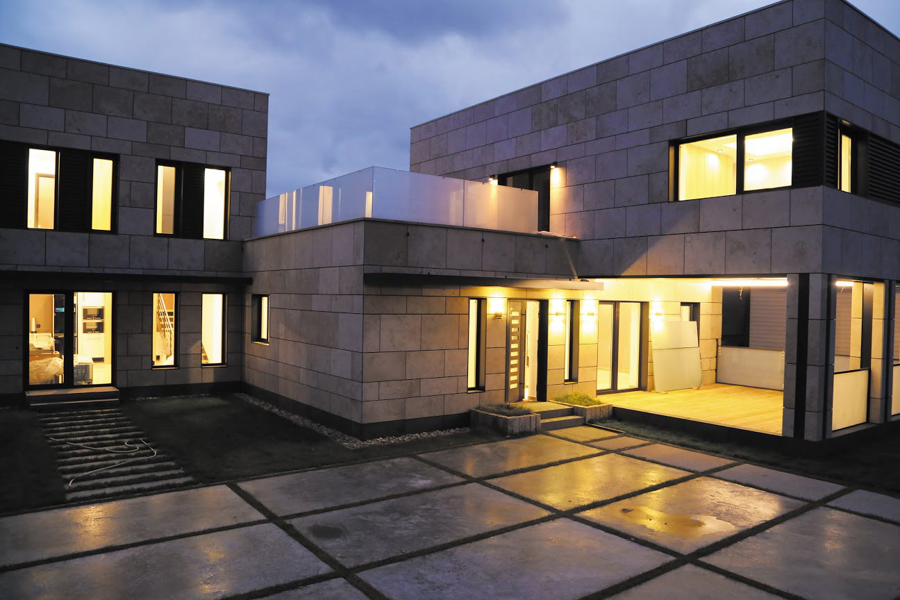 Благодаря прочному основанию из сборных металлоконструкций в отделке дома могут применяться тяжелые материалы, такие как натуральный камень.