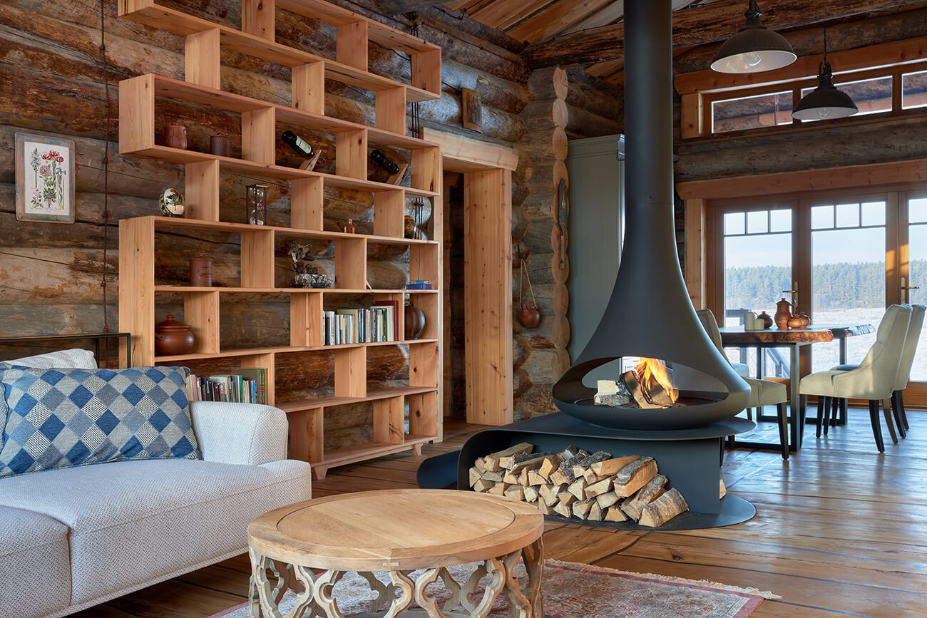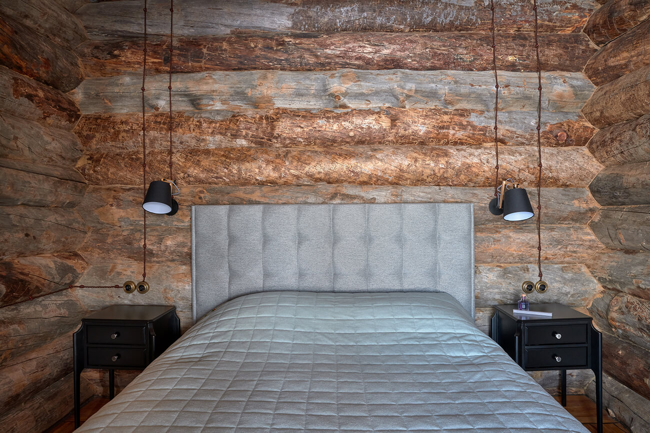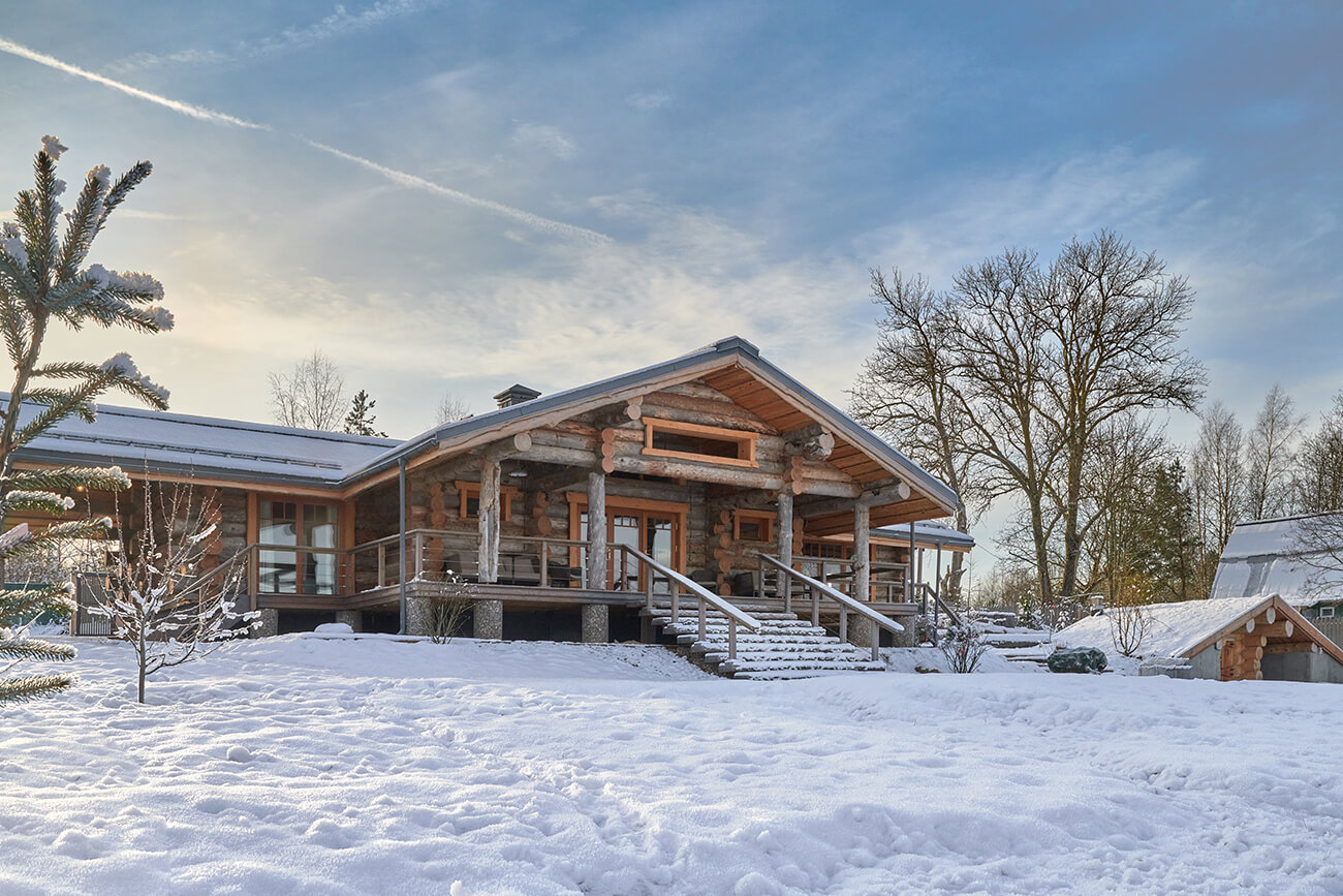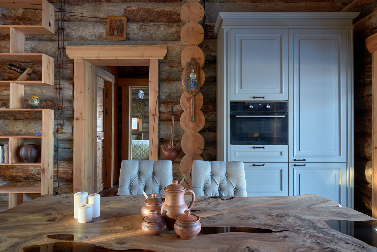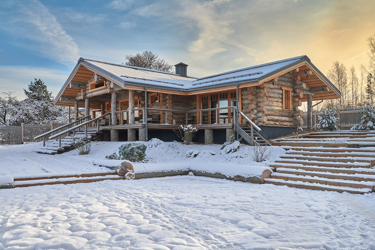 Основой для стен стал сруб из сухостойной полярной сосны Кело диаметром 28–30 см. Фундамент — монолитная плита с буронабивными сваями, которые держат просторную террасу. Всю эту конструкцию завершает фальцевая крыша с подшитыми карнизами из сухостойной доски Кело.