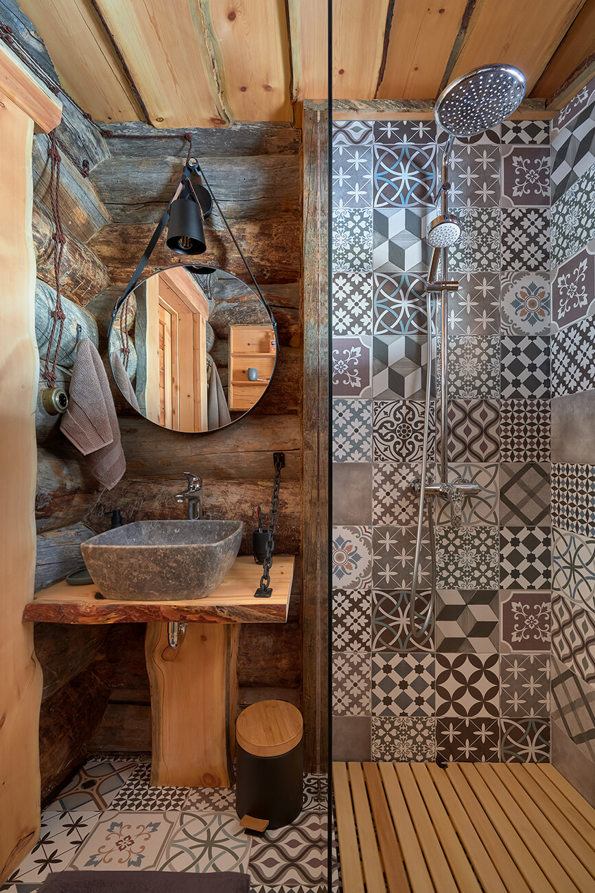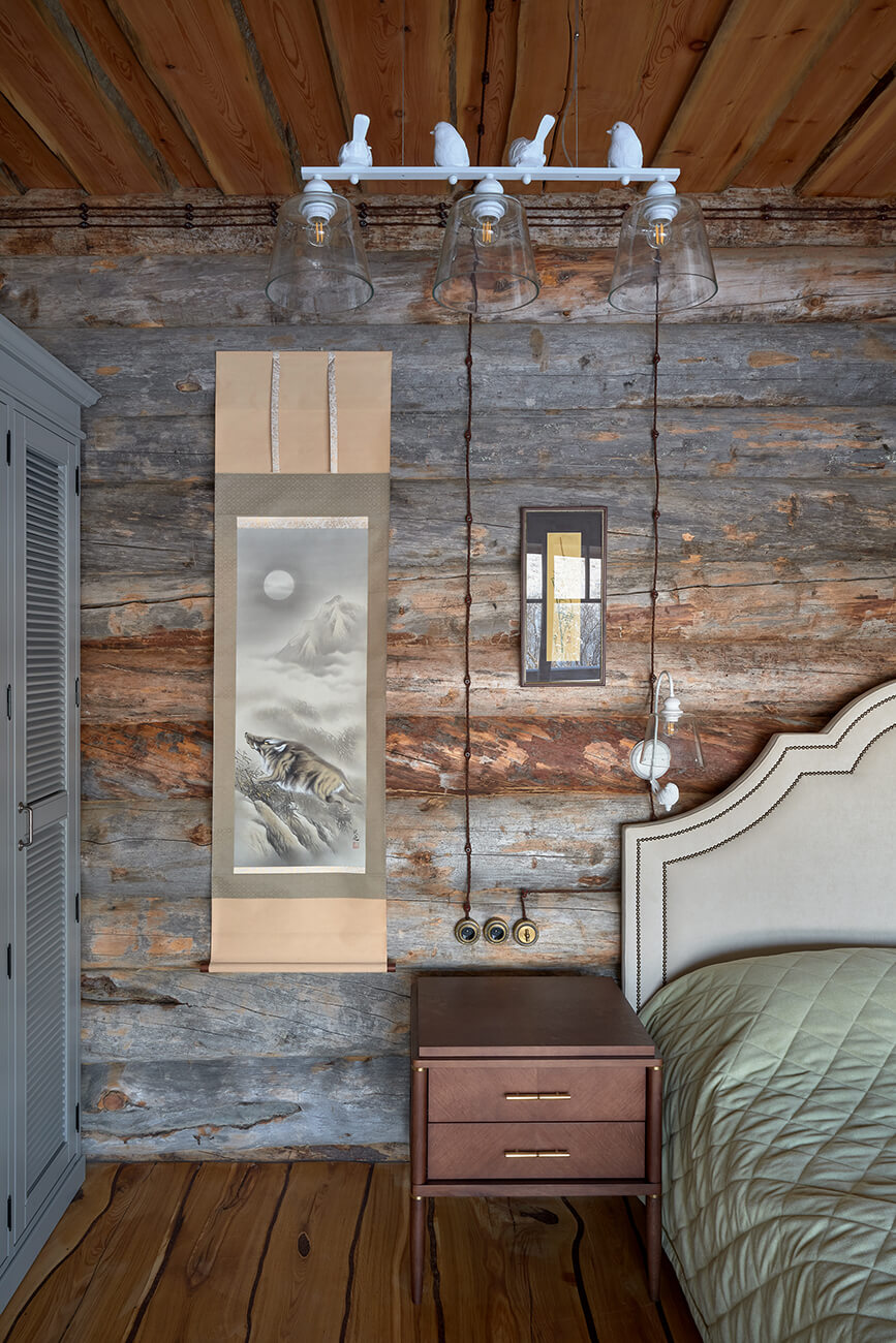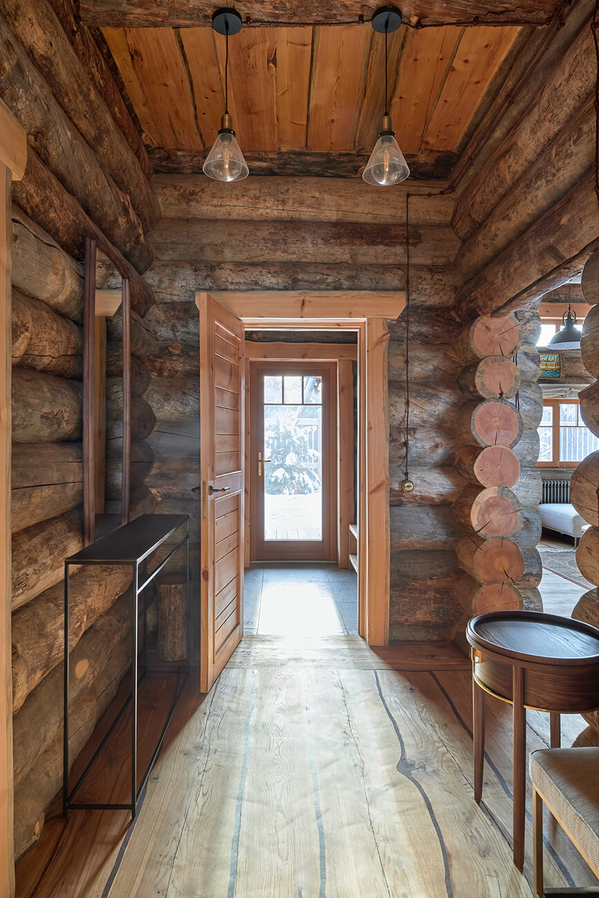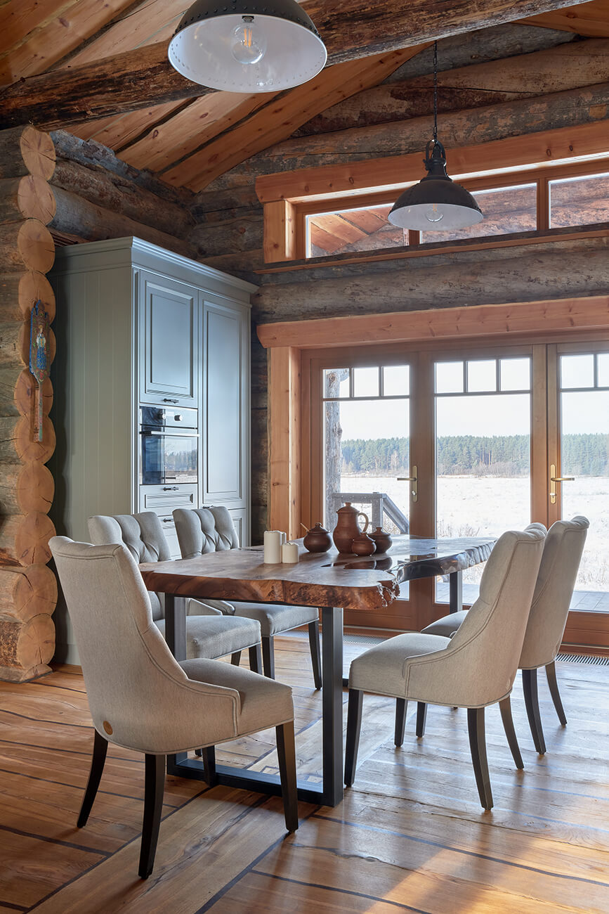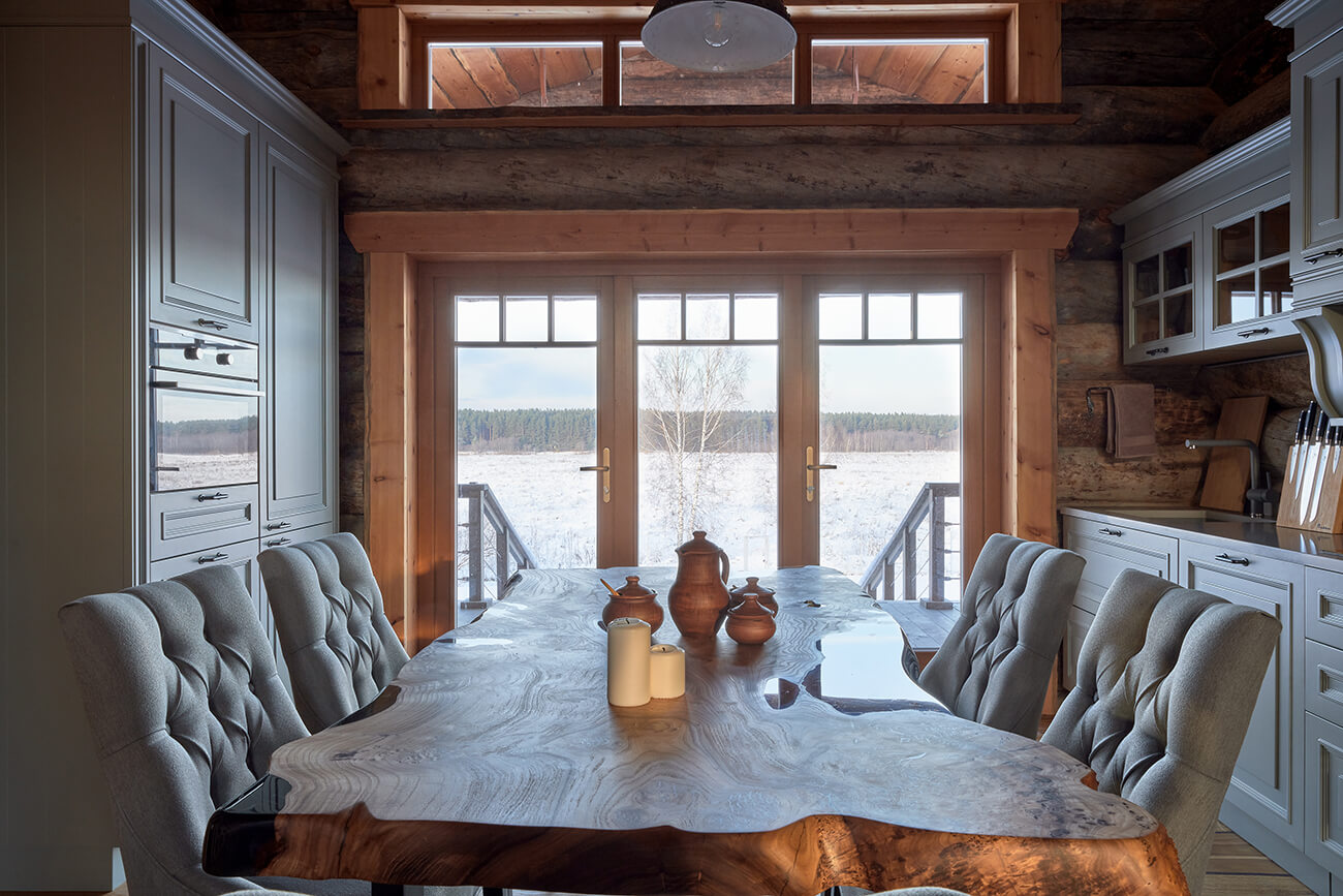 Основой для стен стал сруб из сухостойной полярной сосны Кело диаметром 28–30 см. Фундамент — монолитная плита с буронабивными сваями, которые держат просторную террасу. Всю эту конструкцию завершает фальцевая крыша с подшитыми карнизами из сухостойной доски Кело.