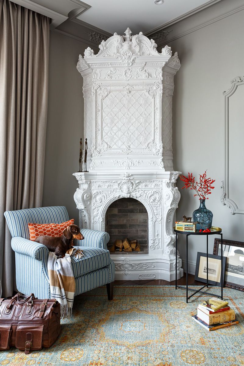 Сердцем этого дома является изразцовый глазурованный камин. Он занимает почетное место в гостиной. Выполнен по образцу известного барочного камина конца XIX — начала XX века производства завода «Або» в Финляндии. Это очень точная копия, воссоздающая аутентичные изразцы, сложный проработанный рельеф и бароккальные сюжеты того периода. Такой же камин стоит в доме управляющего завода «Або» (в период с 1886 по 1915 г.) Эрнста Минута в Турку, в доме купца Дьякова в Балашове, в особняке Н.Я. и Ф.Я. Колобовых и в особняке В.В. Тиса в Санкт-Петербурге, теперь и в современном интерьере данного проекта.