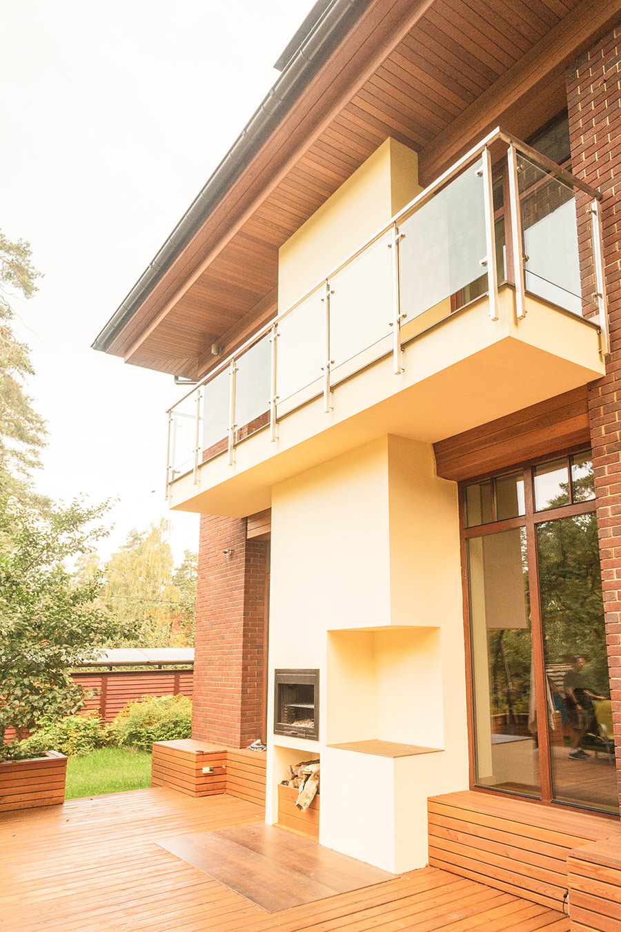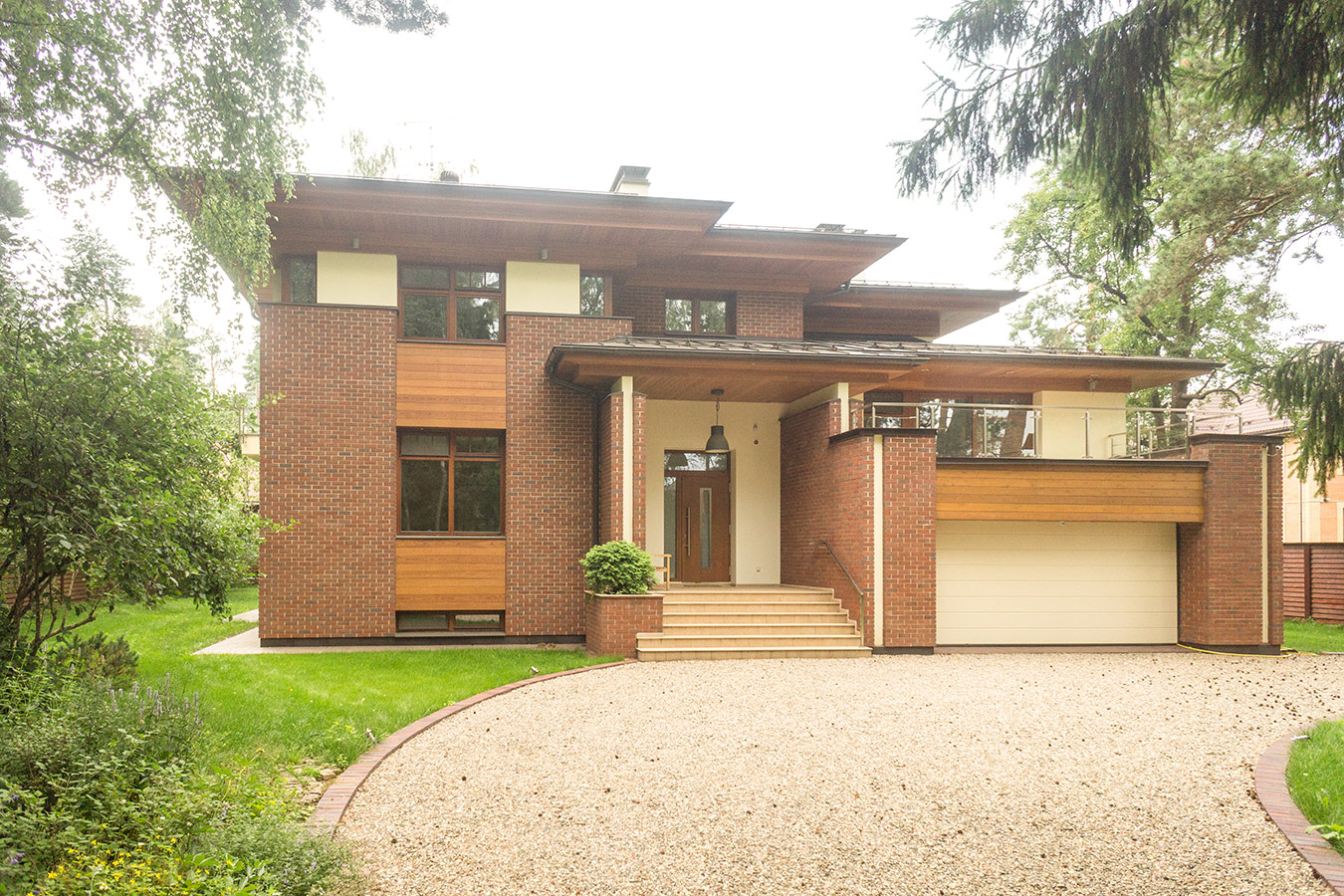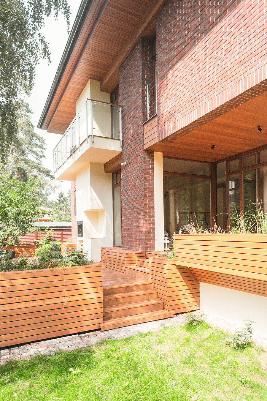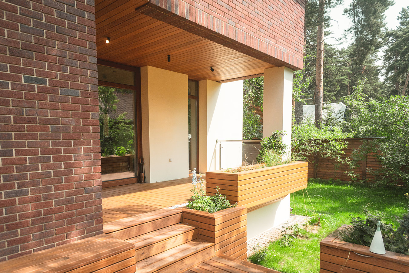 Материал несущих стен — полнотелый кирпич с наружной верстой из клинкерного кирпича ручной формовки. Перекрытия — монолитная плита. Кровля — фальцевая Rukki. Окна — деревянные дуб с тройным стеклопакетом. Отделка элементов фасада, свесов кровли и верхнего фриза — термообработанный ясень.