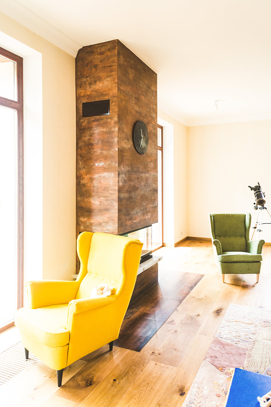 Связь интерьера и окружающего дом пространства сознательно не акцентируется, что подчеркнуто различными материалами отделки. Взаимопроникновение наружного холодного и теплого внутреннего происходит на другом, более глубоком уровне — с помощью ряда действенных приемов. Так, камин в гостиной и уличное барбекю представляют собой единую конструкцию, кортен-сталь использована на клумбах и во внутренней отделке, наружные подоконники-скамьи на улице стали продолжением пола в гостиной, вечером свет на кухне освещает и открытую уличную зону для завтрака.