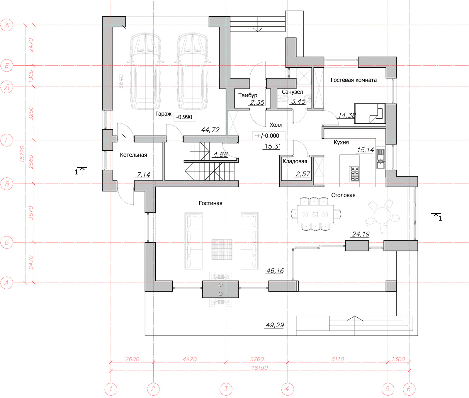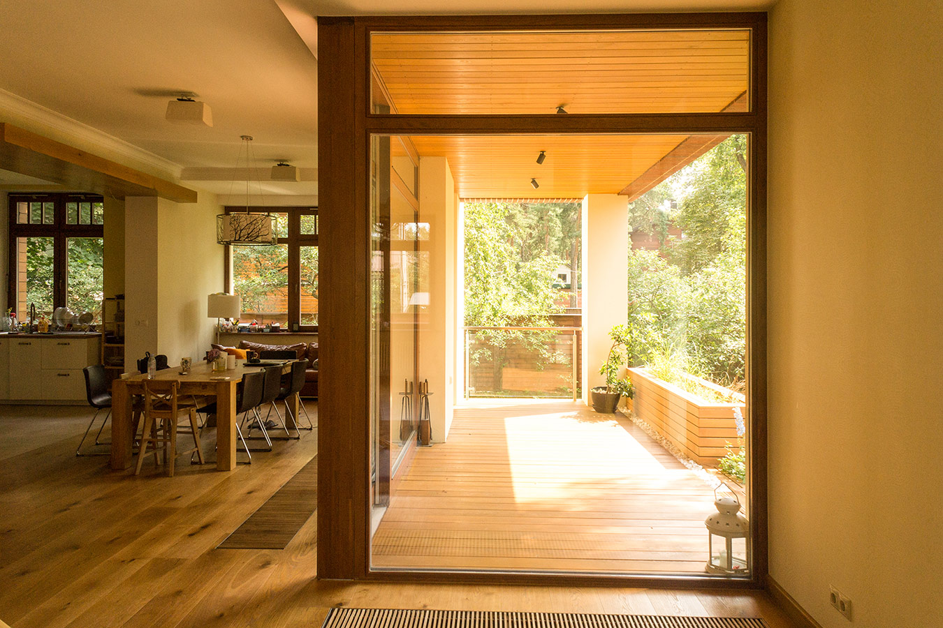 Внешне суровый фасад дополняет большой и светлый главный вход, через который можно пройти в холл, затем в гостиную с громадными окнами, просторные кухню и столовую и выйти на террасу с деревянным покрытием.