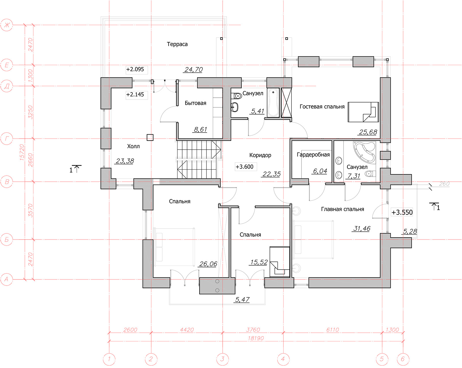 На цокольном этаже, кроме необходимых в каждом доме кладовых и технических помещений, обустроены спортивный зал и уютный домашний кинотеатр. В гараже стоят мотоцикл хозяина и ожидает реставрации старая «Волга» дедушки. На втором уровне располагаются четыре просторные спальни, в том числе главная спальня с ванной и гардеробной.