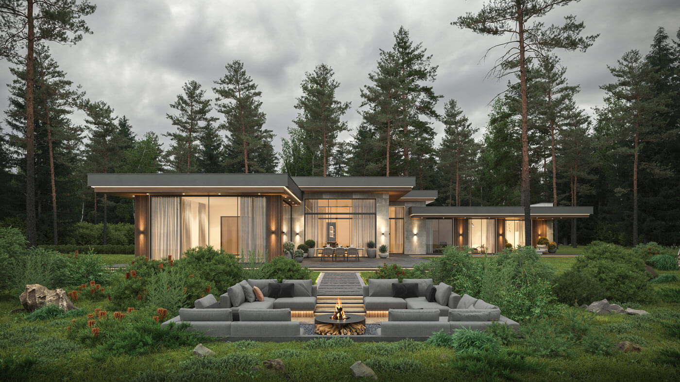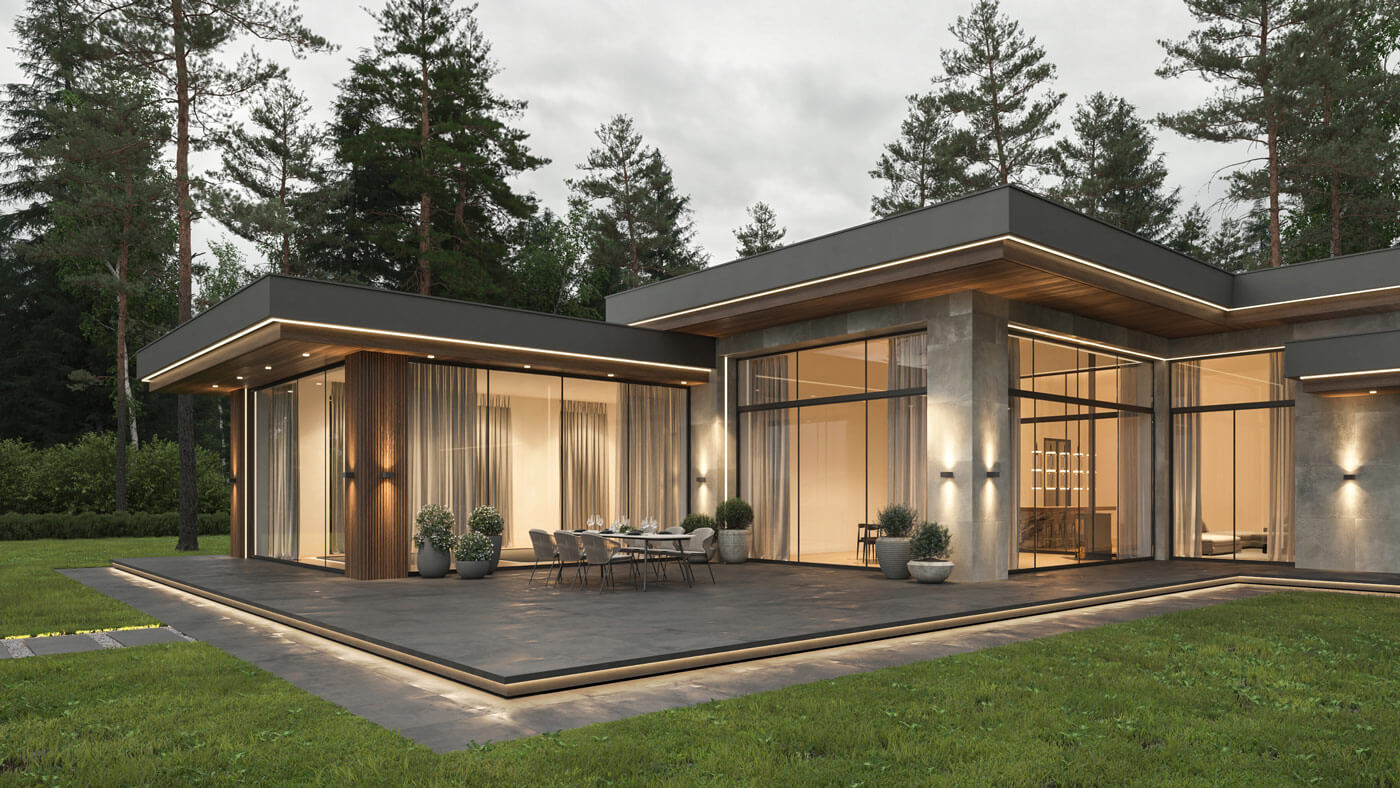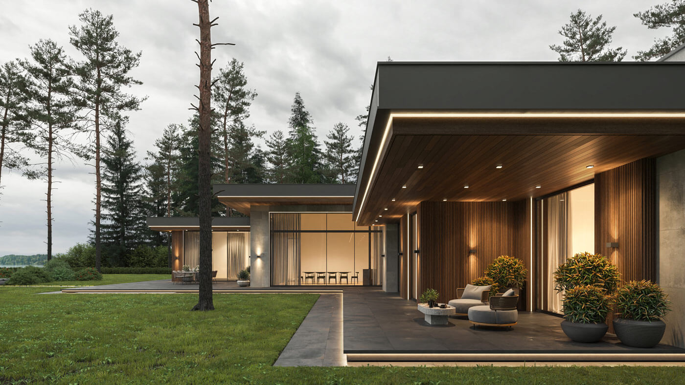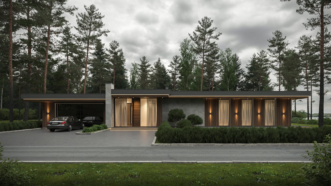 Большой одноэтажный дом в современном стиле на первой береговой линии Волги. Проект представляет собой единый комплекс зданий под одной крышей из монолита с облицовкой из ригельного кирпича. На фасаде применяются дополнительные декоративные элементы из керамогранита, дерева и металла.