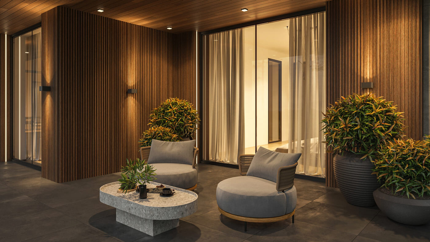 Жилая зона отделена от остального дома с помощью холла и дополнительной внутренней террасой в мастер-спальне. Последняя расположена в углублении, что прячет её от обзора.