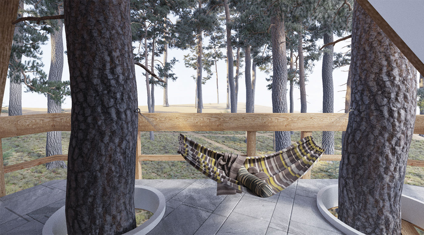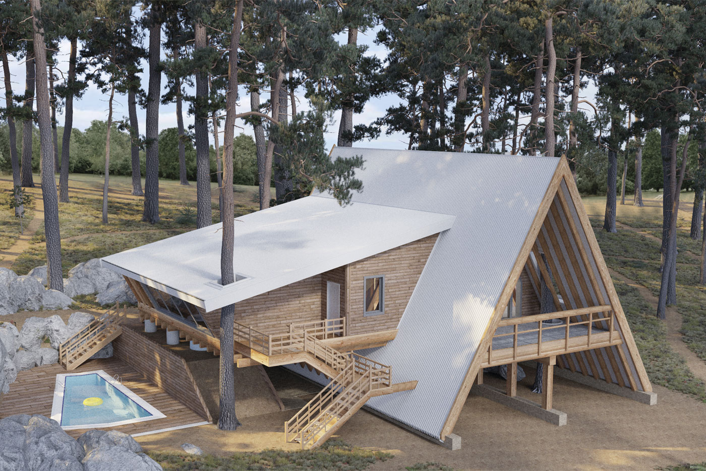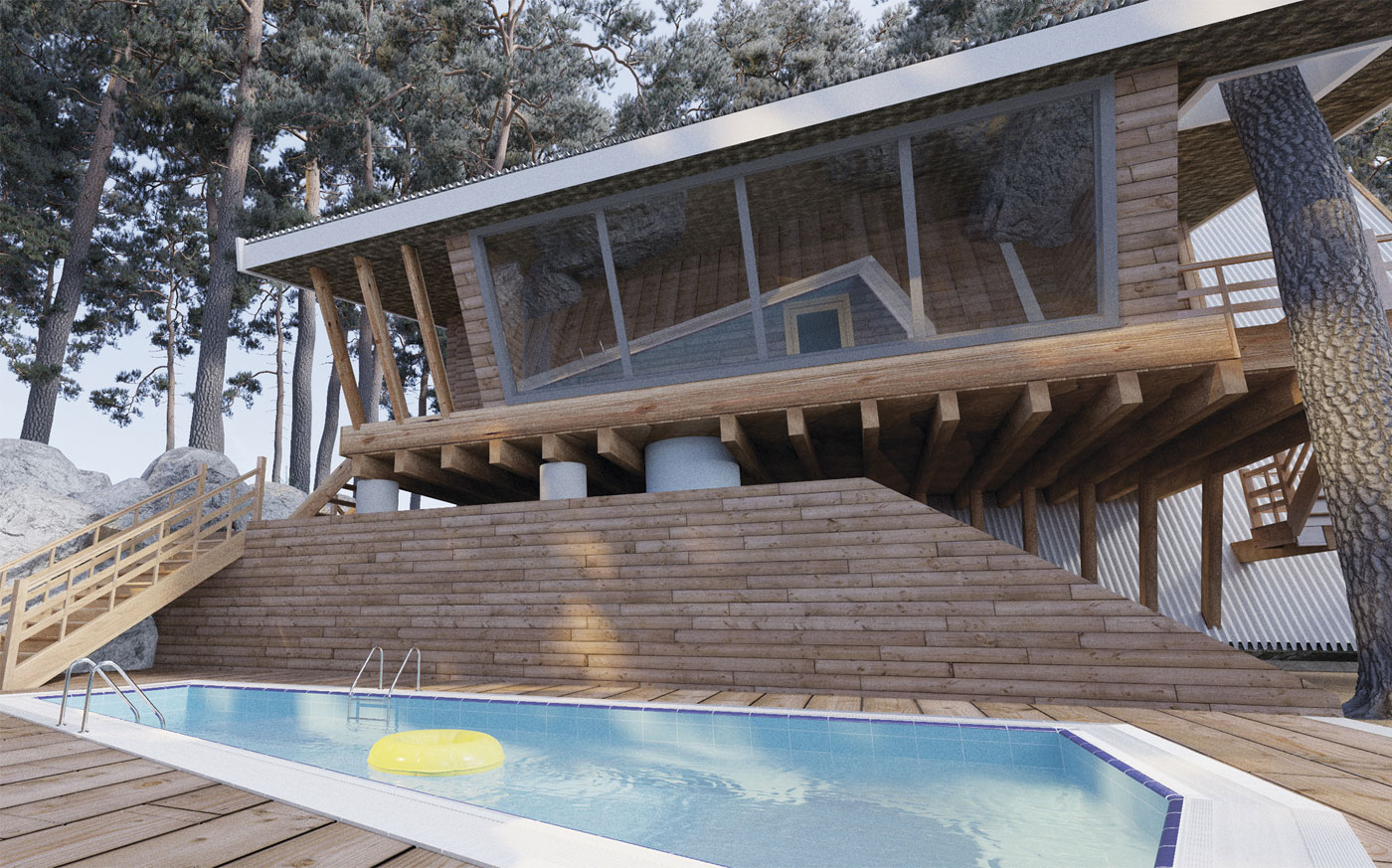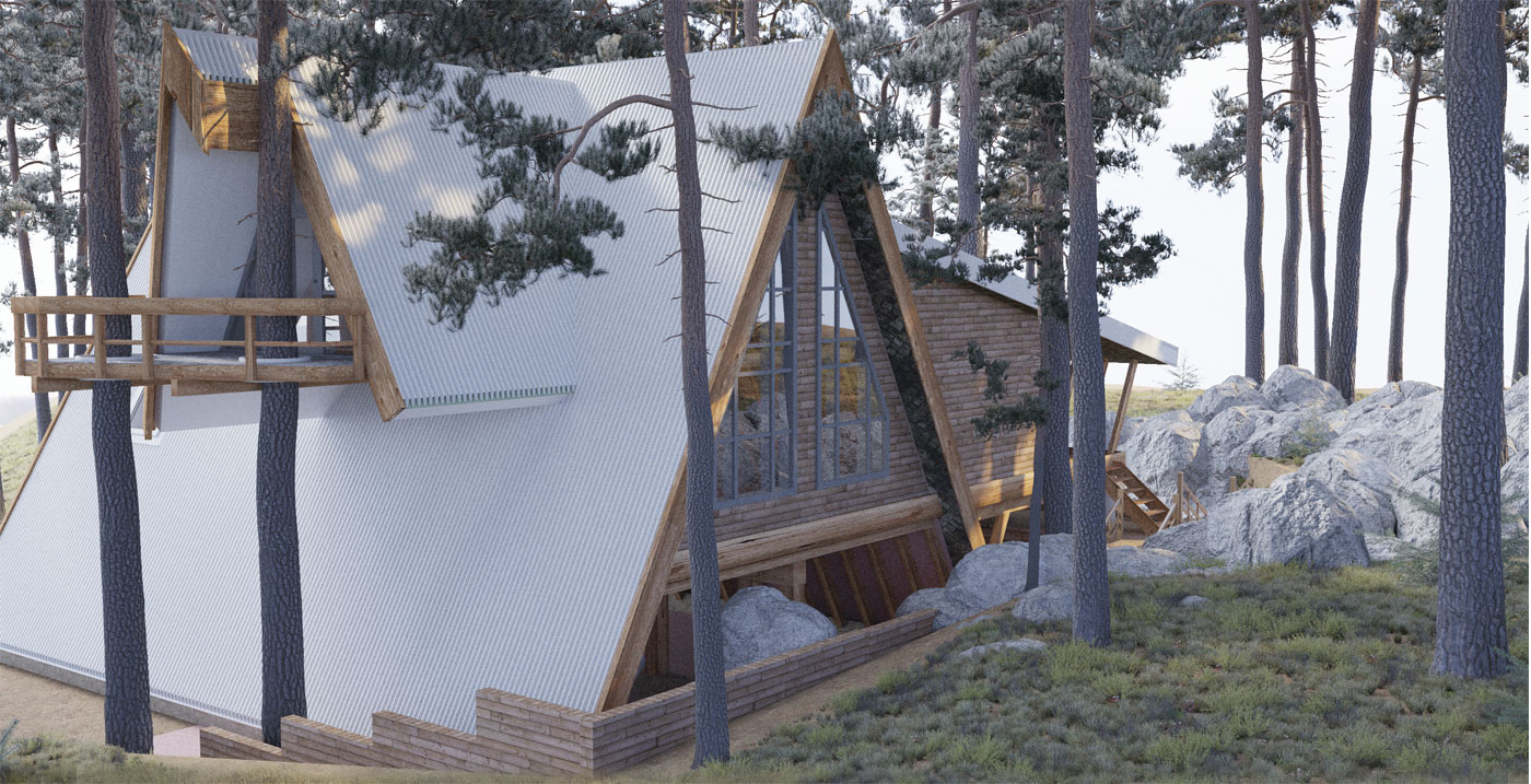 Главная идея проекта — строительство дома на существующем рельефе с минимальным вмешательством, а также сохранение имеющихся деревьев. На ее основе была разработана концепция многоуровневого дома. Расположение здания учитывает ориентацию по сторонам света, а также живописные виды, открывающиеся из окон.