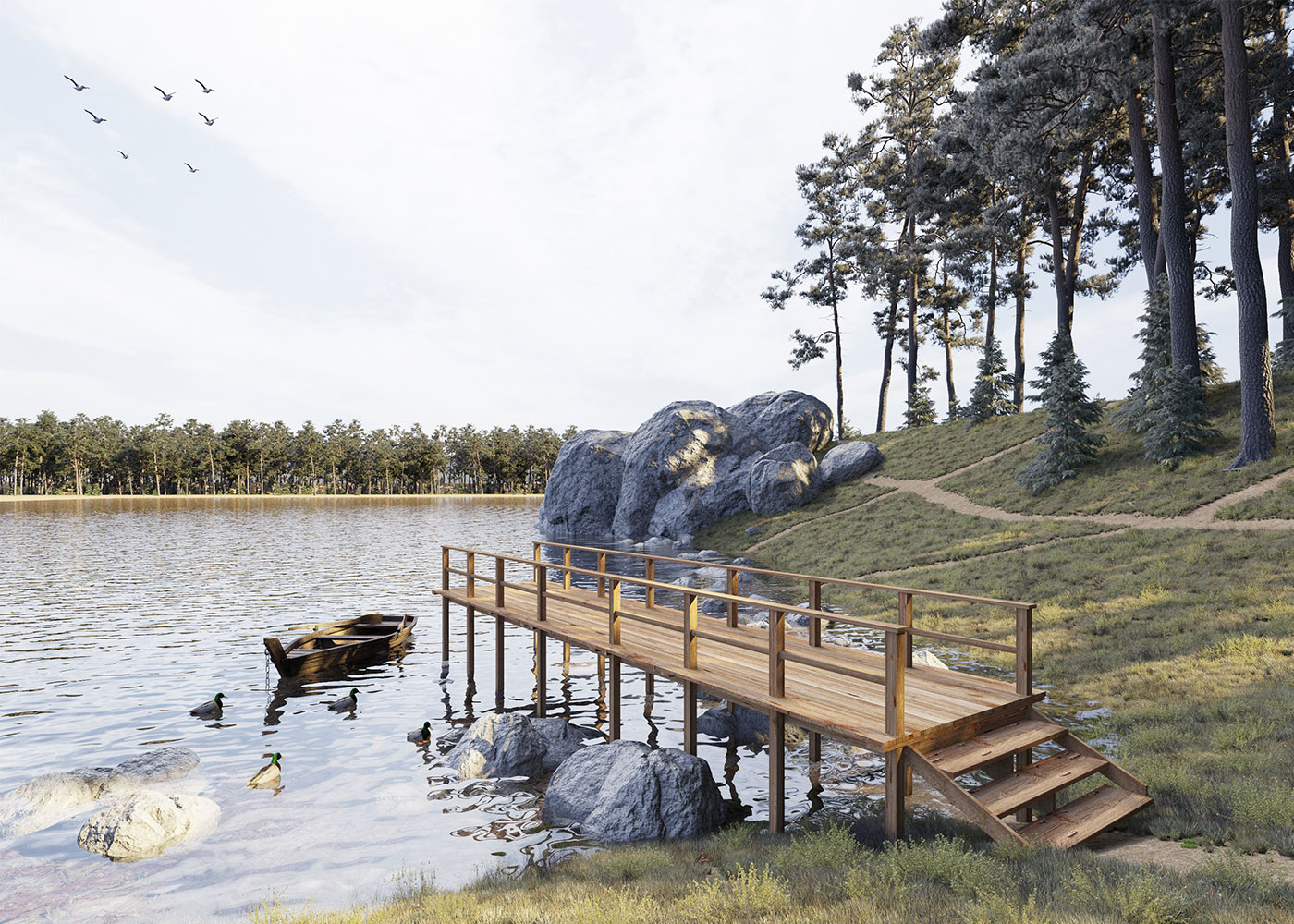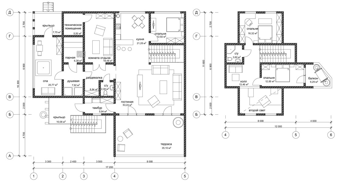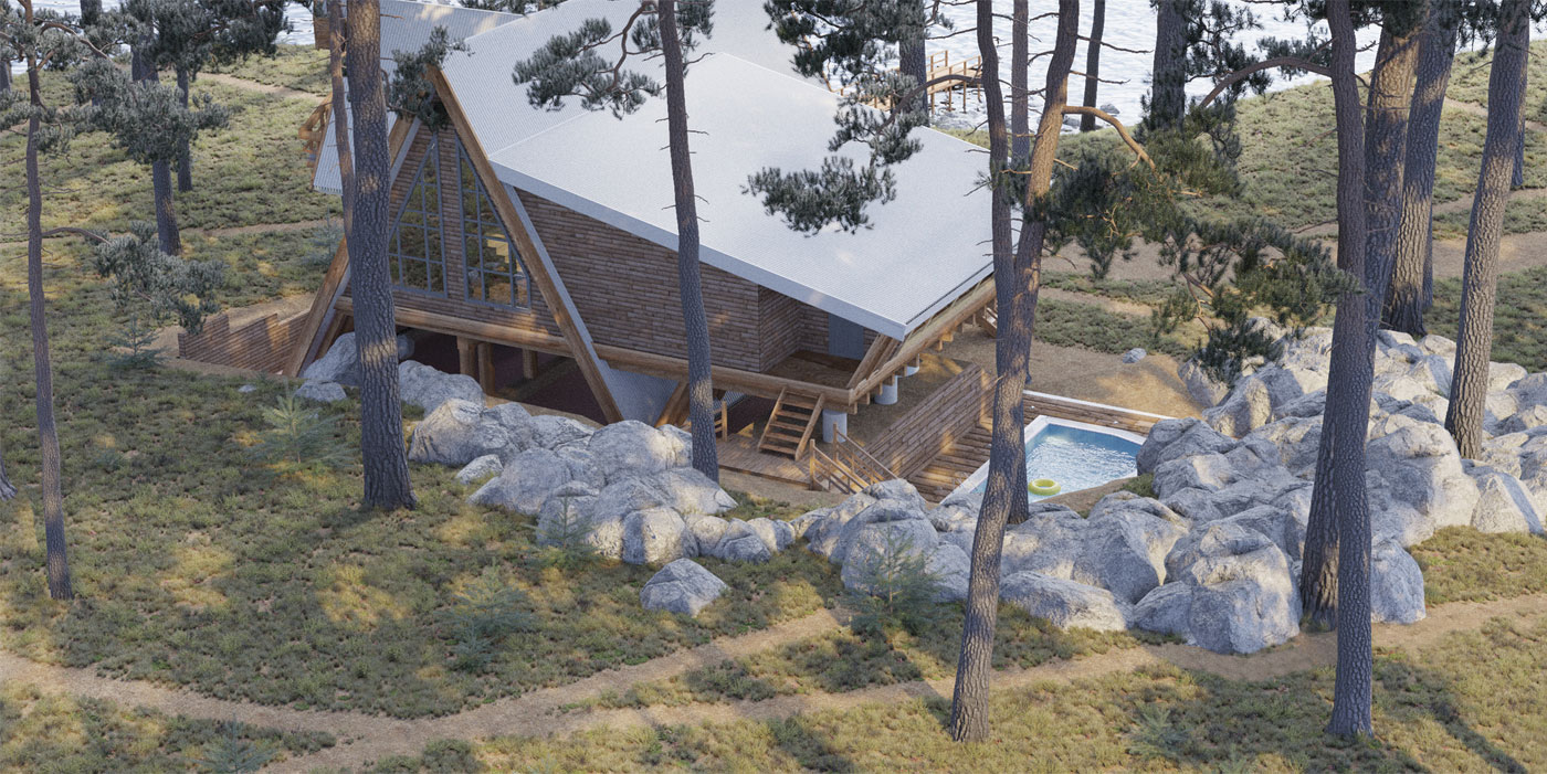 Дом предназначен для круглогодичного проживания. На первом этаже размещены просторная гостиная со вторым светом, кухня, в которую можно попасть через барную зону, и спальня. Из гостиной предусмотрен выход в зону спа, включающую в себя комнату отдыха с камином, раздевалку, душевую, парную и зал для проведения спа-процедур и массажа. На втором этаже имеются две спальни, с балкона открывается вид на озеро.