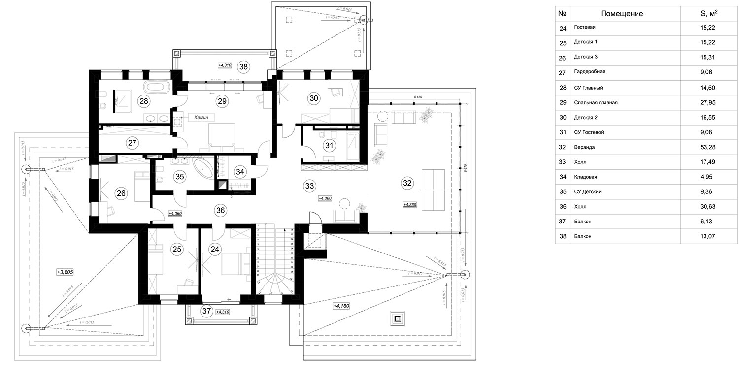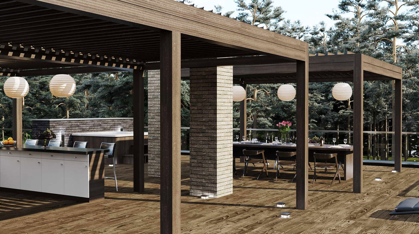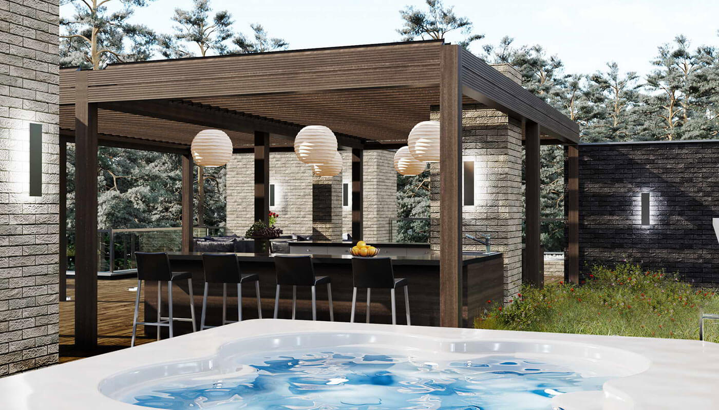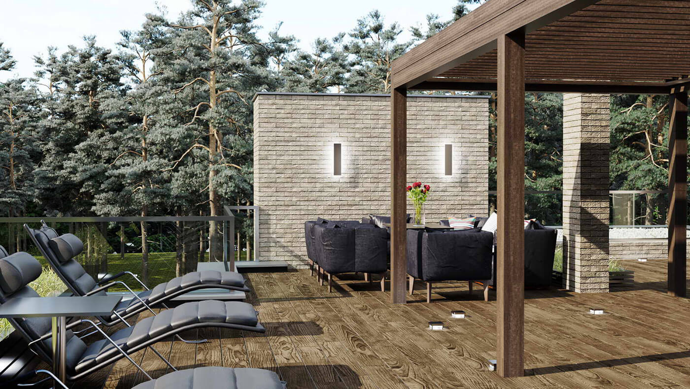 Современная архитектура дома подчеркнута качественными материалами. Фасады дома выполнены из клинкерного кирпича и дерева. Из больших панорамных окон открывается вид на природное окружение. В доме, помимо пяти жилых комнат предусмотрен гараж на 2 машины и спортзал. Лифт с первого этажа поднимается до уровня кровли, где через тамбур предусмотрен выход на улицу. На кровле размещены лежаки и барбекю для проведения расслабленного отдыха в кругу друзей.