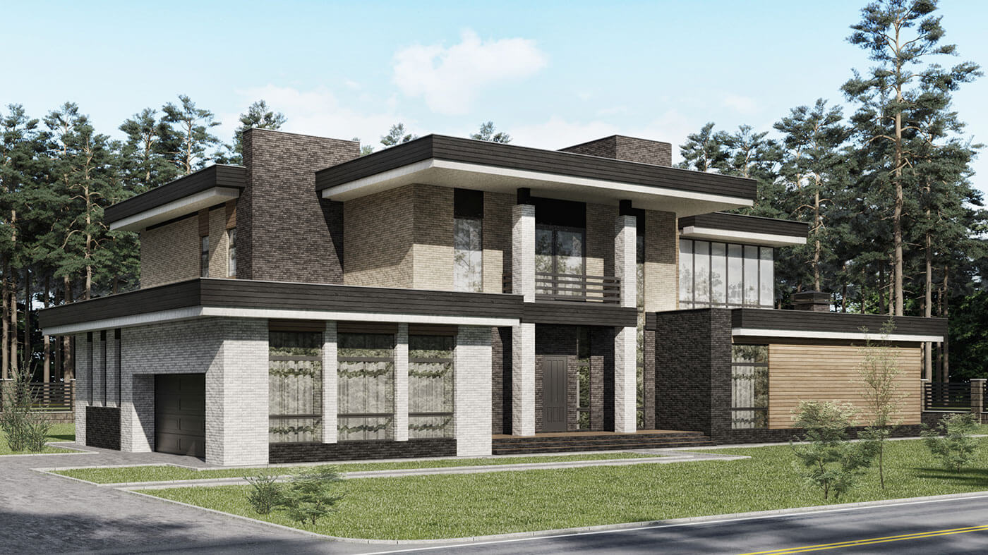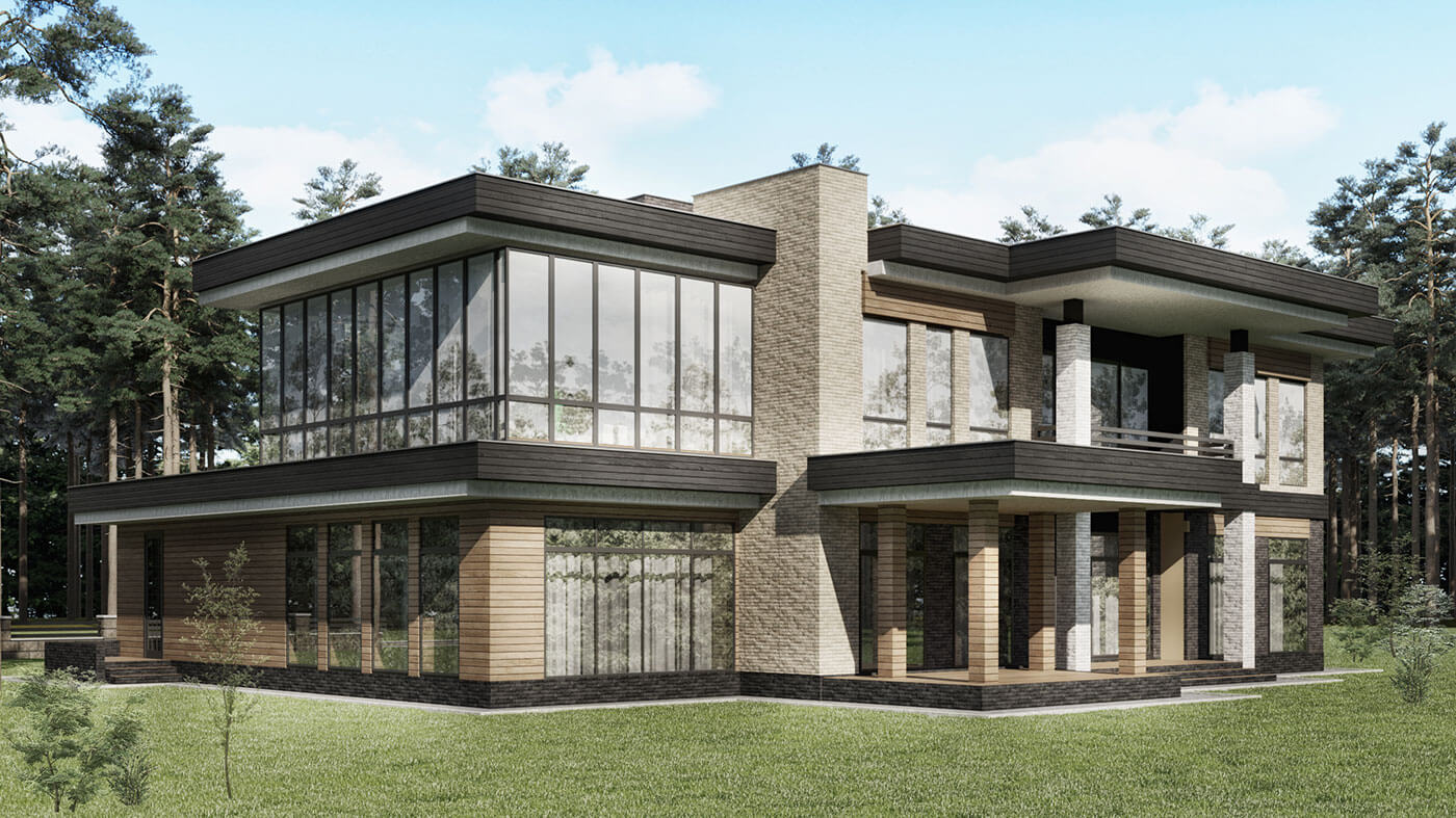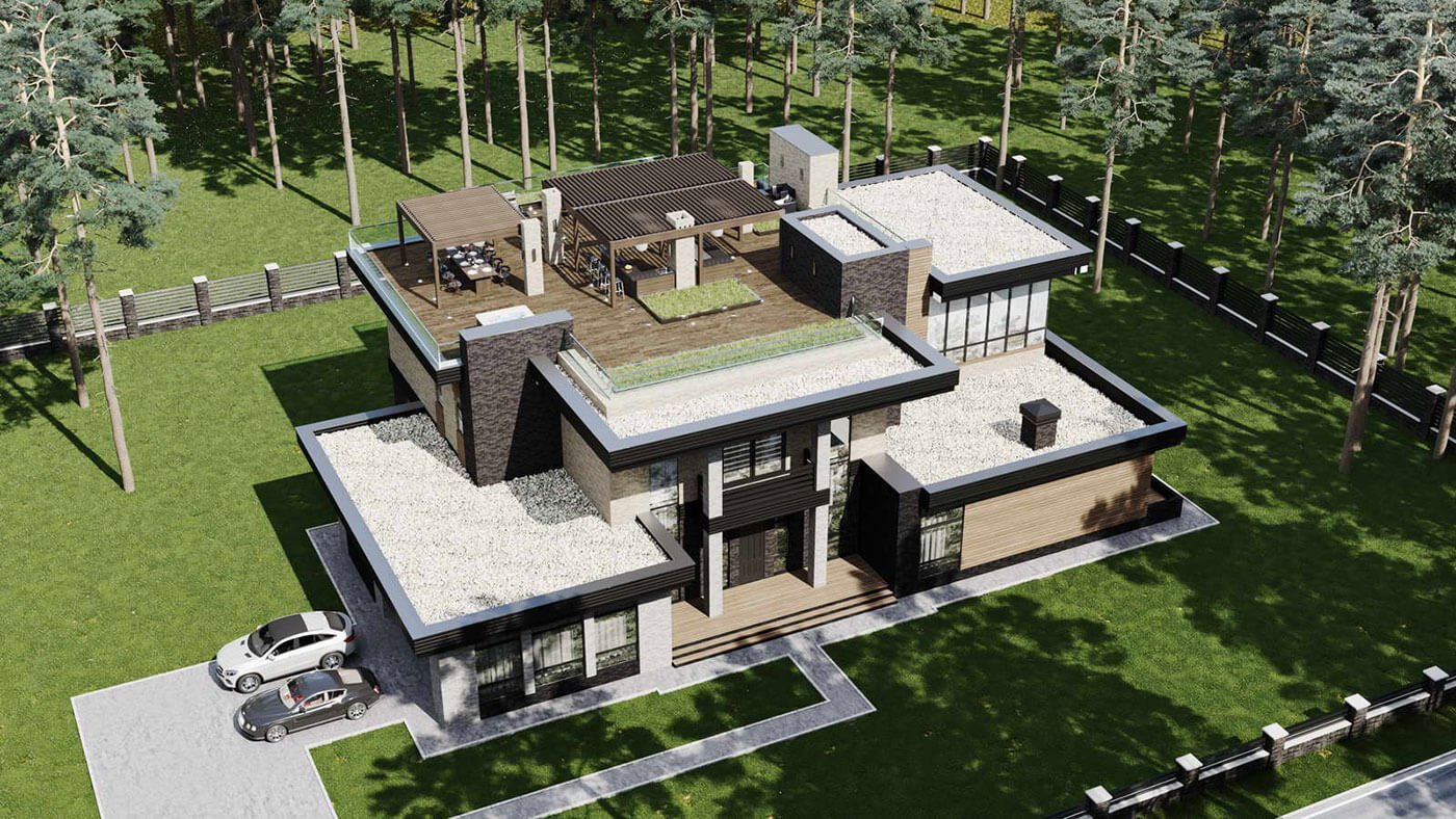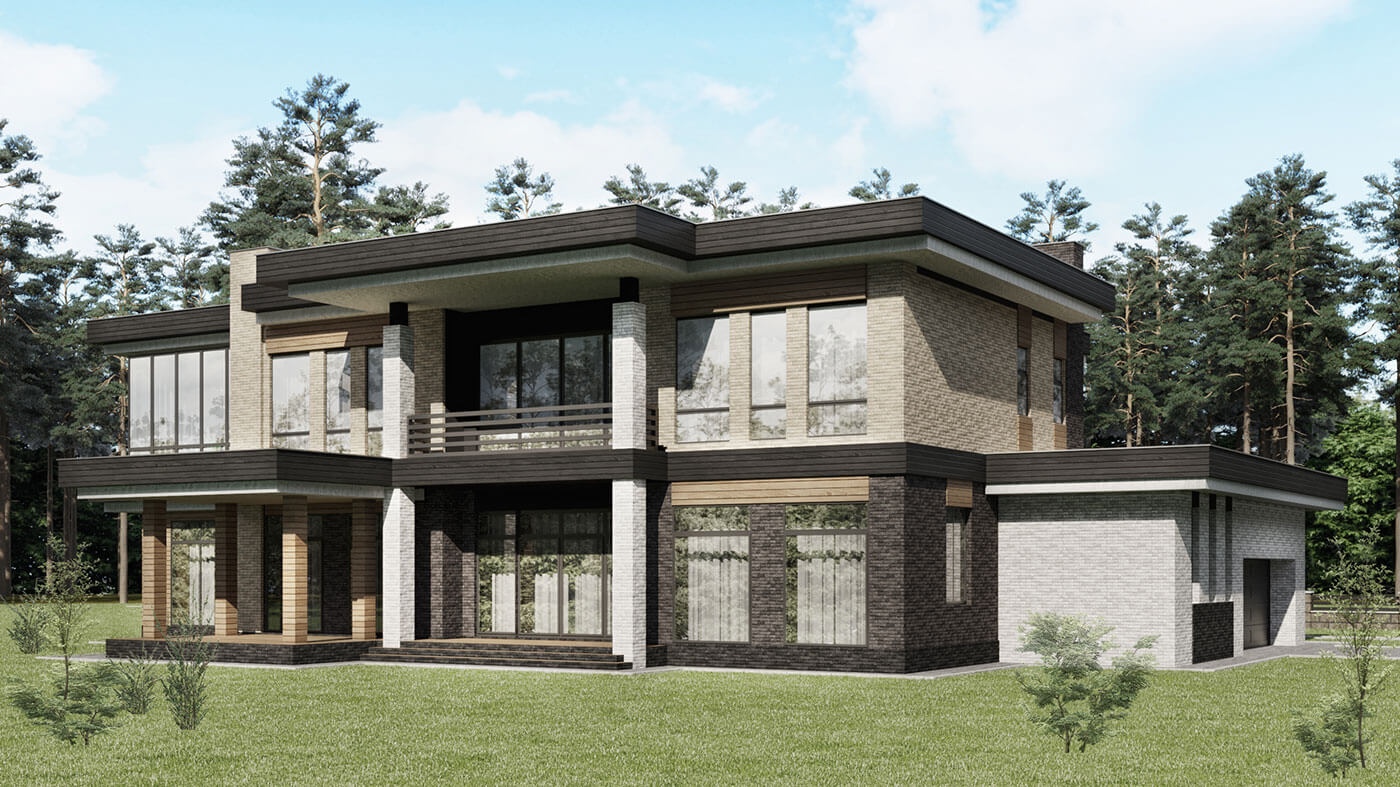 Дом 750 кв м спроектирован с плоской кровлей на участке вблизи лесного массива.