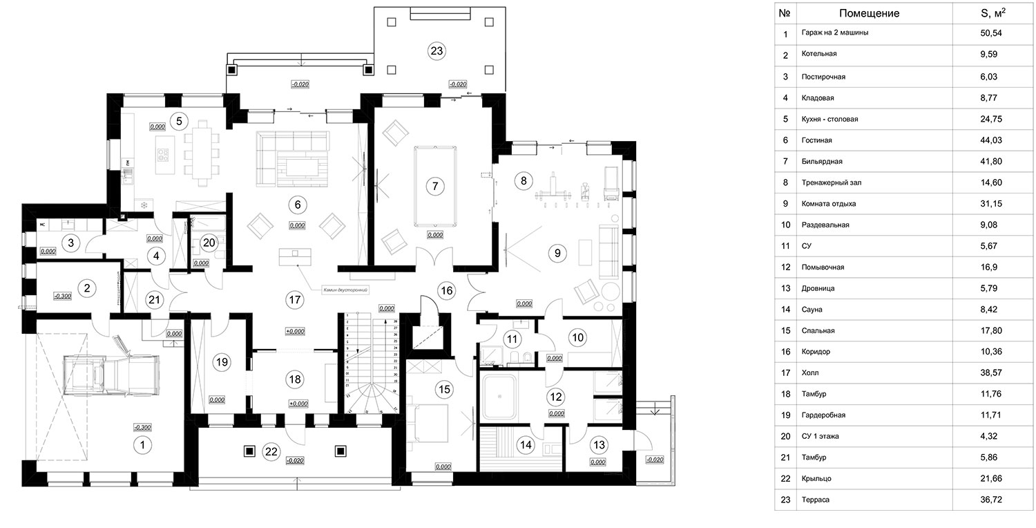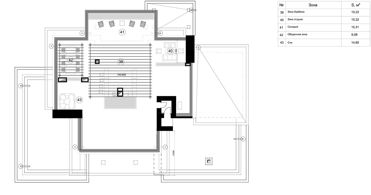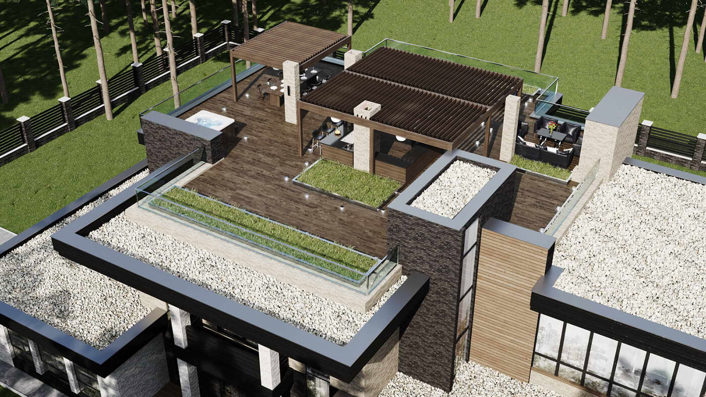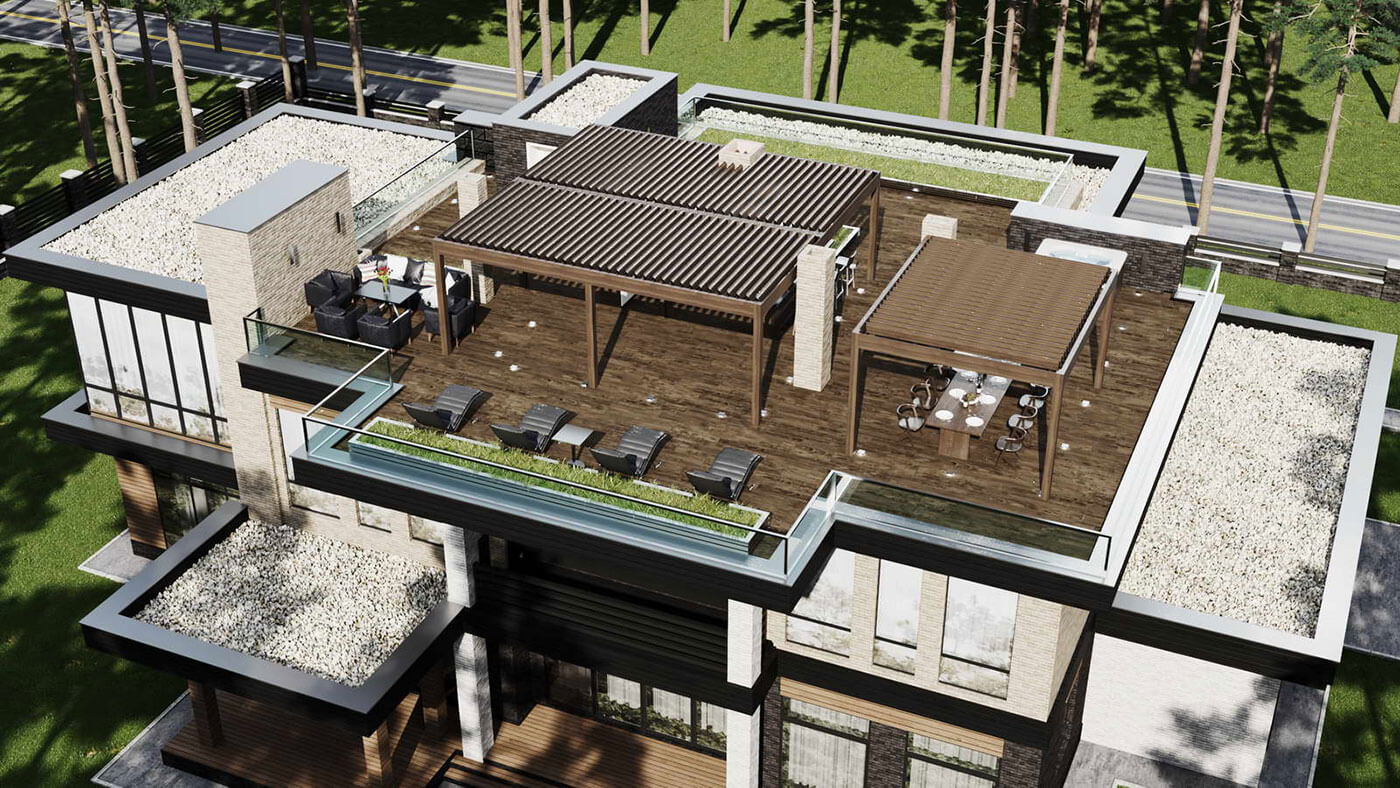 Дом 750 кв м спроектирован с плоской кровлей на участке вблизи лесного массива.