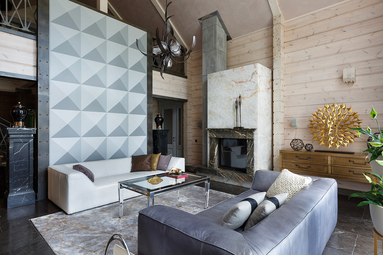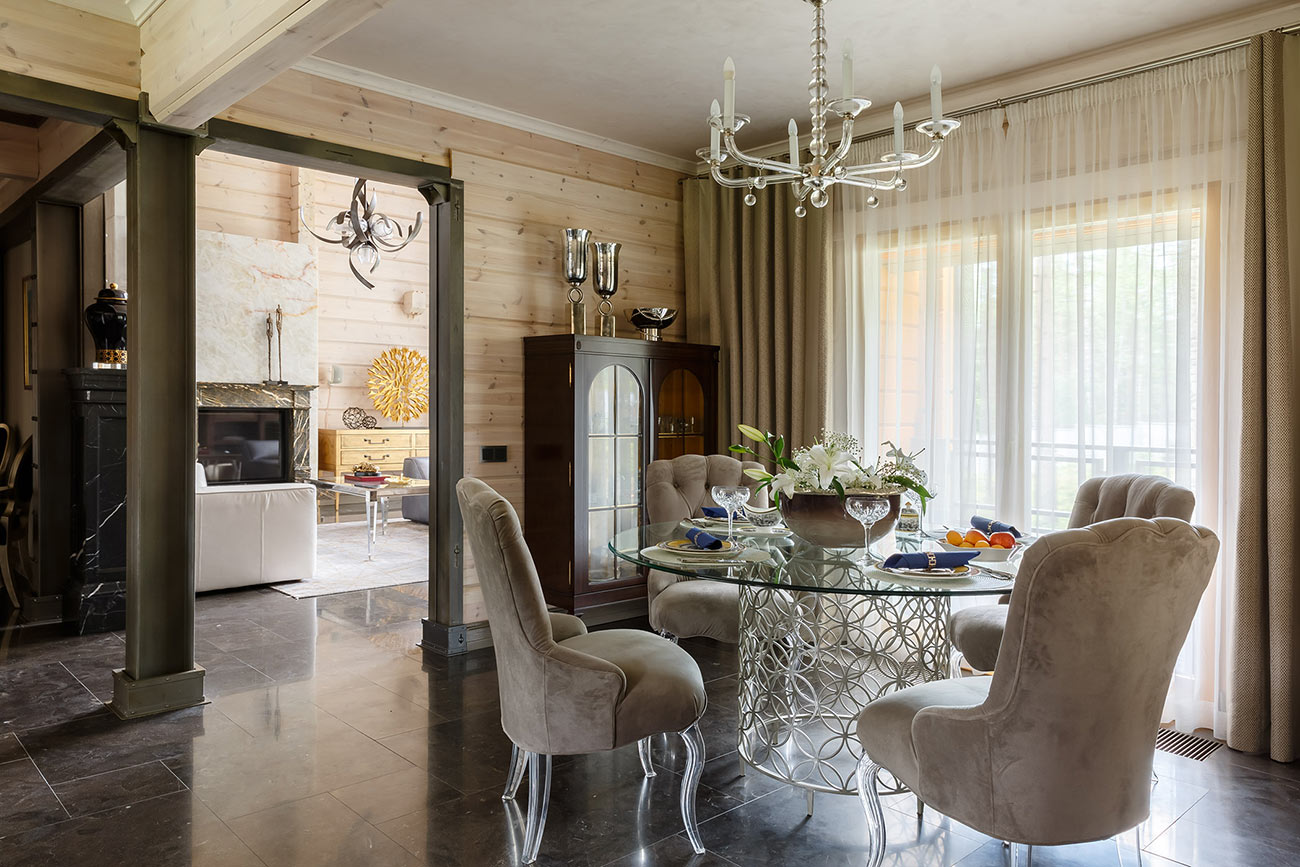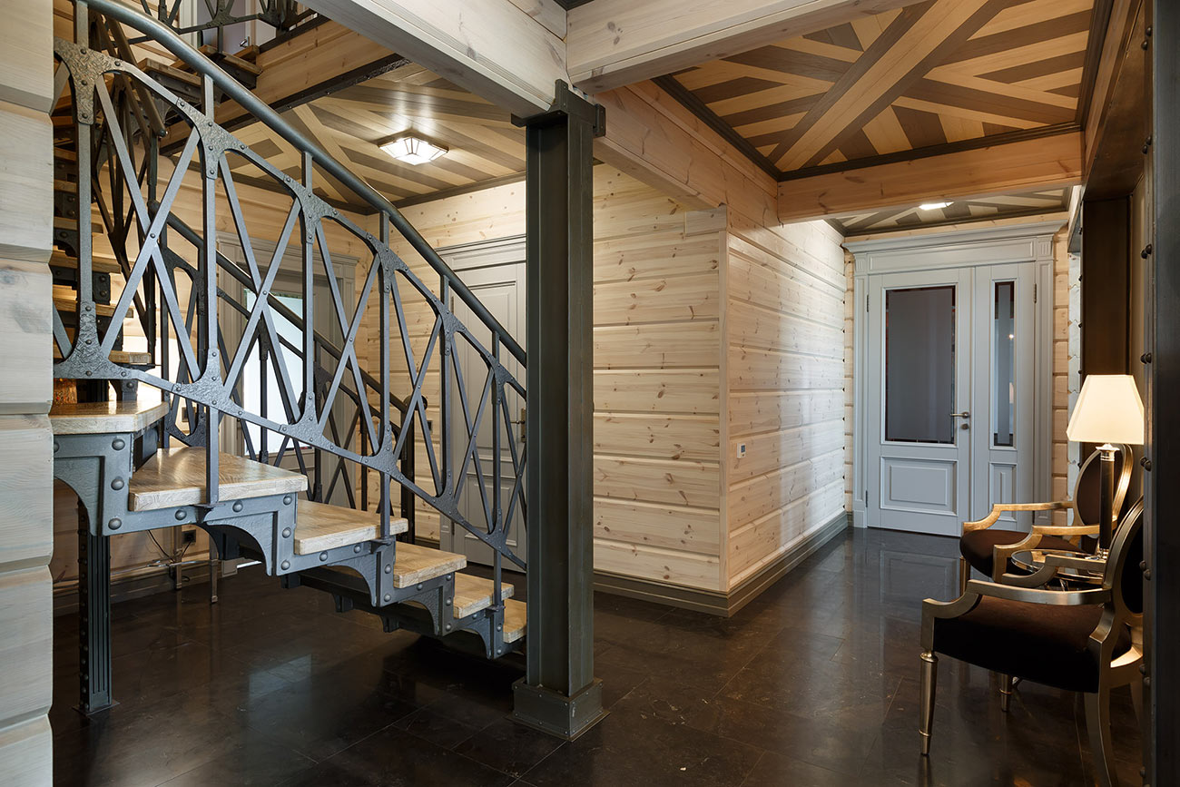 При работе над интерьером у дизайнера стояла задача уйти от стандартных решений, обычно применяемых при оформлении деревянного загородного дома. Были использованы натуральный камень, металл, кожа в обивке мебели и стекло. В результате сложился микст, сочетающий теплоту натурального дерева и брутальность стиля лофт с элементами, отсылающими к американской классике.