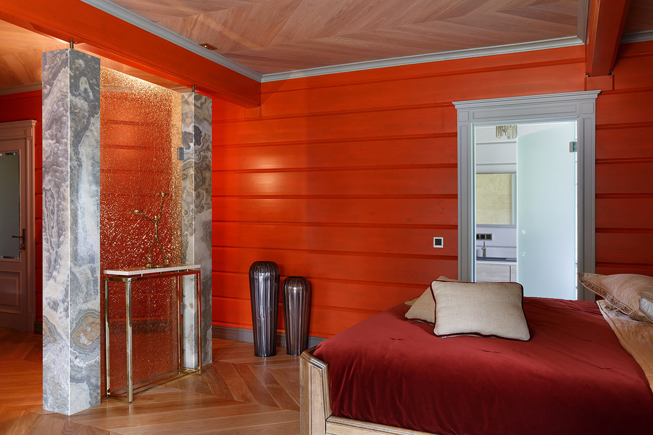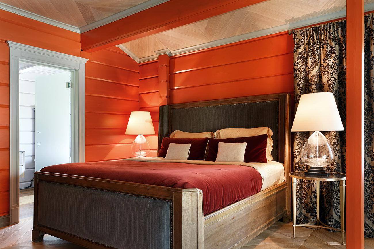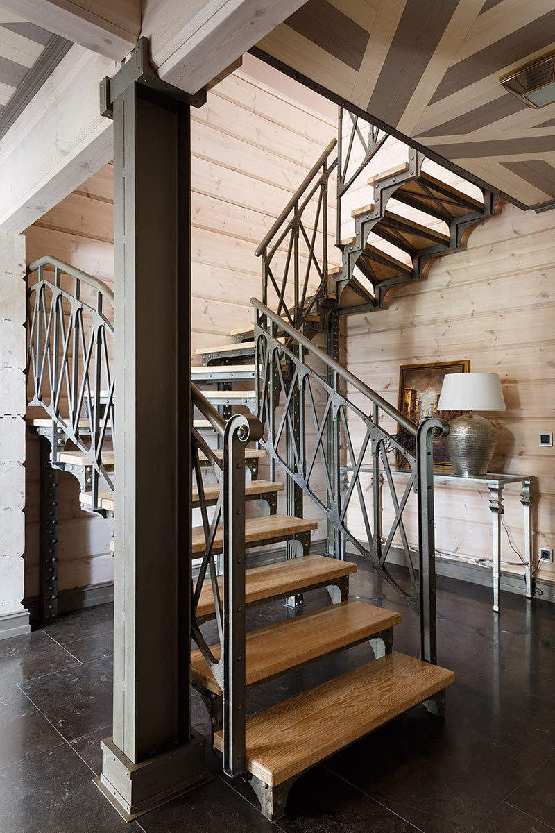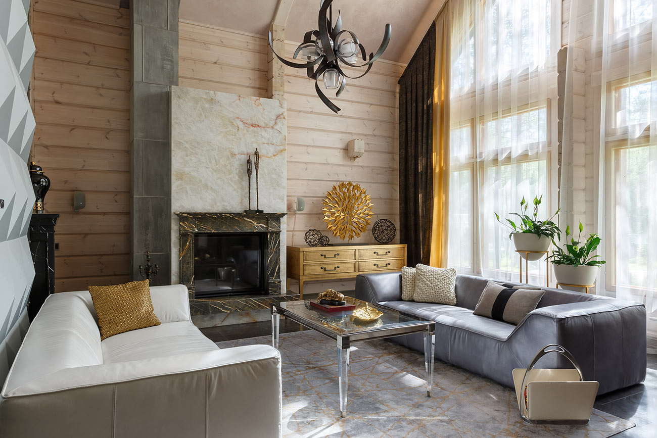 При работе над интерьером у дизайнера стояла задача уйти от стандартных решений, обычно применяемых при оформлении деревянного загородного дома. Были использованы натуральный камень, металл, кожа в обивке мебели и стекло. В результате сложился микст, сочетающий теплоту натурального дерева и брутальность стиля лофт с элементами, отсылающими к американской классике.