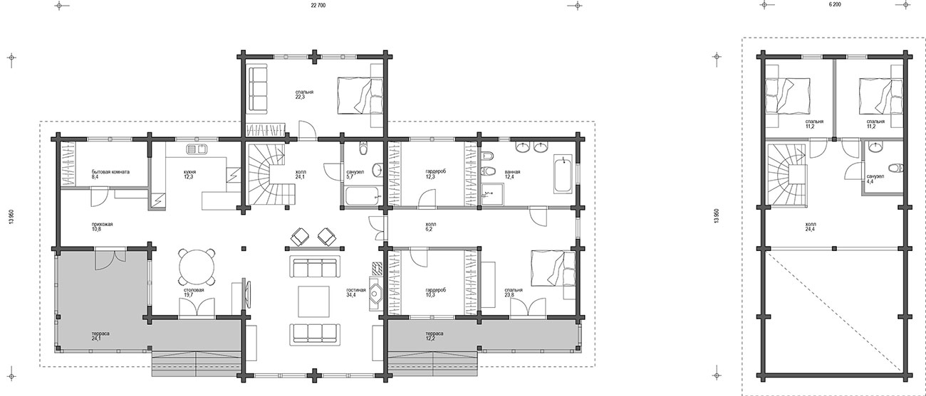 Необычность этого деревянного дома заключается в нестандартной компоновке функциональных зон: его первый этаж отведен не только под парадные, но и под жилые помещения. Здесь расположено несколько спален, гостиная, столовая и кухня.