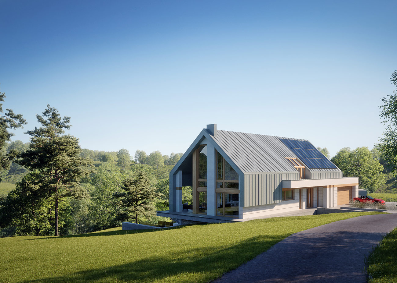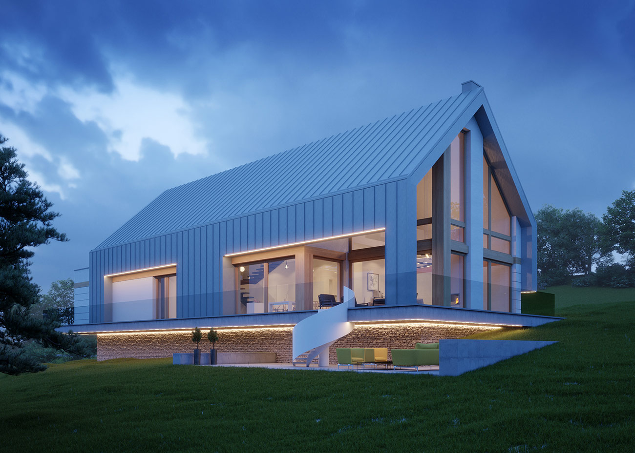 «Дом на склоне» спроектирован в стиле барнхаус совместно с прилегающим ландшафтом. Здание площадью 208 м² расположено на участке с большим уклоном. В пространственной ориентации объекта использованы все преимущества окружающего ландшафта. Из гостиной с панорамными окнами открывается захватывающий вид на поросшую лесом холмистую местность. Отсюда можно спуститься на открытую террасу по винтовой лестнице.