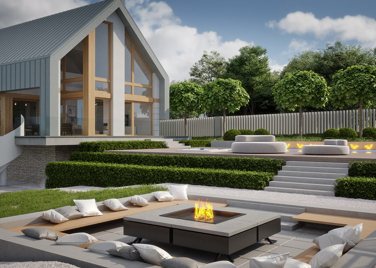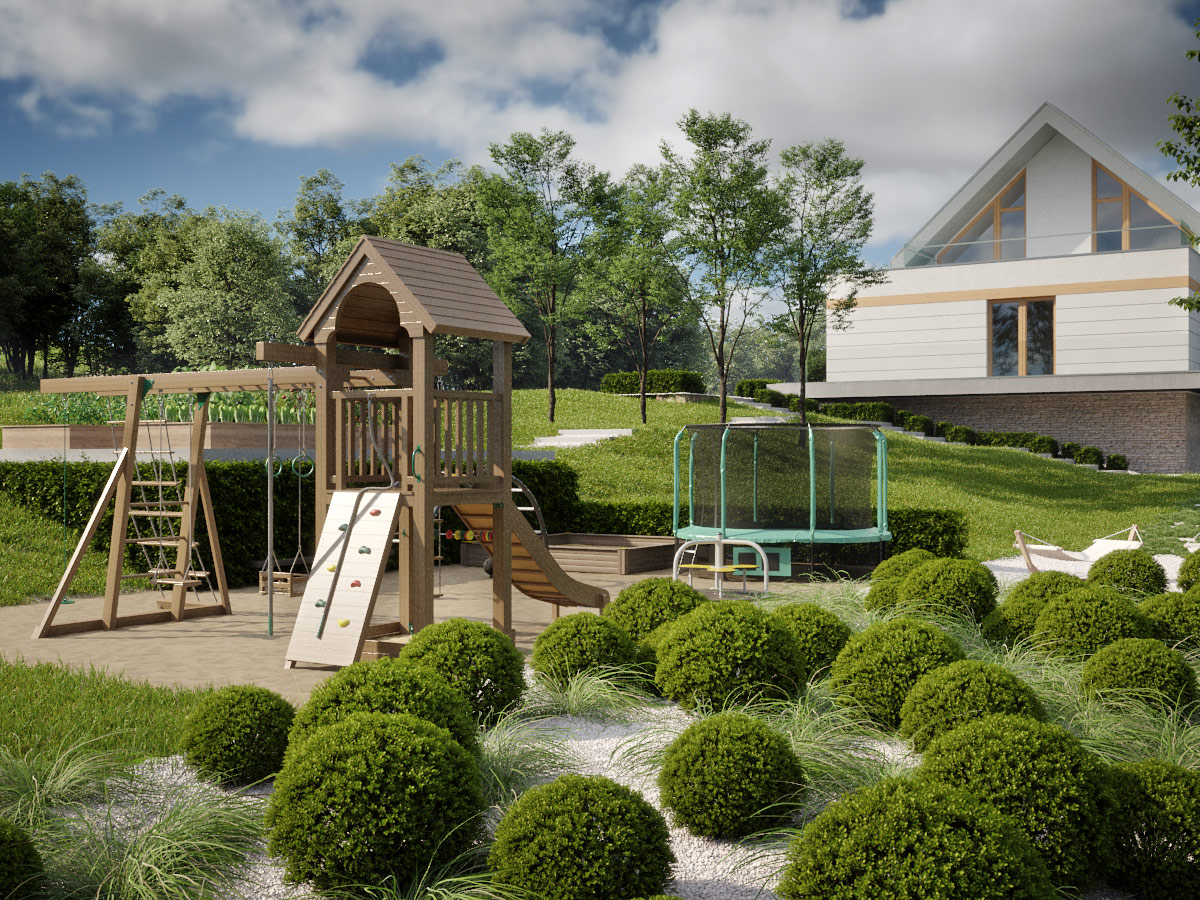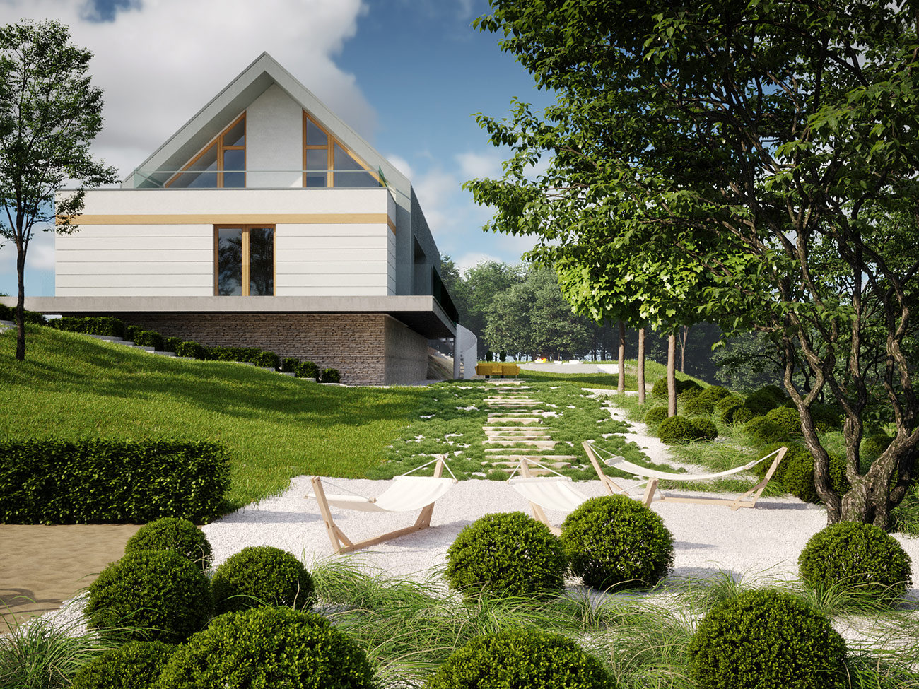 В непосредственной близости к дому находятся бассейн с джакузи, отсюда можно спуститься к уютной альтанке и погреться у очага. С другой стороны сада расположена большая детская площадка и подвесные гамаки. Проектировщик максимально эффективно использовал все пространство на сложном участке.