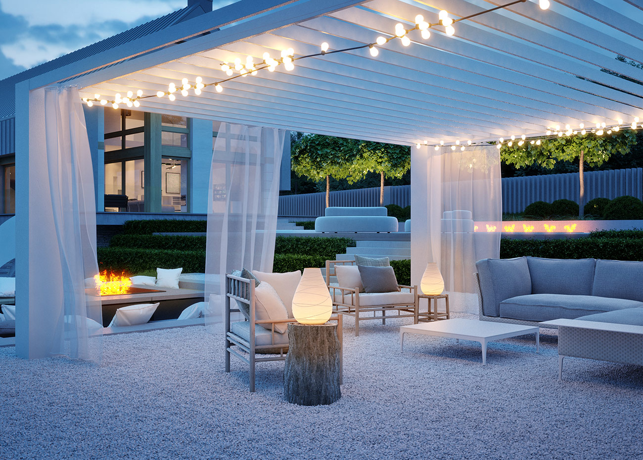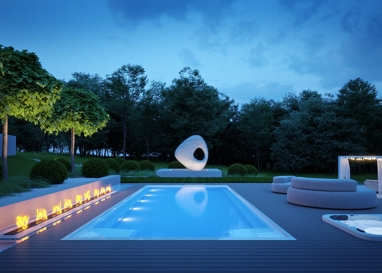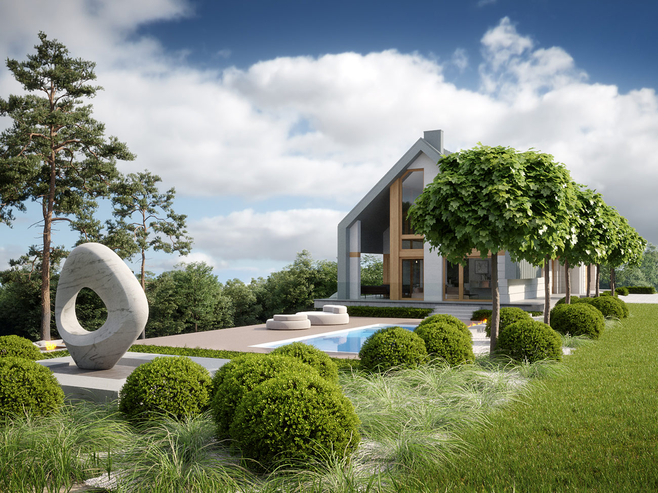 В непосредственной близости к дому находятся бассейн с джакузи, отсюда можно спуститься к уютной альтанке и погреться у очага. С другой стороны сада расположена большая детская площадка и подвесные гамаки. Проектировщик максимально эффективно использовал все пространство на сложном участке.