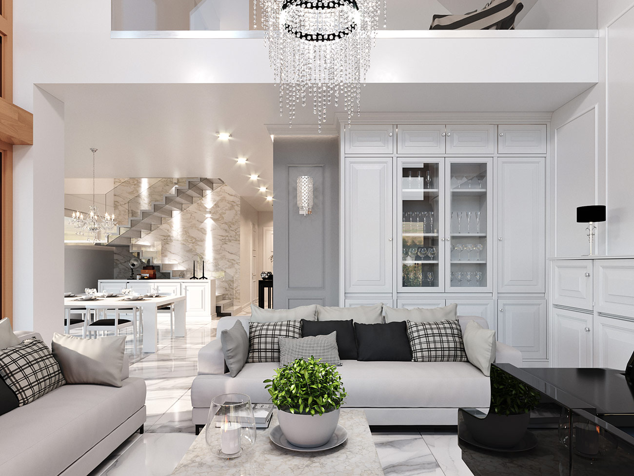 На первом уровне дома устроены общие помещения. Просторная гостиная объединена со столовой и кухней. Помещение для готовки зонировано и соединено напрямую с кладовой. Здесь же находится комната для гостей. В противоположном крыле спроектирован гараж и подсобные помещения.