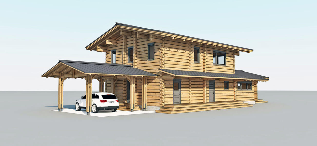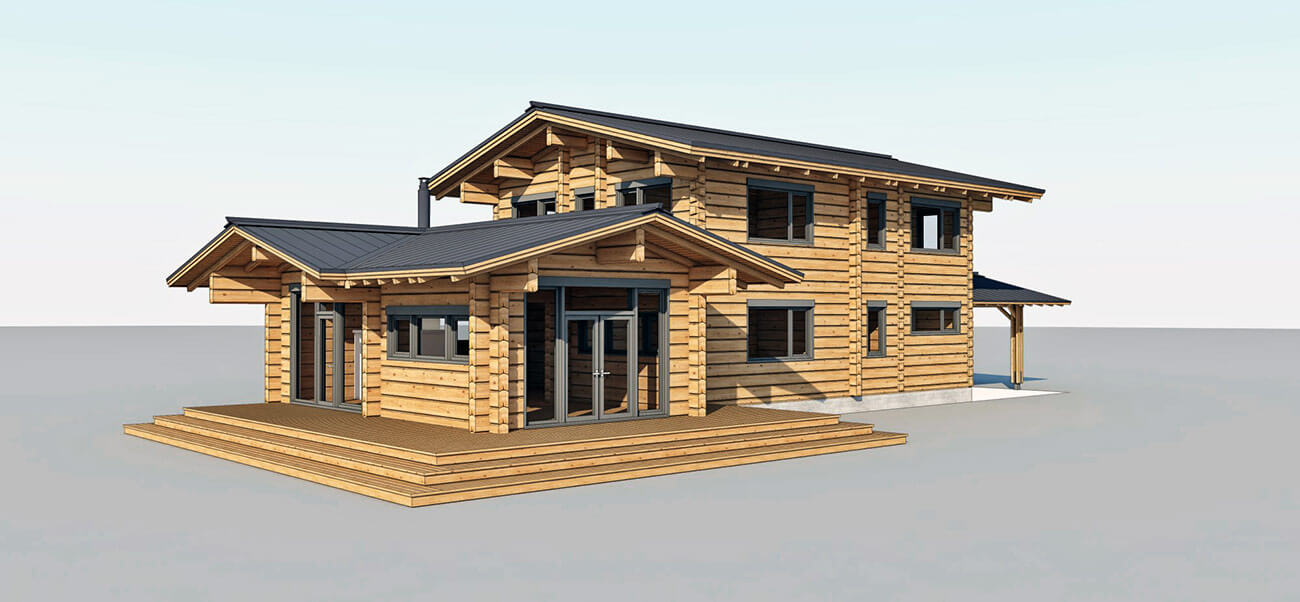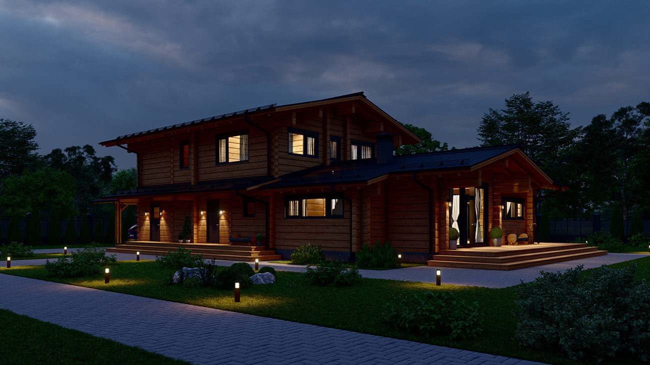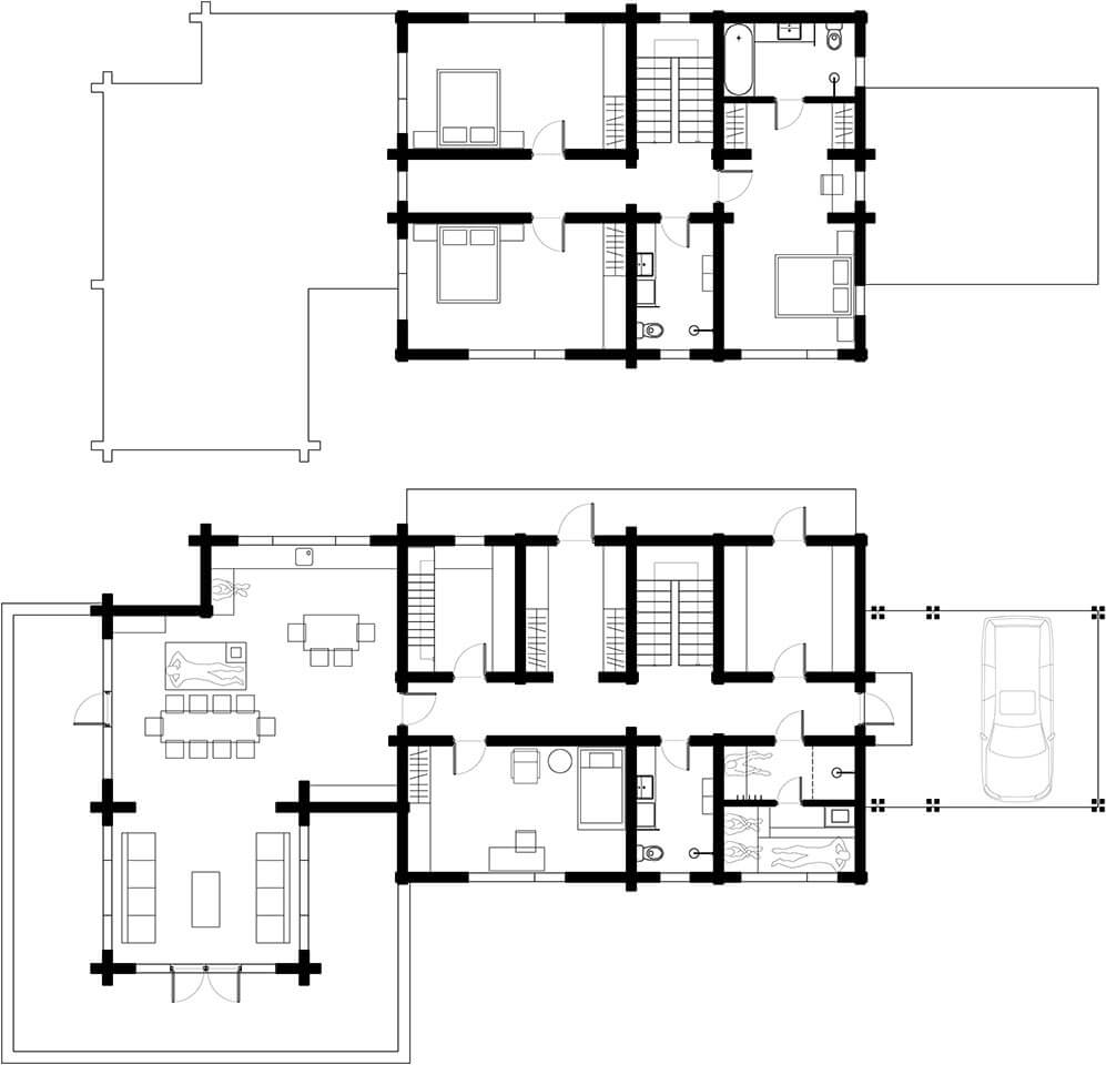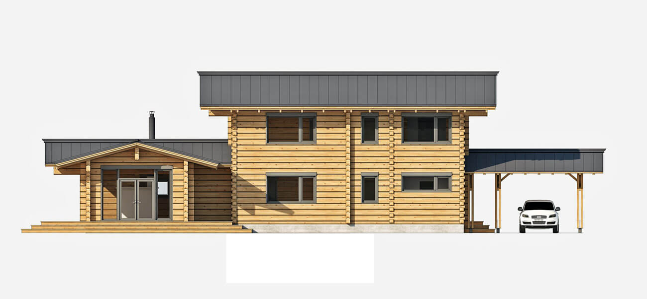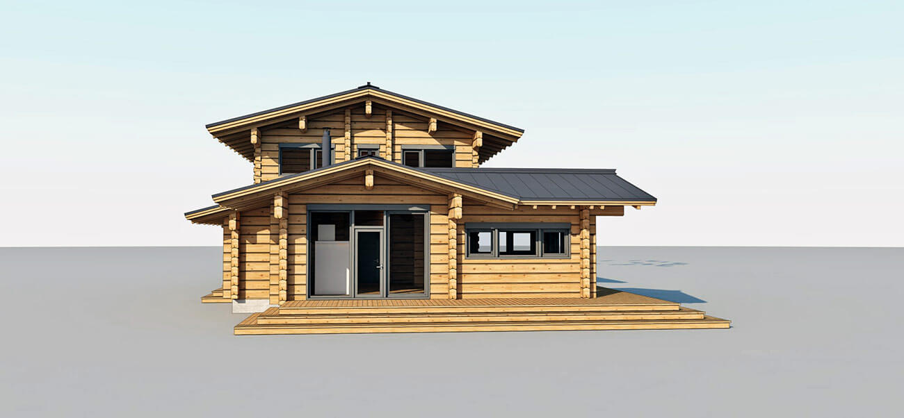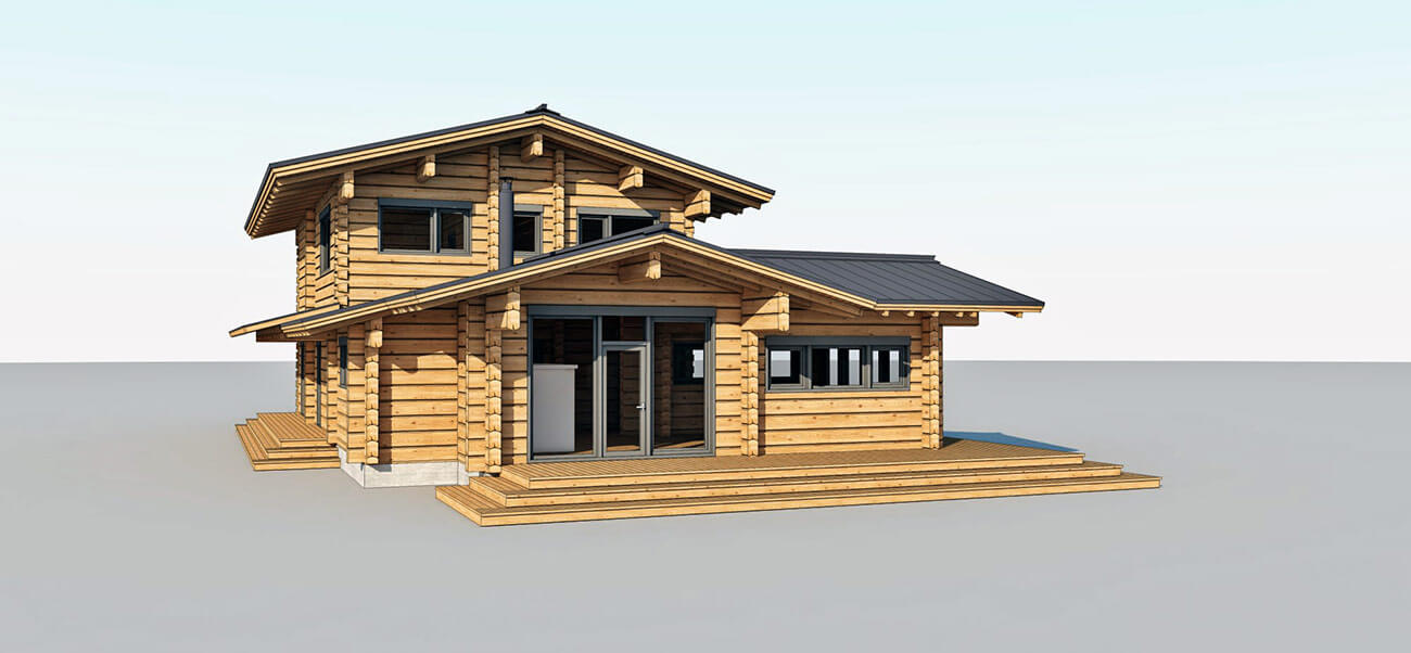 Дом двухэтажный, состоит из двух блоков: одноэтажная часть - общественная зона, кухня, столовая, русская печь, два выхода на открытую двустроннюю палубу;