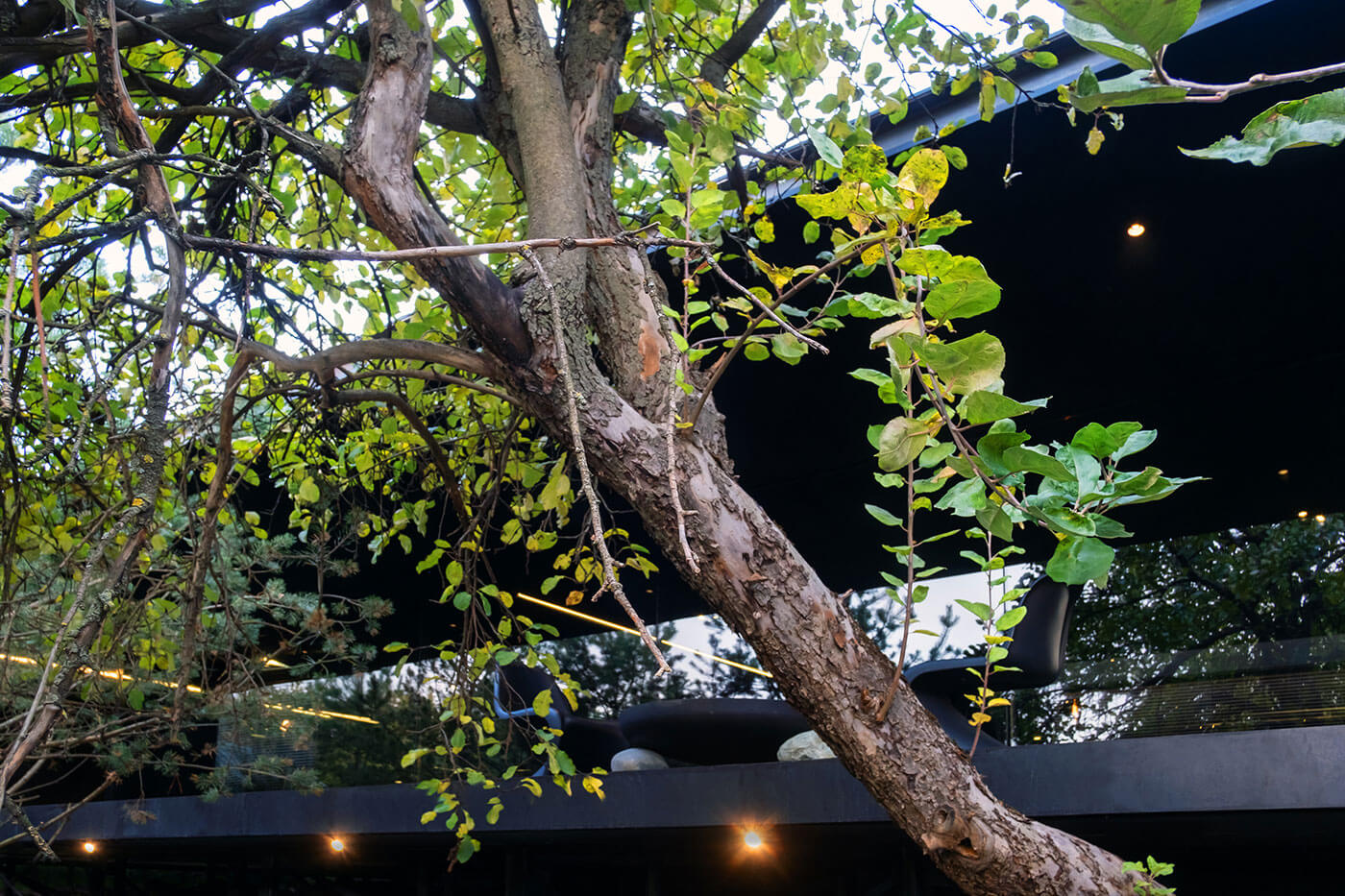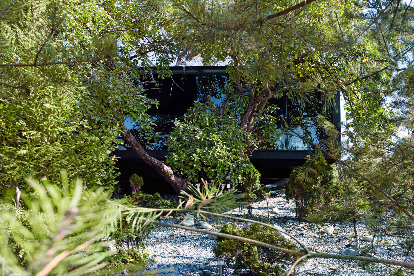 Генплан — линейный, классическое каре. Во дворе — гостевой дом-кемпинг площадью 30 кв. м, образующий двор между основным домом и парковкой, накрытой со стеклянной кровлей. Гостевой дом засыпан каменным склоном, так решен перепад в 5 метров. Крупномеры хвойных деревьев обрамляют внутренний двор и двор с панорамным видом, можжевельники дополняют горный ландшафт.
