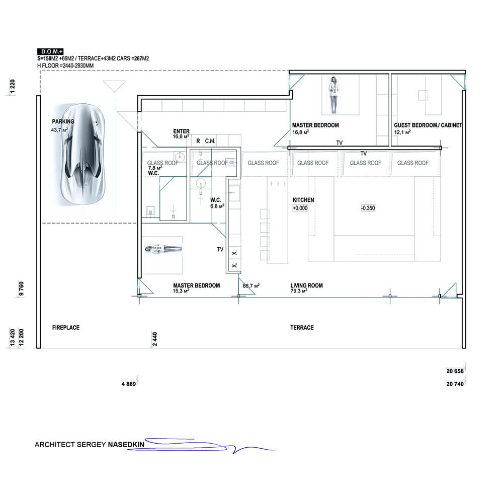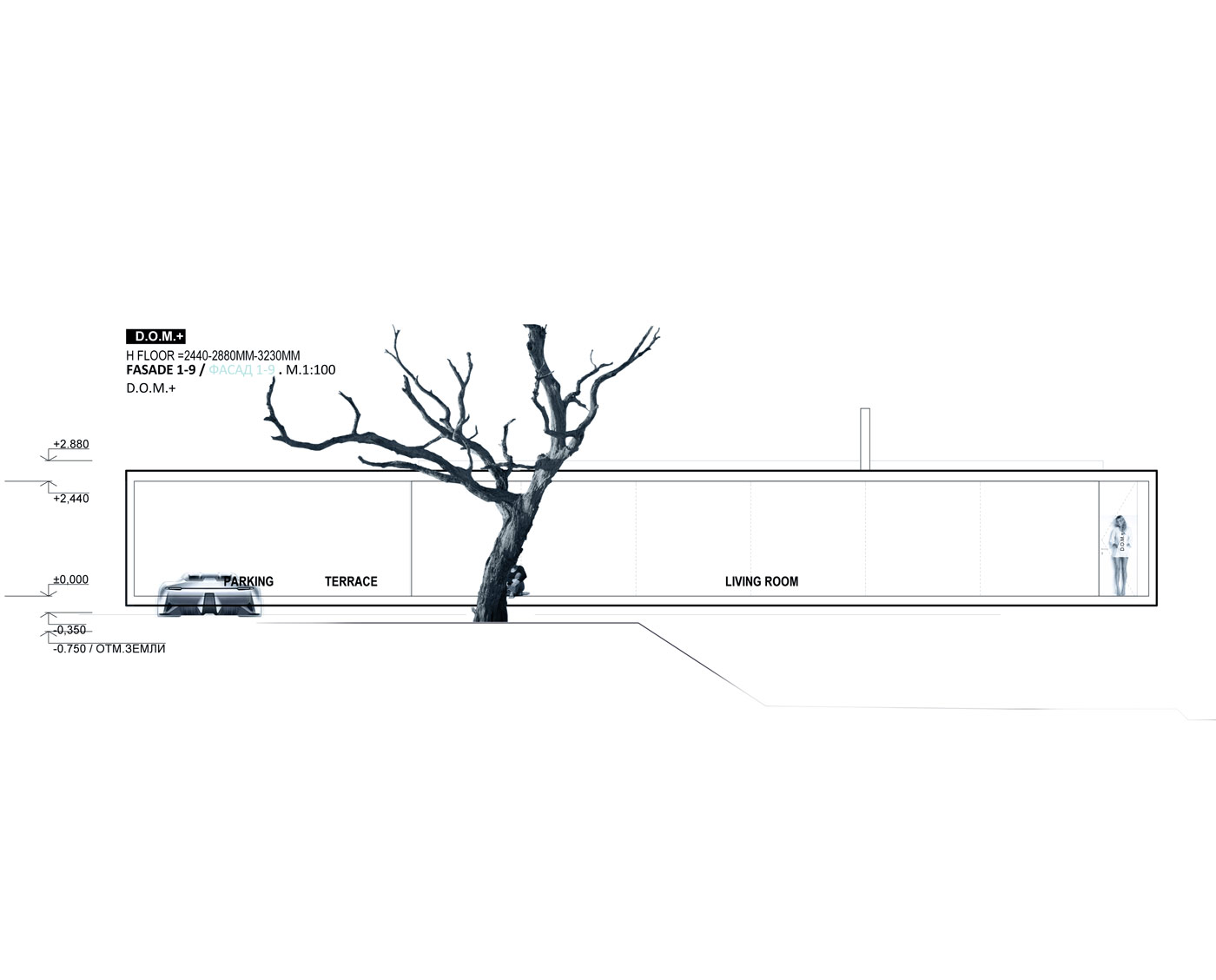 D.O.M.+ это инновационный образ жизни стоимостью $ 550 000. Окружённый природой, этот экологичный, современный и умный дом предназначен для круглогодичного проживания. Он монументален и в то же время лёгок, его интерьер уютный и теплый. Простое возведено в абсолют, а сложное закодировано в простом. Пространство здесь — фон для человека, сформированный при помощи камерных темных тонов и множеством света. Этот дом площадью 290 квадратных метров вписан в сложный рельеф с перепадом на 6 метров и возведен за три месяца. Здесь собраны самые передовые технологии со всего мира. Архитектура впечатляет монументальностью и транспарентностью пространств. Панорамное остекление, панорамная же кровля, двухкамерные мультистеклопакеты, каленое стекло 10 мм PhoenixGrey Stopsol Phoenix | AGC Glass установлены по технологии D.O.M.+ (6 стеклопакетов установлено в кровле и 6 на фасаде в линию, при этом они открывают доступ в разные помещения. D.O.M.+ это линейная планировка с открытой зоной гостиной, кухни и столовой, спроектированных в центре дома, инженерным ядром санузлов и ванных и тремя спальнями, расположенными по флангам. Мебель, полы, потолки и стены для резиденции изготовлены из клееных панелей березового шпона. Ванные комнаты оснащены панорамной кровлей, что обеспечивает дополнительную инсоляцию центральной части дома. D.O.M.+ третьего поколения — это не просто типовой проект, это дом для архитектора, Сергея Наседкина.