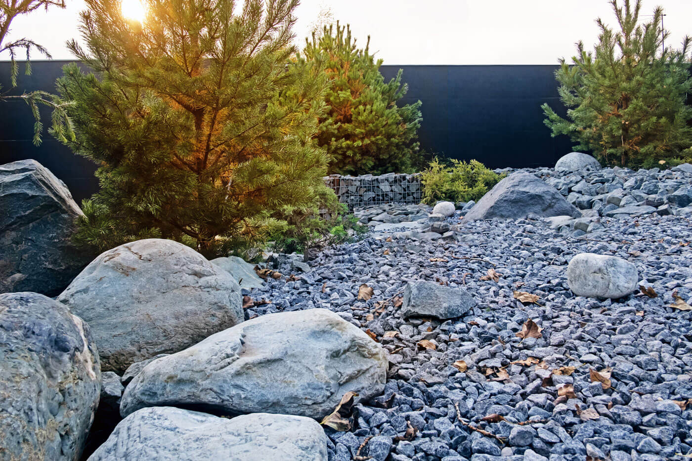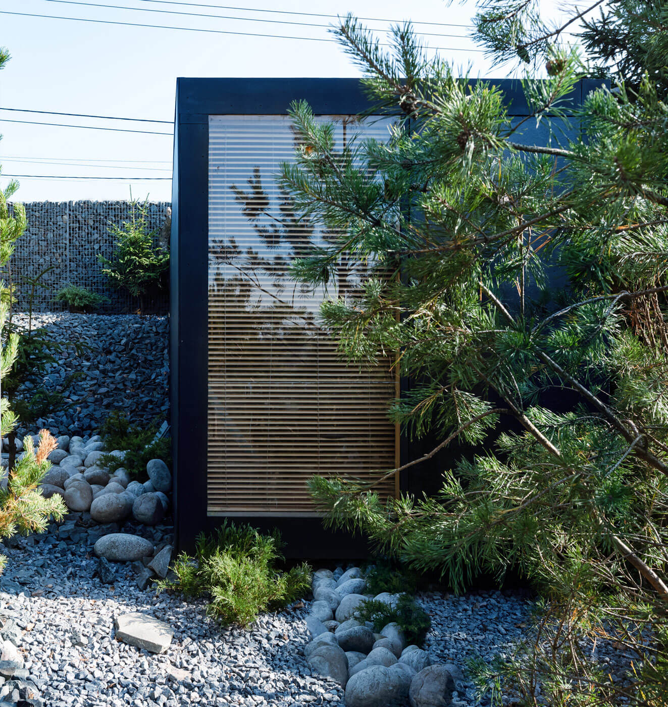 Один уровень с повышением высоты потолков в зоне панорамной кровли. Зона гостиной также утоплена ниже уровня основного пола. Пространство плавно перетекает в ландшафт, сложный горный рельеф, осыпанный темно серым гранитом Габро фракции 40-70, 70-250 и валунами 500-1200 кг, а завершает ландшафт забор из габионов. Камни в гостиной, душевых, ванной только усиливают связь внутреннего пространства и улицы. Камни расположены на Лэй Линиях Земли, ориентированы на север — это энергетическая связь, при которой парад планет из гостиной проходит в ванные и далее на участок. Комплексная система умного дома в проекте D.O.M.+ обеспечивает энергоэффективность и существенно снижает затраты на эксплуатацию дома.