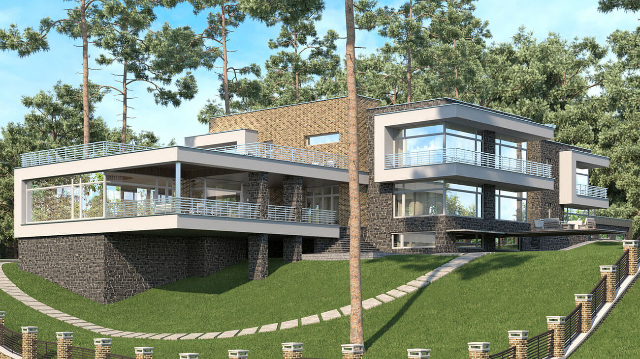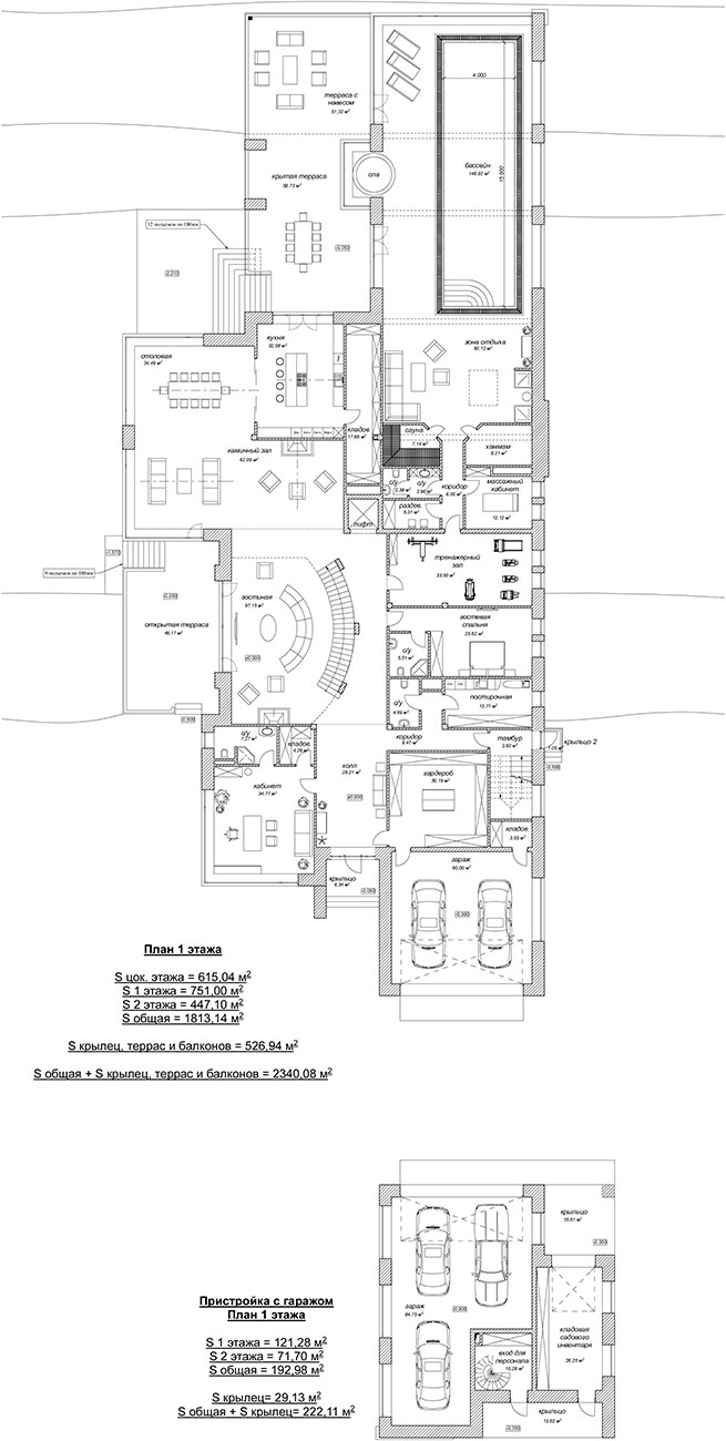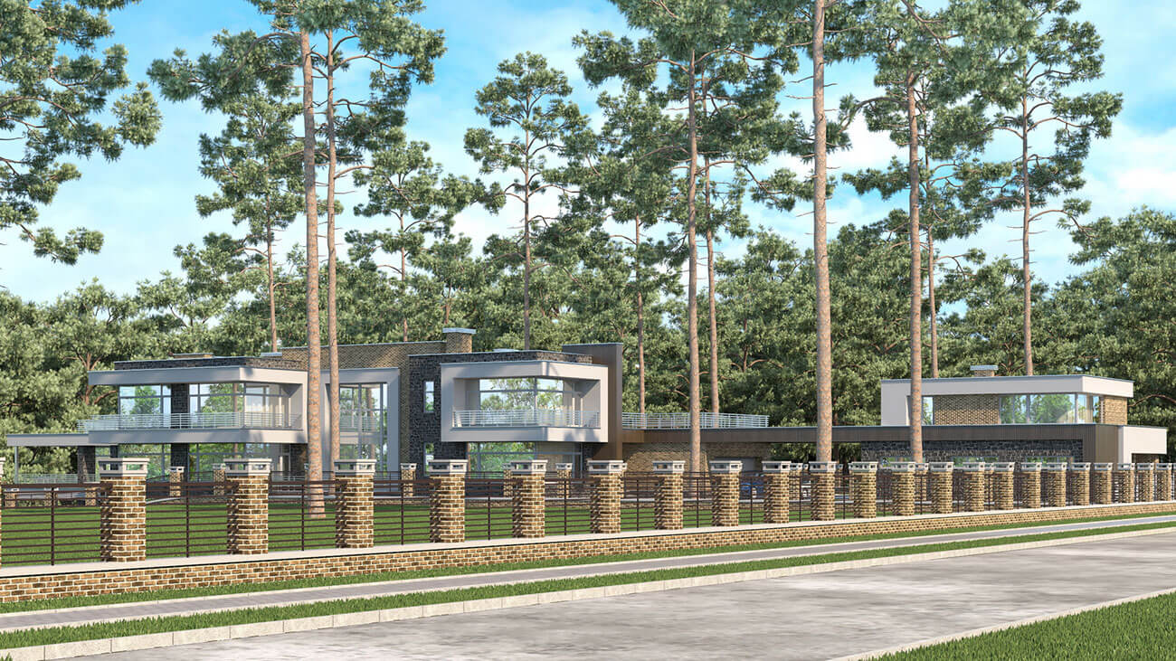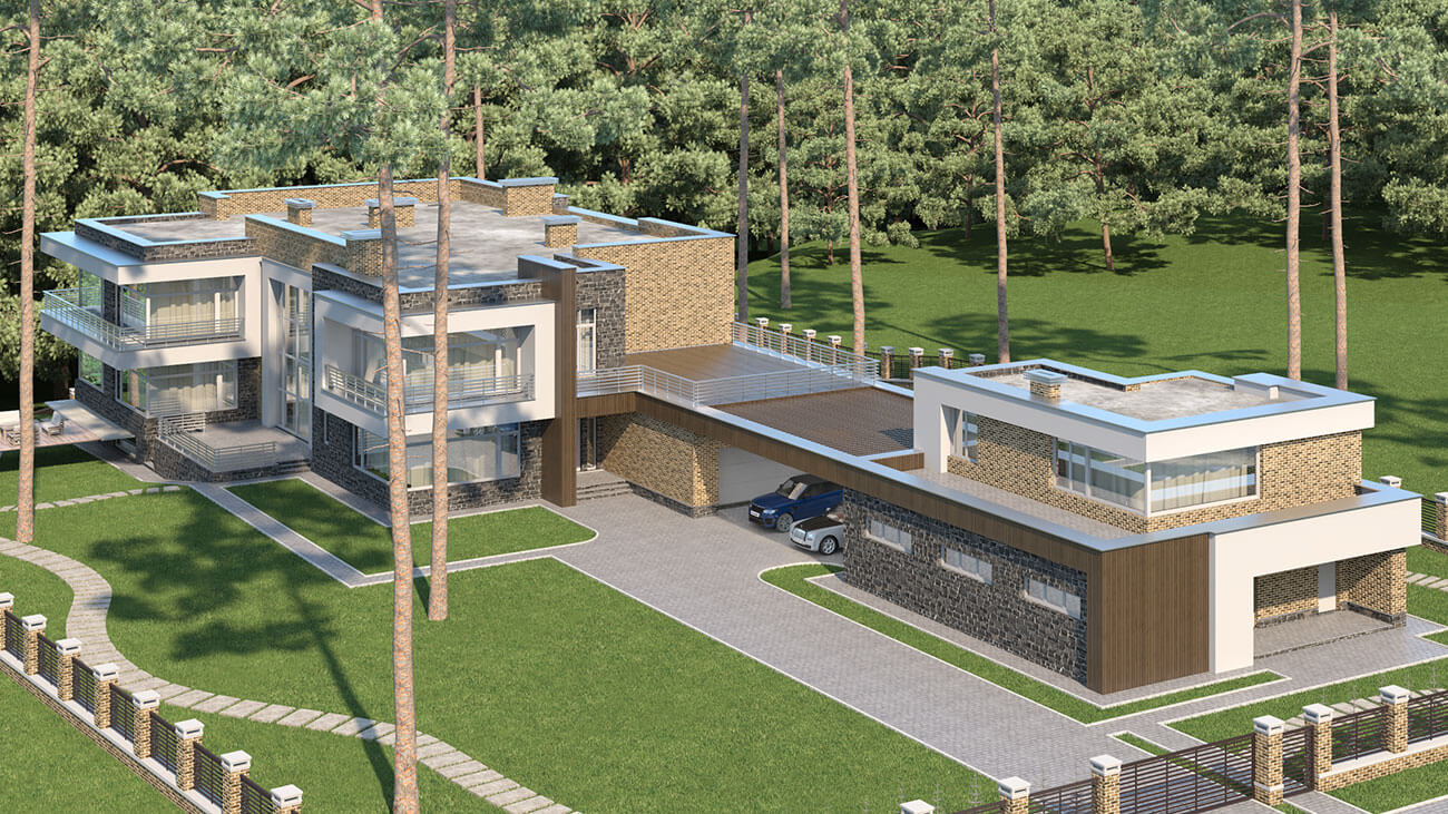 Вытянутая форма дома обусловлена формой участка и ориентацией по сторонам света. Ближе ко въезду на участок размещен гараж с хозблоком и помещениями персонала. Гараж общим навесом соединен с домом.