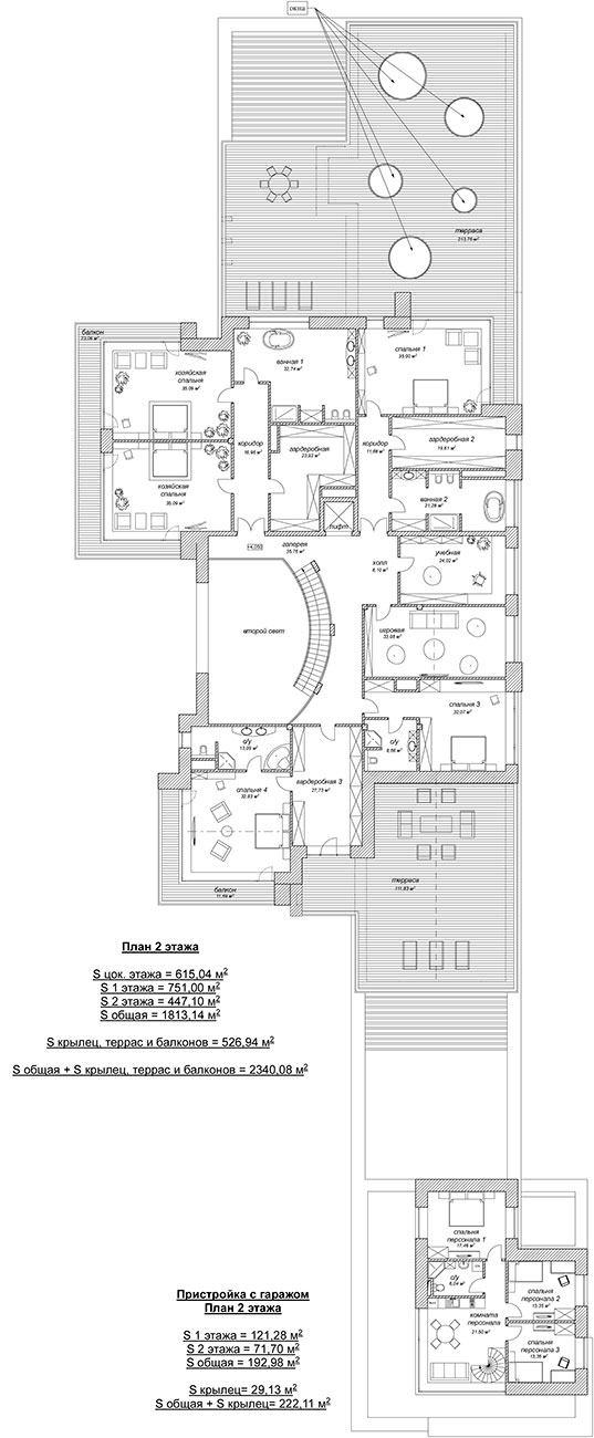 На втором этаже расположен хозяйский блок из двух спален, ванной и гардеробной, а также детские и гостевые спальни с выходами на эксплуатируемые террасы.