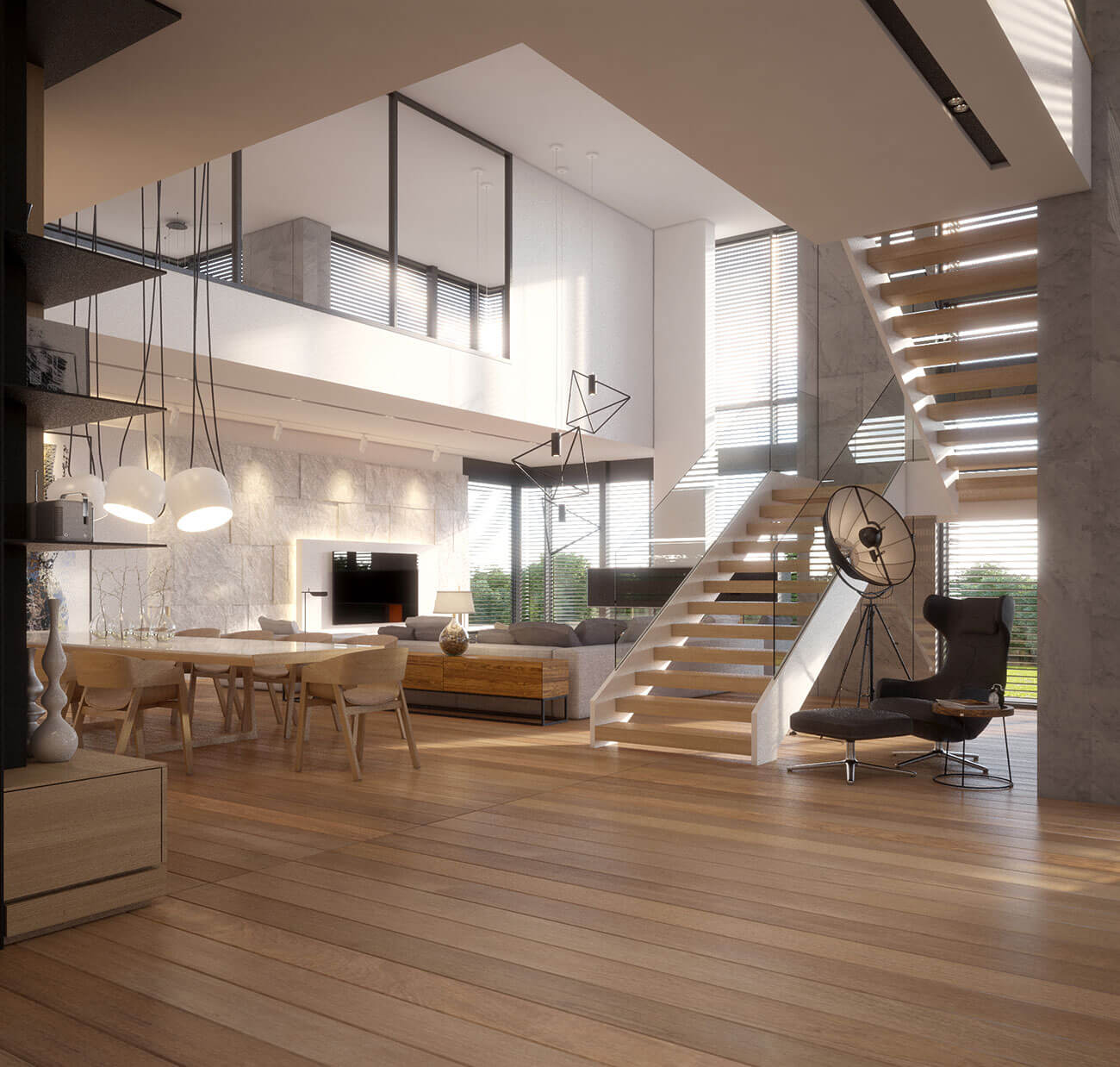 На первом этаже традиционно расположена дневная часть дома. Большая гостиная со столовой и кабинет находятся в левой части дома. Невозможно пройти мимо большой кухни, расположенной в центральной части, которая вместе с внутренним зеленым двориком создают «сердце» этого дома. В правой части здания расположены отдельные апартаменты для старшего поколения семьи. Зону отдыха составляют крытый бассейн, сауна и большая терраса с выходом на второй открытый бассейн.