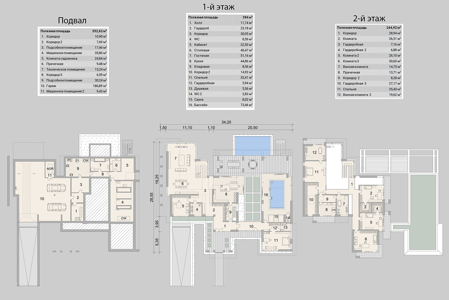 Под домом находится большой подземный гараж площадью 187 кв. м, технические и подсобные помещения.