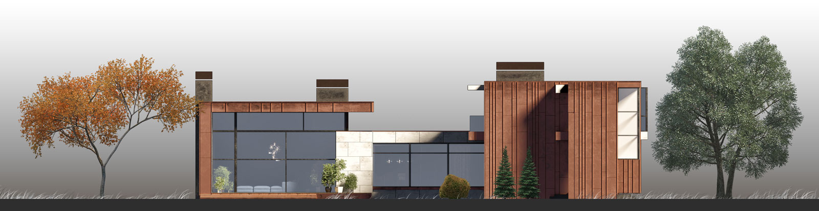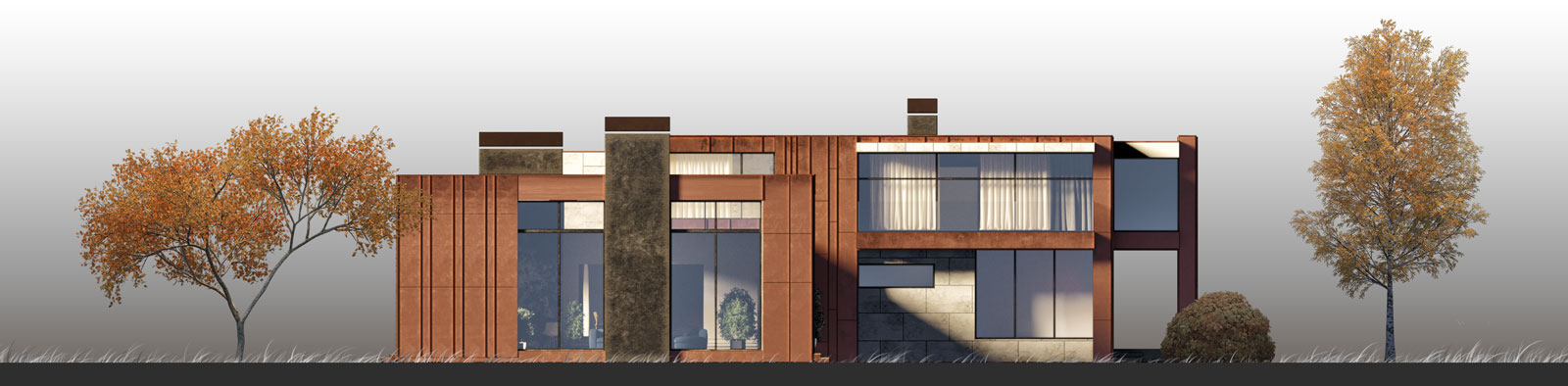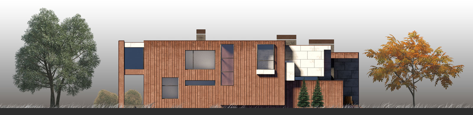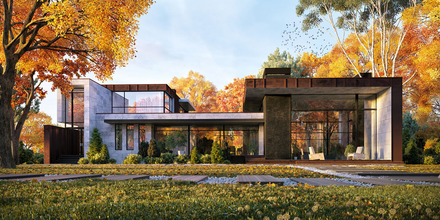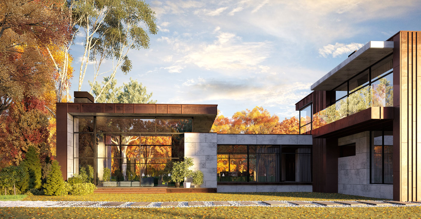 Проект загородного жилого дома. Геометрия здания проста и минималистична.