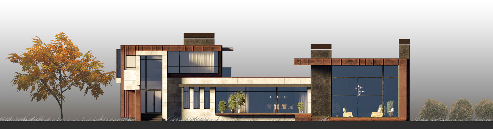 Планировка предусматривает деление внутреннего пространства на две части — общественную и приватную. Личные комнаты от объема гостиной отделяет столовая. Во всех помещениях панорамное остекление обеспечивает прекрасную инсоляцию. Наружная отделка представляет собой сочетание состаренной меди и крупноразмерных каменных панелей.