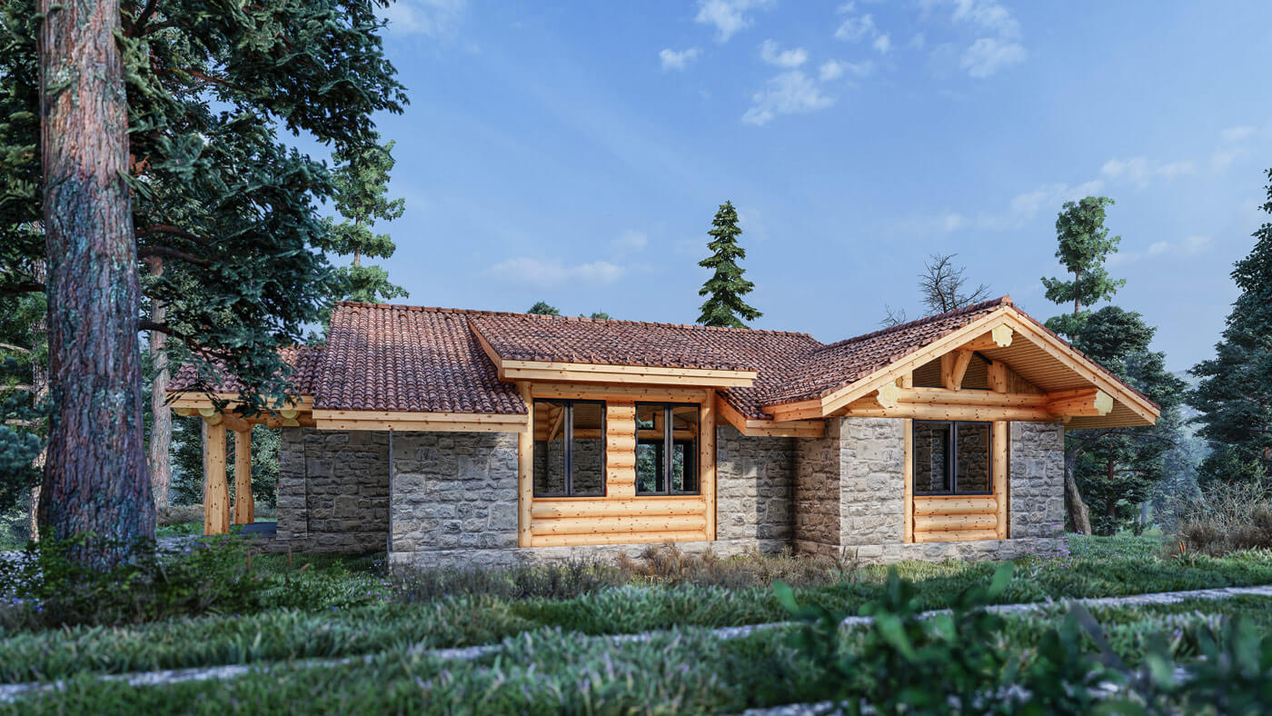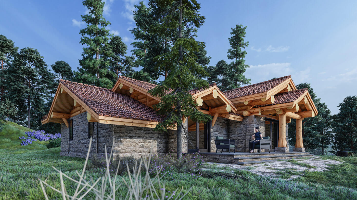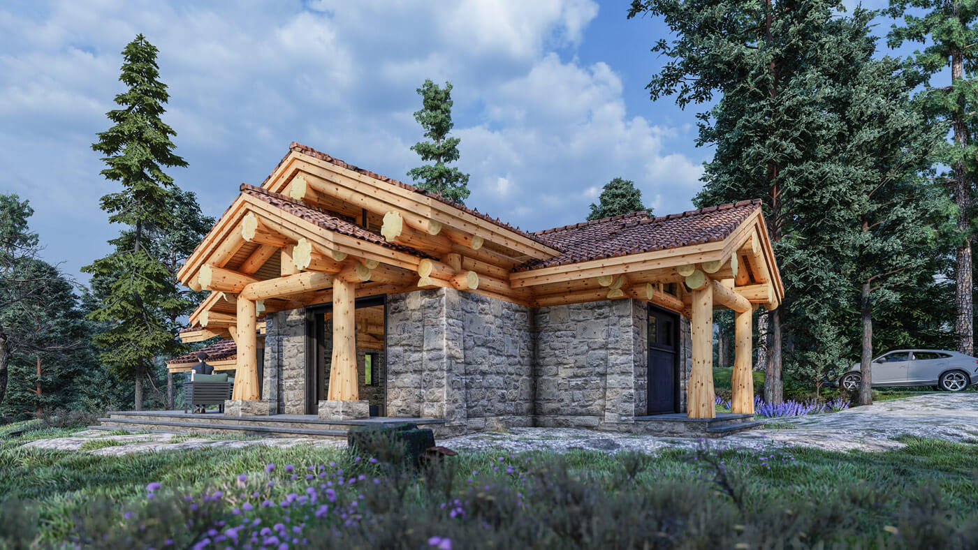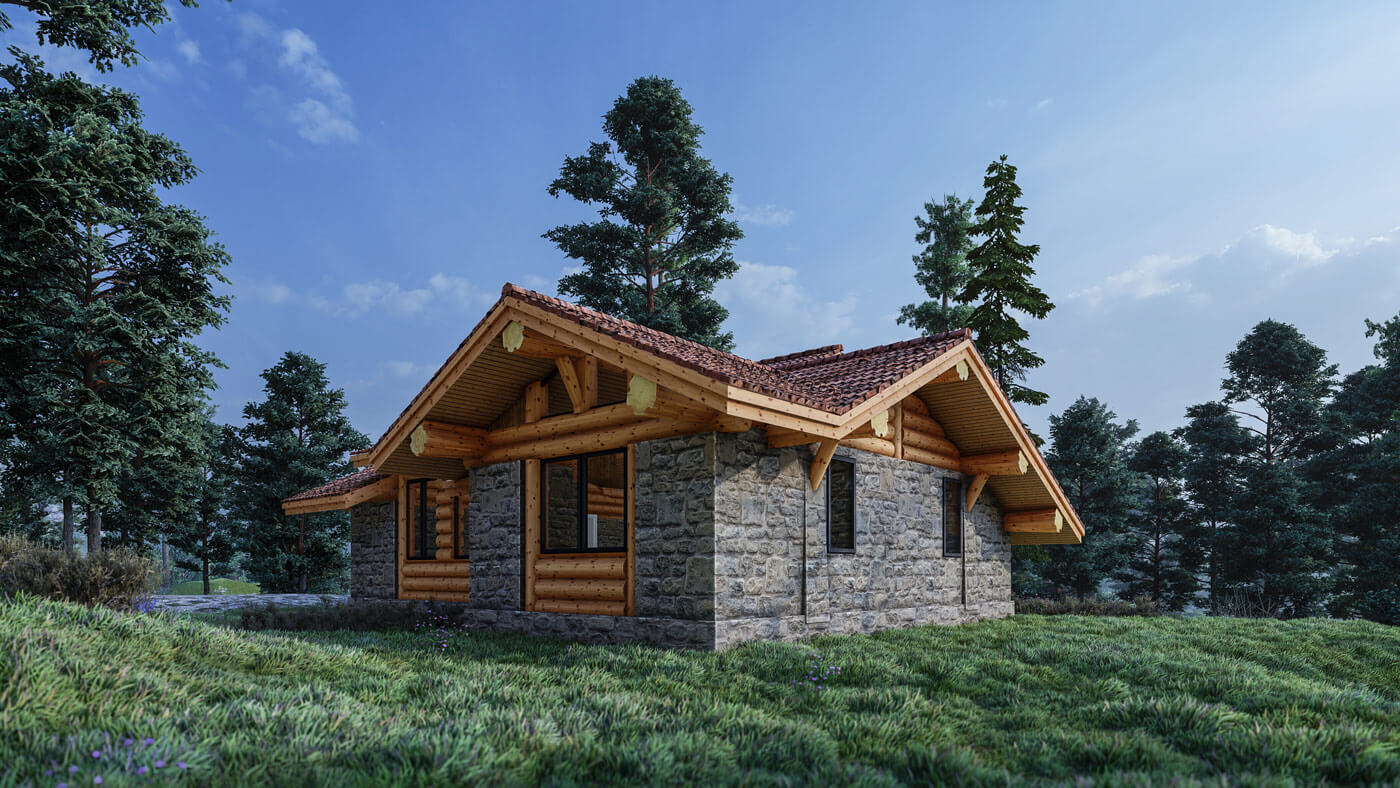 Дом вписан на участок с горным рельефом. Фундамент плита УШП, материал кровли плоская керамическая черепица. Площадь по полу около 100 квадратных метров. Столбы, мауэрлаты и коньки из кедровой сосны средним диаметром 30 см. В кухне-гостиной и в спальнях предполагается что эти деревянные конструкции часть интерьера.