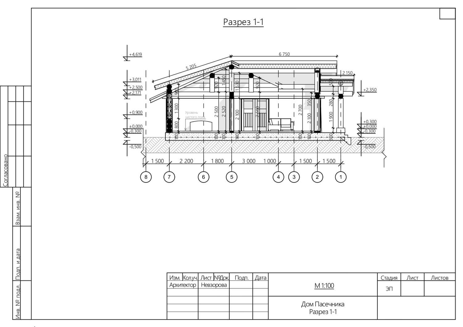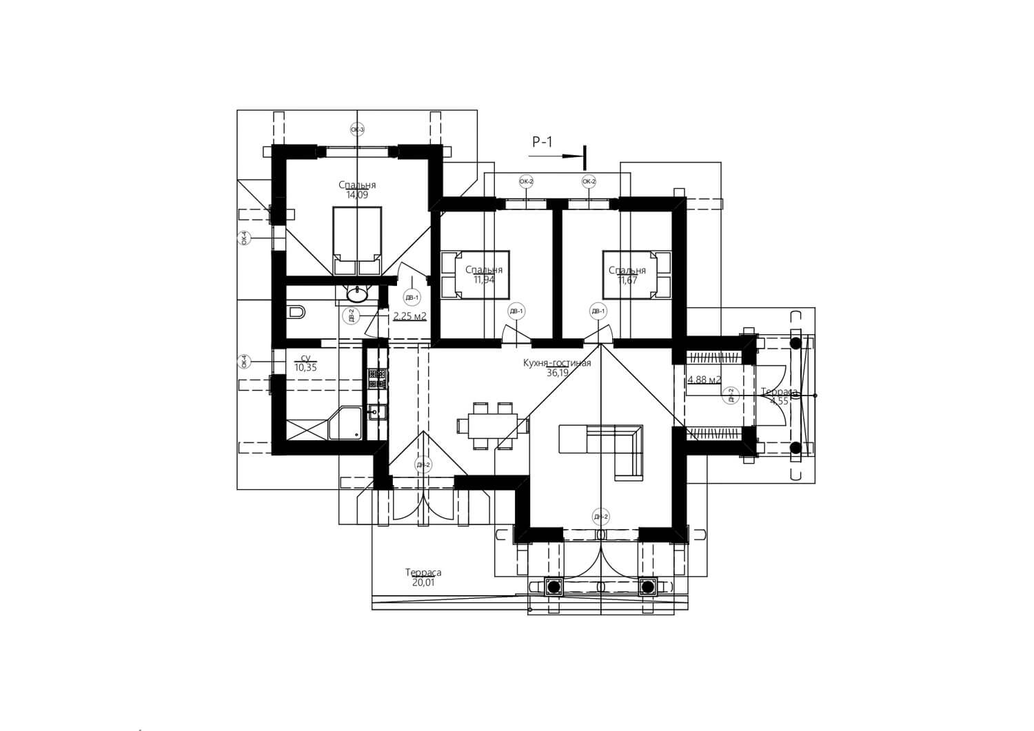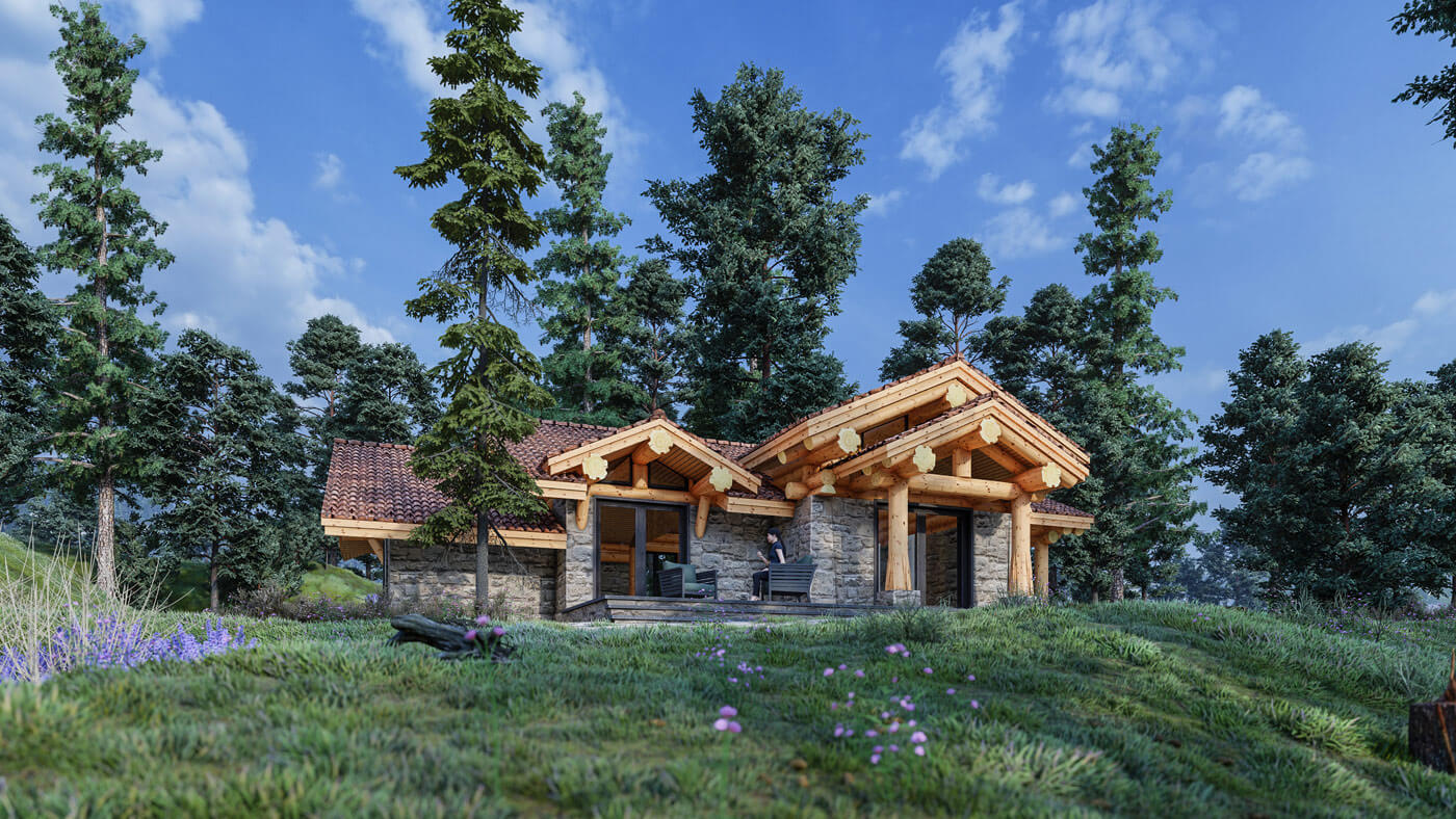 Дом вписан на участок с горным рельефом. Фундамент плита УШП, материал кровли плоская керамическая черепица. Площадь по полу около 100 квадратных метров. Столбы, мауэрлаты и коньки из кедровой сосны средним диаметром 30 см. В кухне-гостиной и в спальнях предполагается что эти деревянные конструкции часть интерьера.