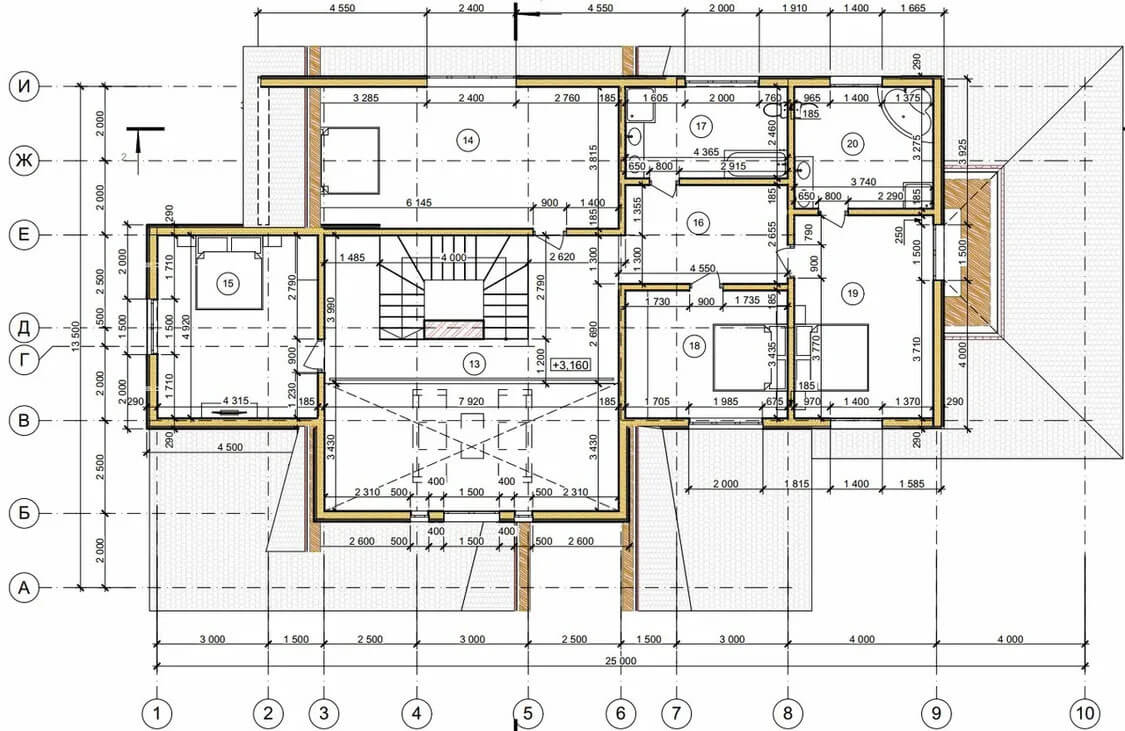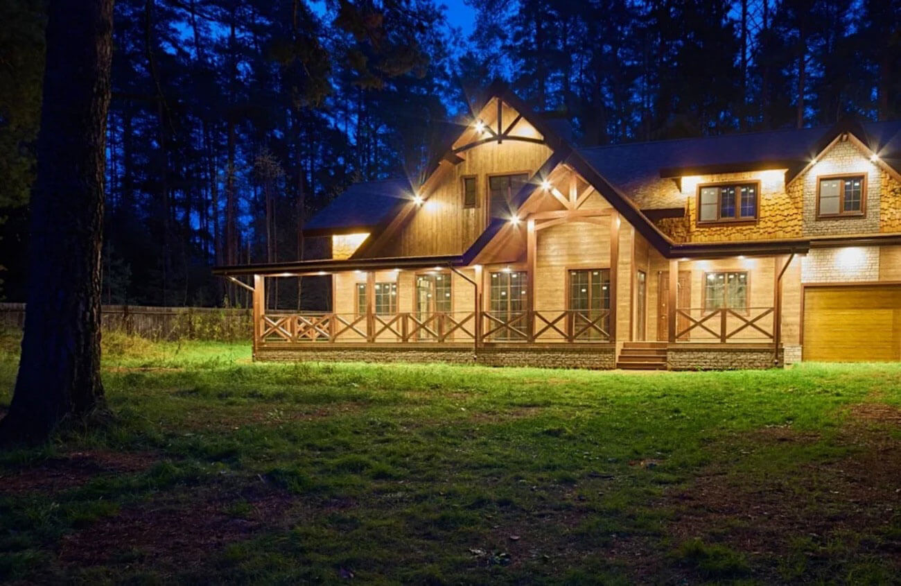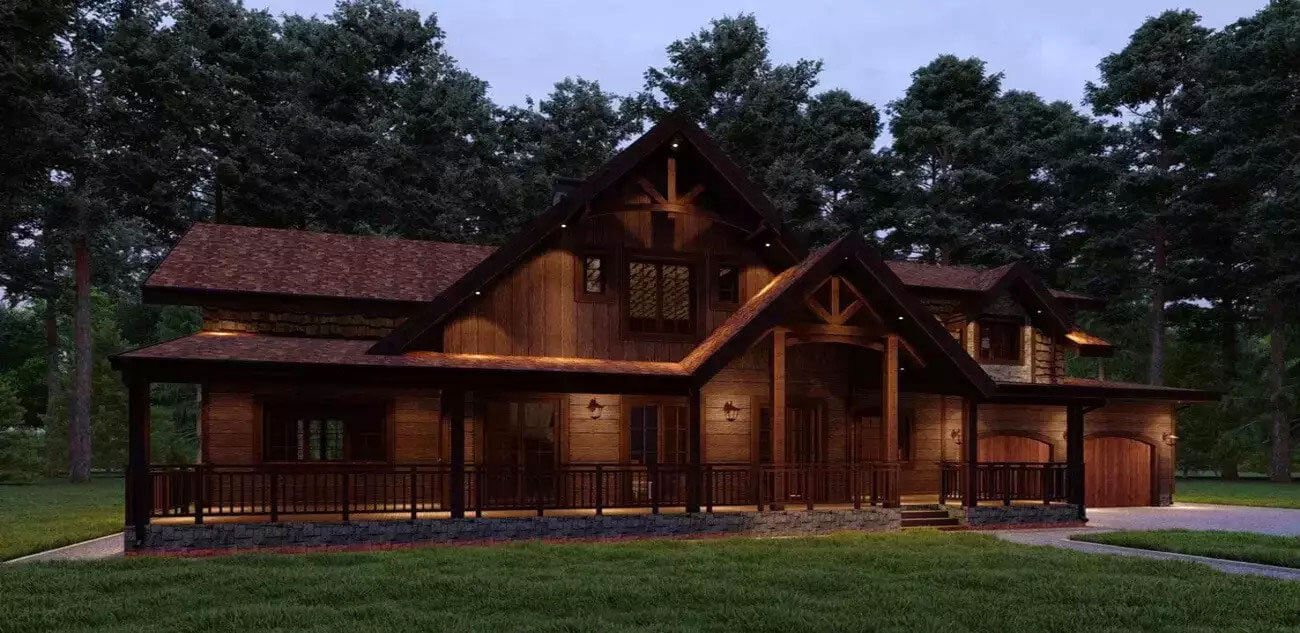 Дом спроектирован и построен в стиле американского деревенского домика, или «лесной берлоги». Основной идеей было создание проекта каркасного дома с максимально деревянной комбинированной отделкой, сложной многоуровневой кровлей, вторым светом в зоне гостиной, большой террасой и гаражом на две машины.