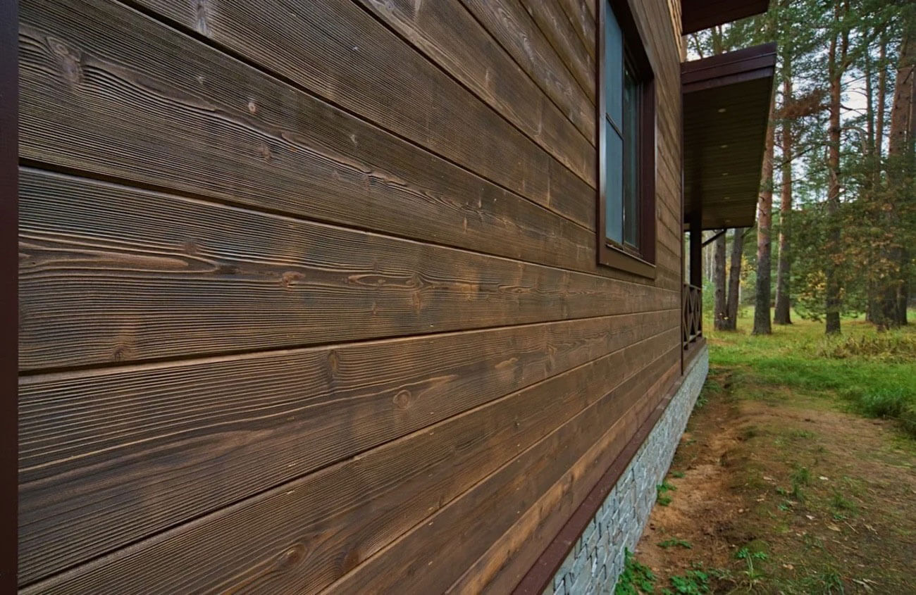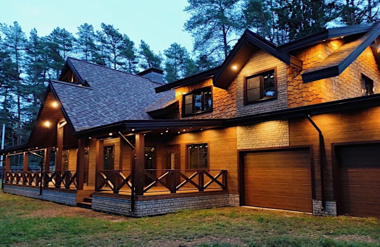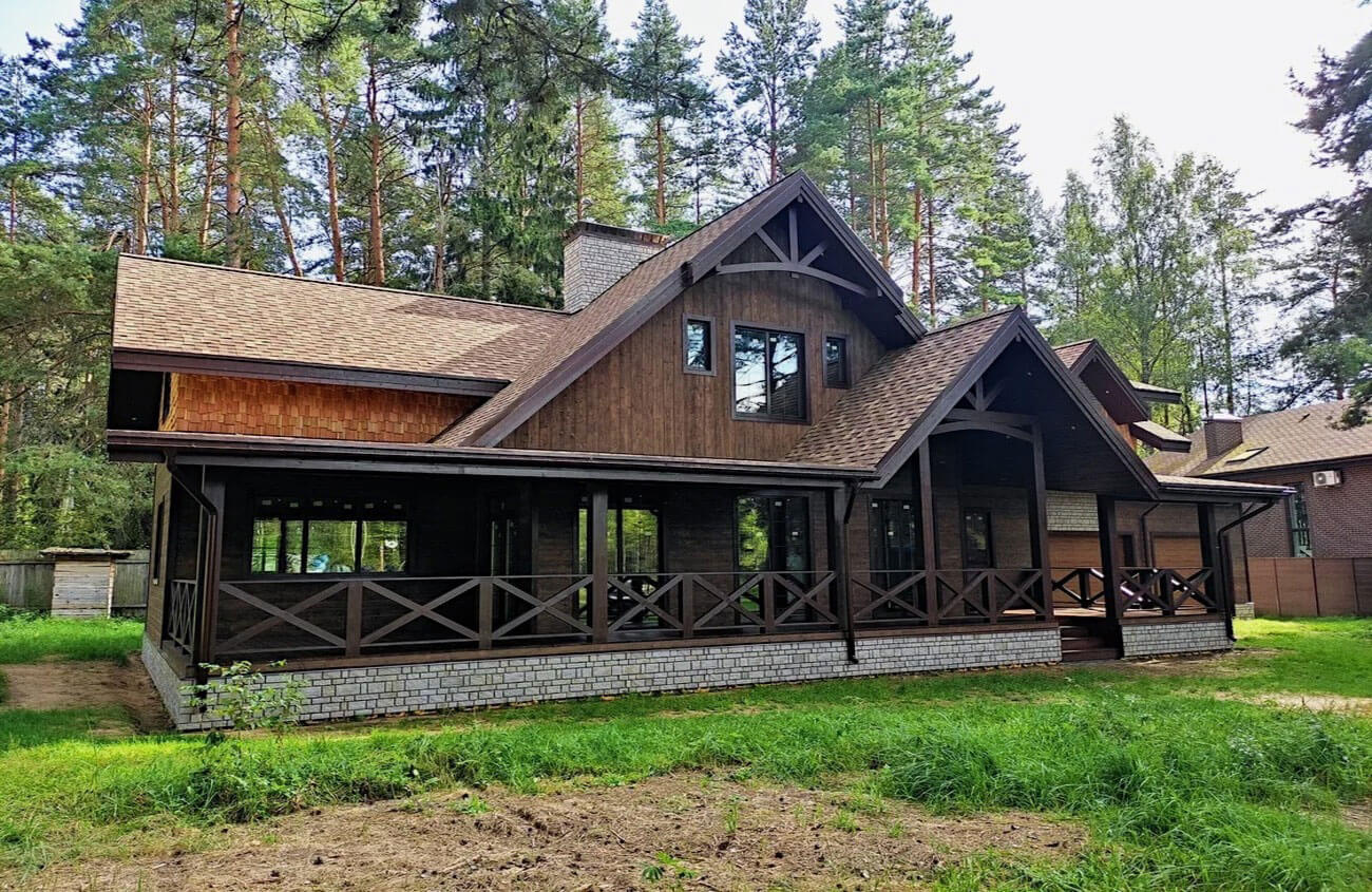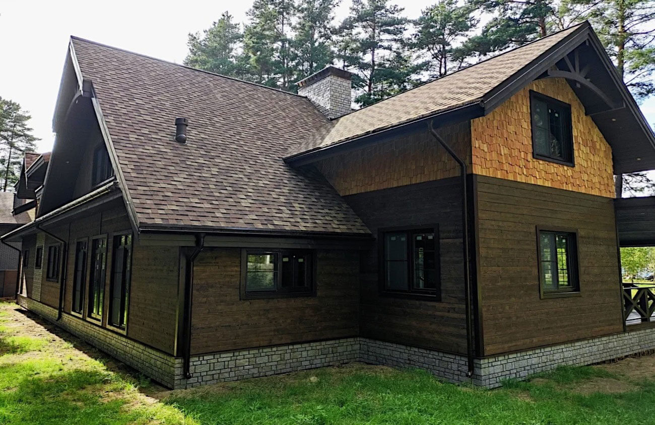 Во внешней отделке дома применены редкие для нашей страны материалы, полностью отвечающие запросу на максимально деревянный и уникальный дом: натуральная кедровая дранка, брашированная (состаренная) имитация бруса, лиственница, а также термопанели с плиткой из искусственного камня, имитирующего разноформатный тёс.