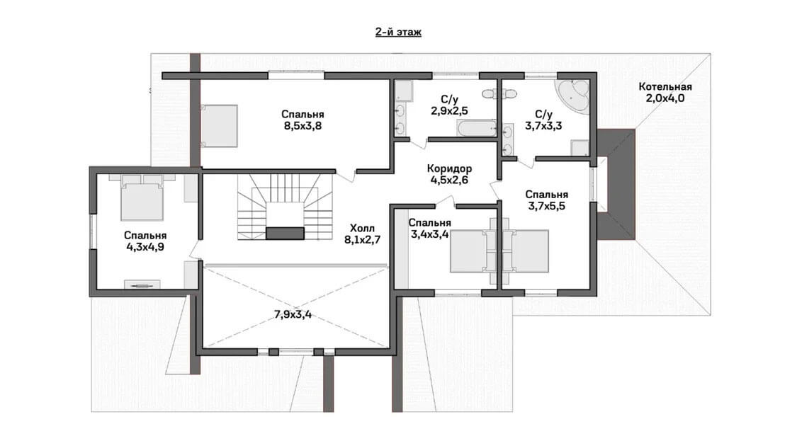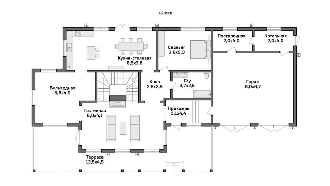 Общая площадь дома составляет 522 кв.м и вмещает в себя 5 спален, 3 санузла, просторную гостиную со вторым светом, кухню-столовую, бильярдную комнату и гараж на две машины с прачечной и котельной. Из кухни-гостиной организован выход на задний двор, полностью занятый высокими соснами. А с балкона холла второго этажа открывается шикарный вид на гостиную с высокими двухуровневыми окнами и сводчатым потолком.