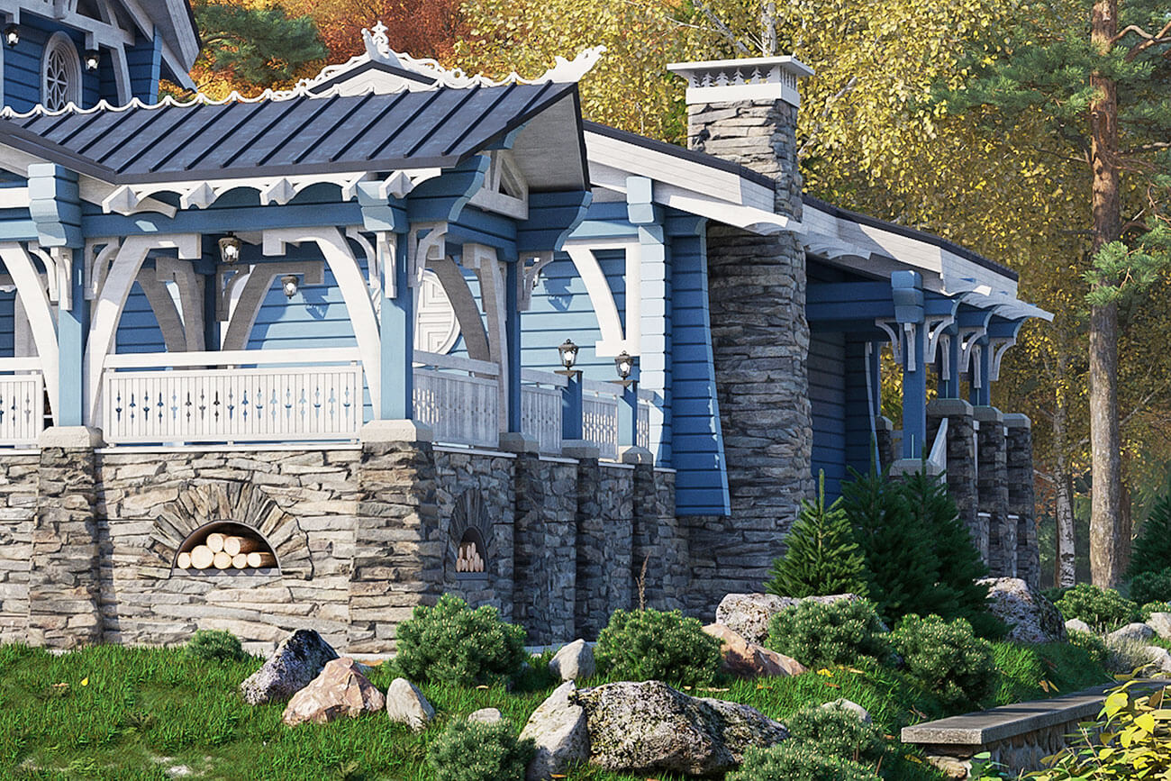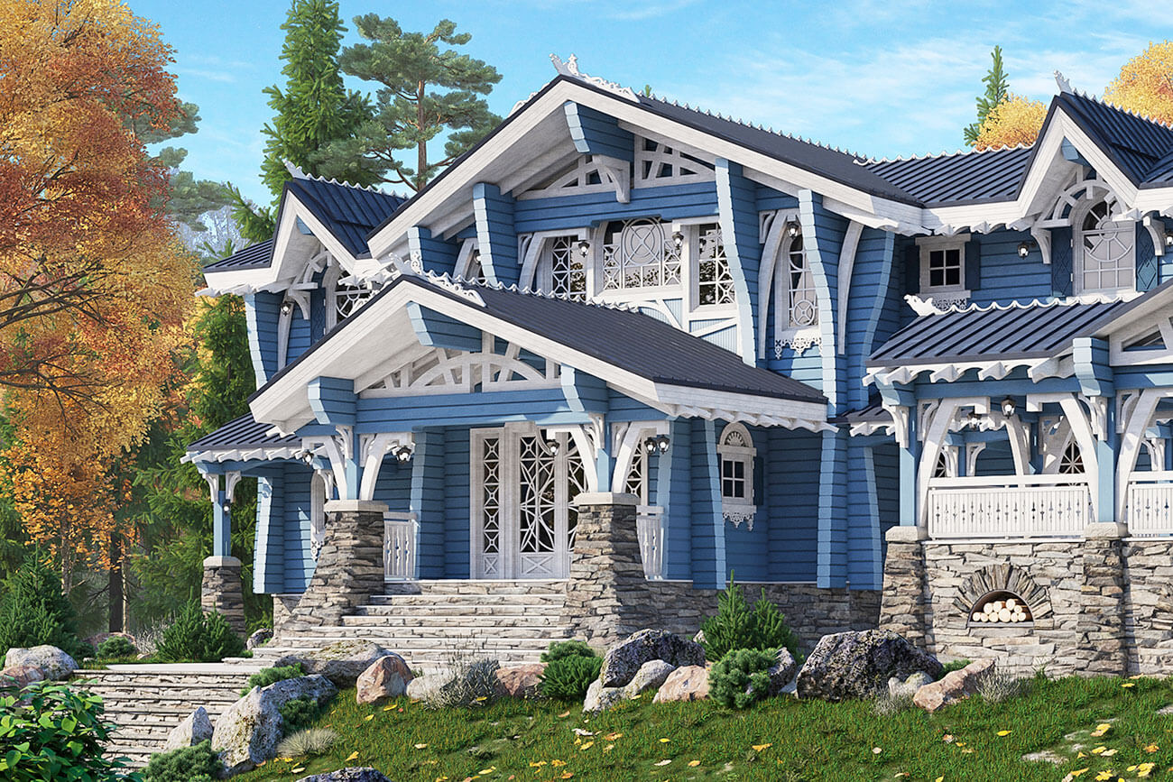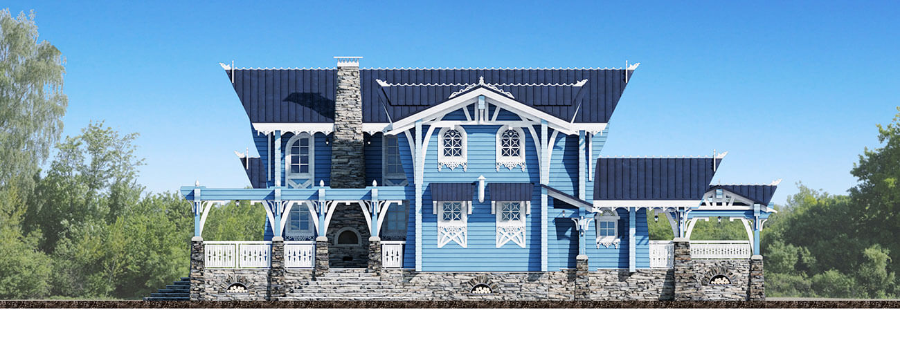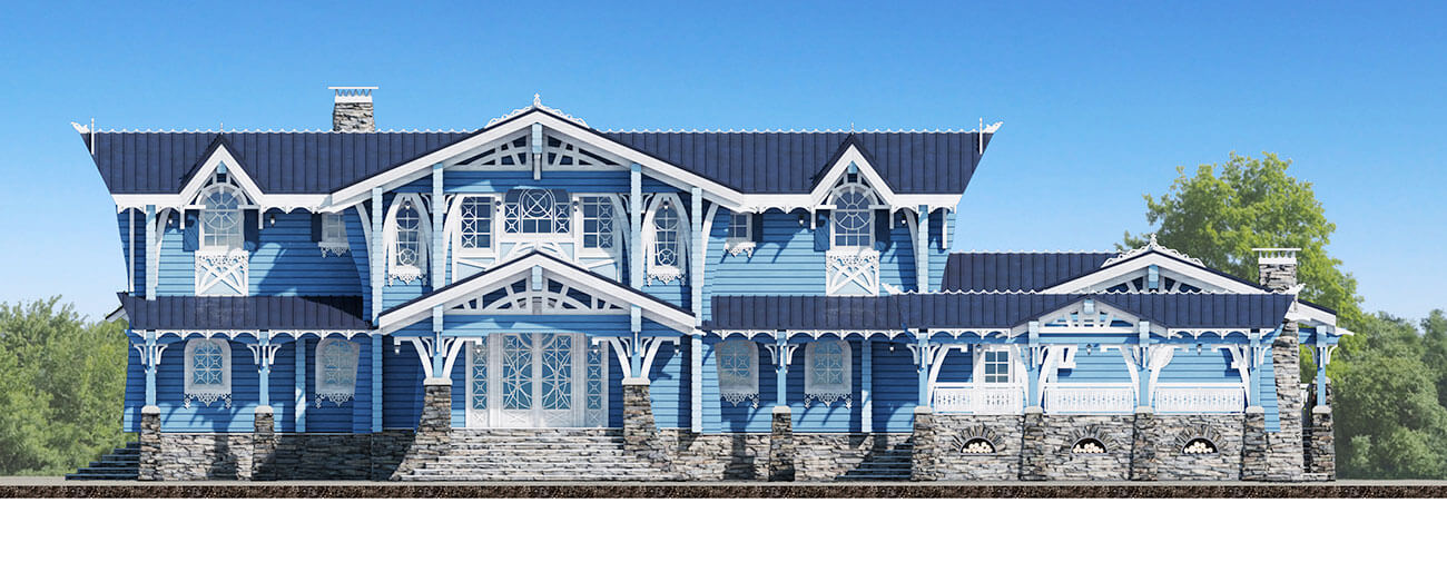 Архитектурно-стилистическое решение представляет собой совмещение традиционного русского стиля и кантри. Эстетическая выразительность архитектуры достигается за счет возможности организации декоративных арок в срубе, а также за счет применения деревянных клееных ферм, несущих декоративную функцию, деревянных подсечек-опор между столбами, обрамления декоративными наличниками окон, облицовки декоративным диким камнем, организации профильности силуэта сруба, декоративных металлических вставок — балконных панелей-ограждений. А также за счет покраски отдельных архитектурных элементов в определенные цвета.