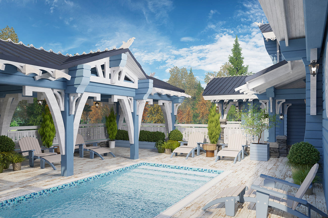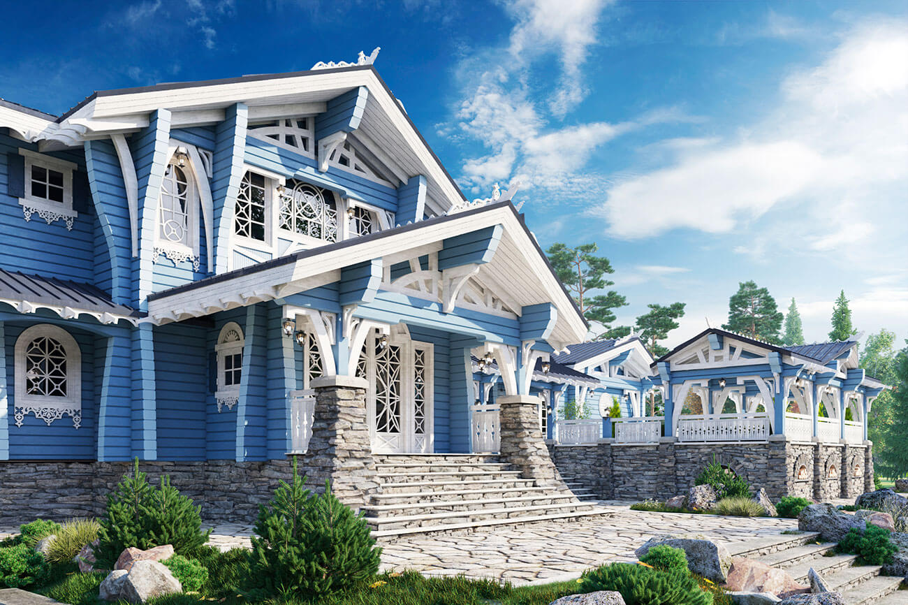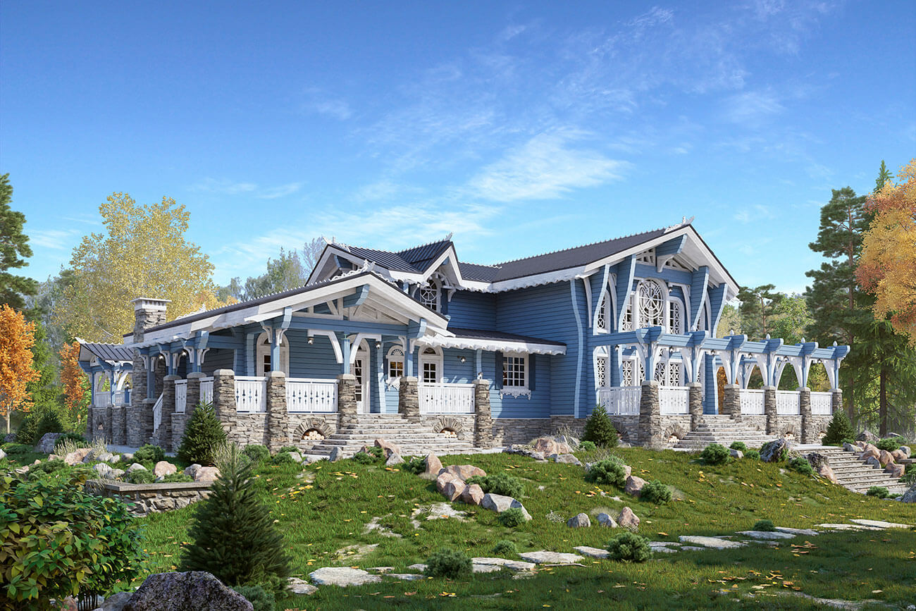 Архитектурно-стилистическое решение представляет собой совмещение традиционного русского стиля и кантри. Эстетическая выразительность архитектуры достигается за счет возможности организации декоративных арок в срубе, а также за счет применения деревянных клееных ферм, несущих декоративную функцию, деревянных подсечек-опор между столбами, обрамления декоративными наличниками окон, облицовки декоративным диким камнем, организации профильности силуэта сруба, декоративных металлических вставок — балконных панелей-ограждений. А также за счет покраски отдельных архитектурных элементов в определенные цвета.