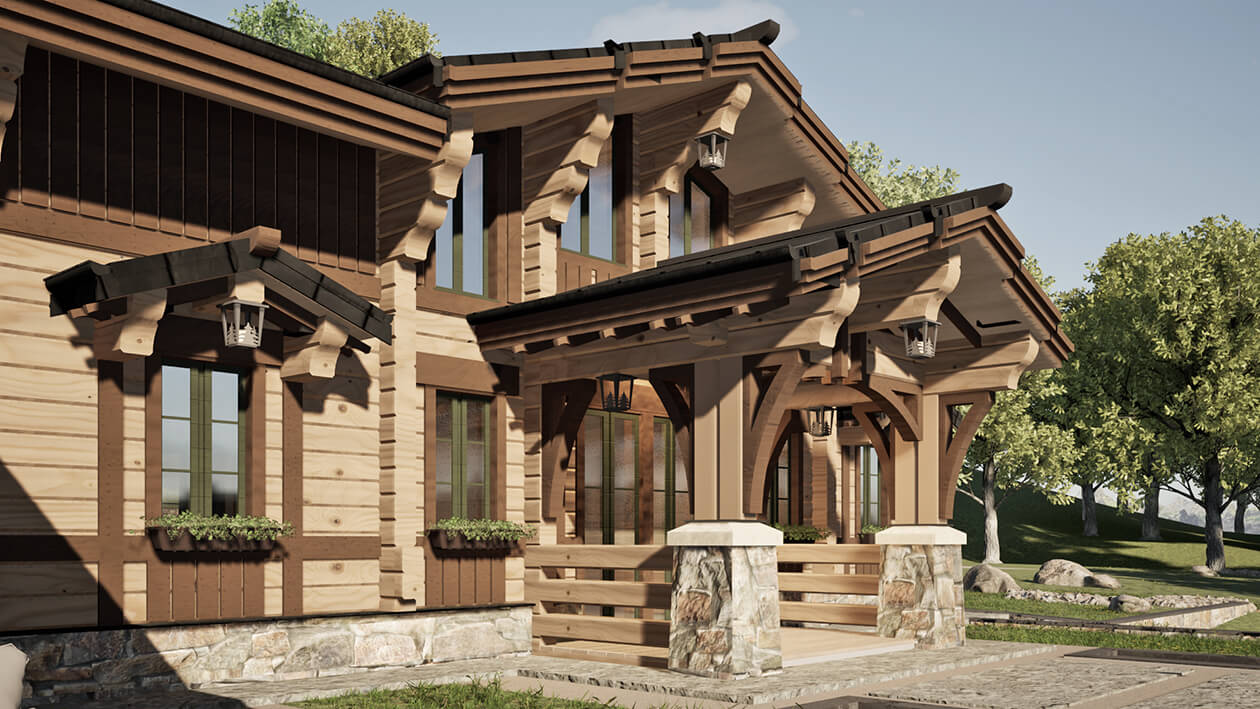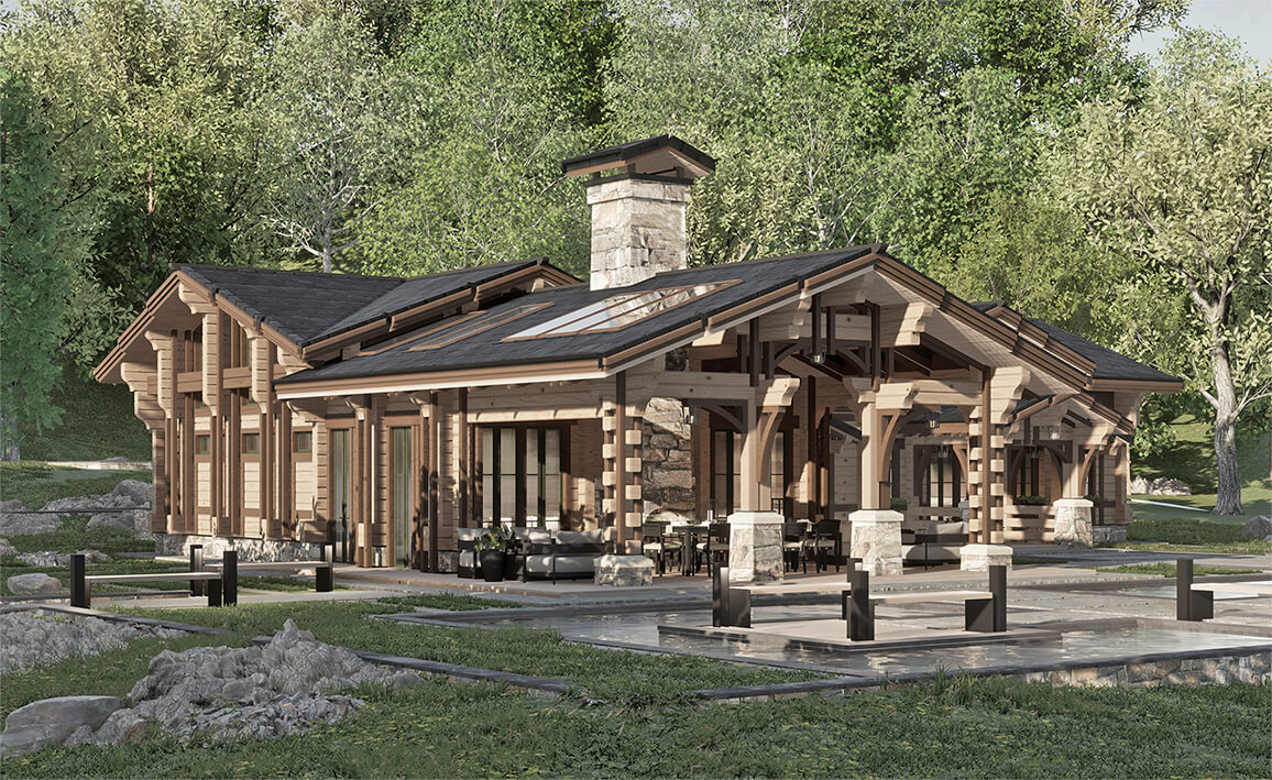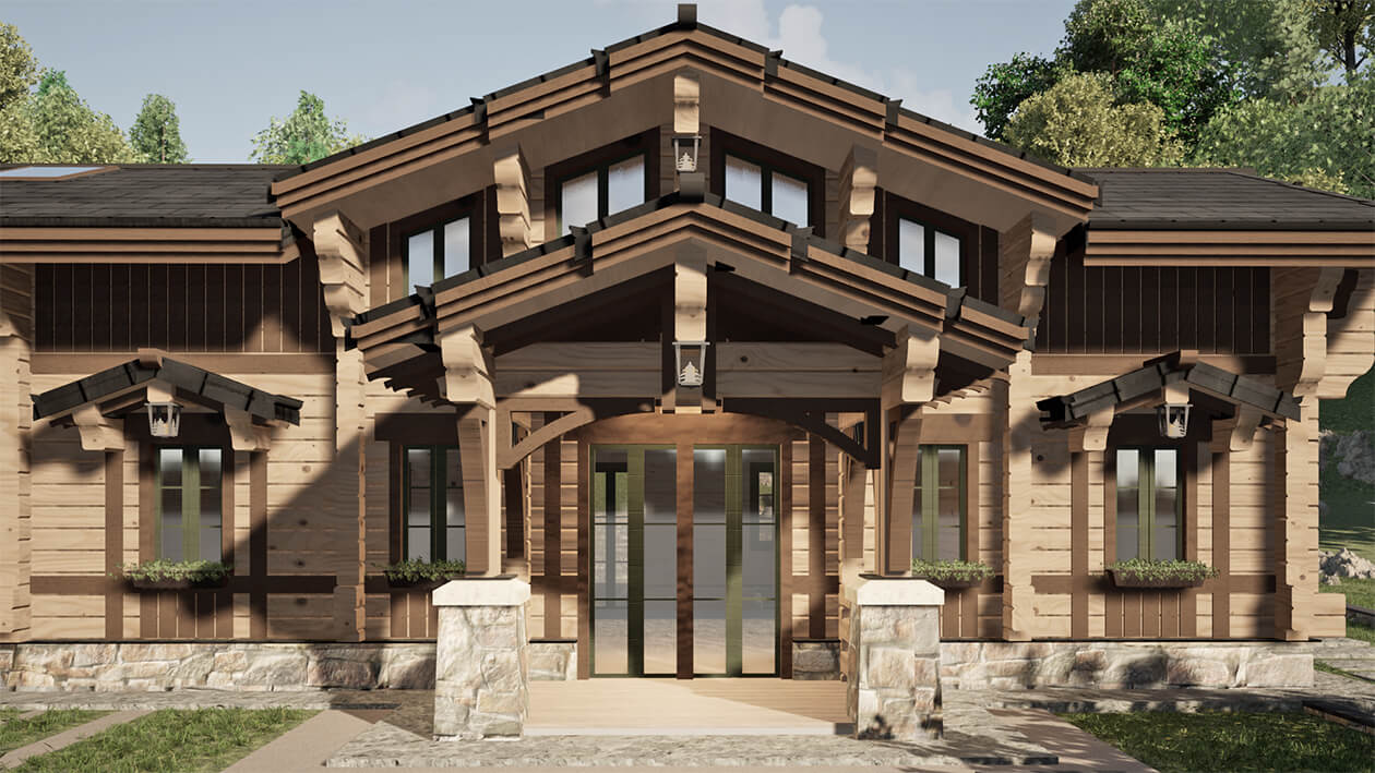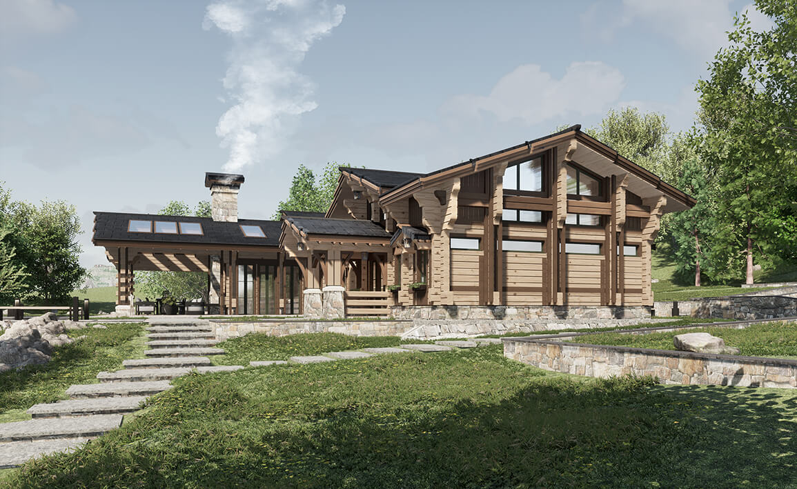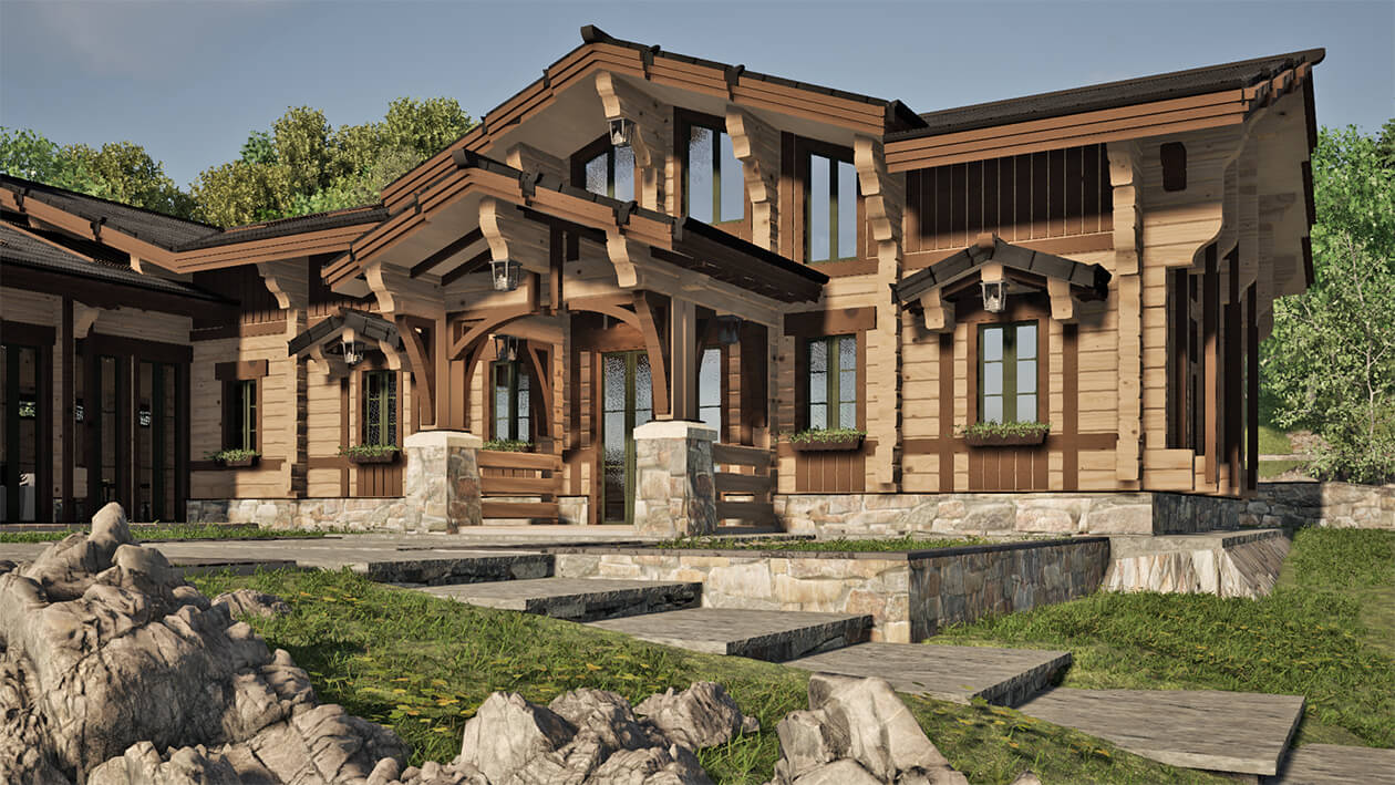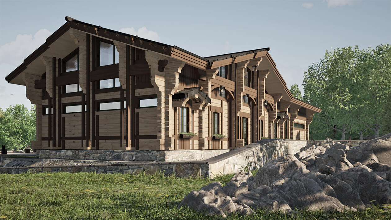 Лаконичность и сдержанность являются ключевым идеологическим мотивом всего проекта. Предполагается четкая центричная композиционная схема с разделением проекта на жилую и хозяйственную часть. Асимметрия достигается за счет крылец и функциональным зонированием пространства, которое отражается соответствующими выступами сруба на плоскости фасадов.