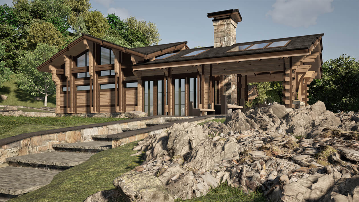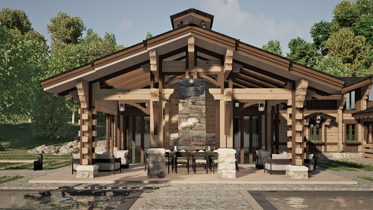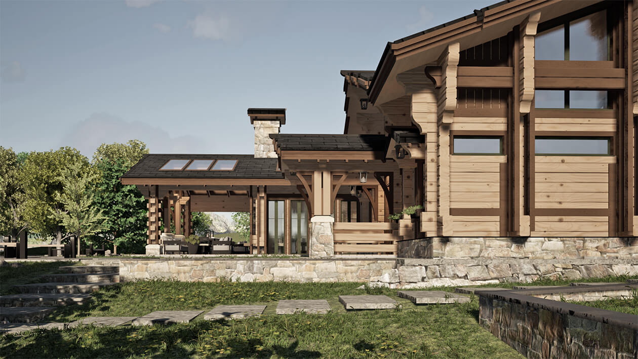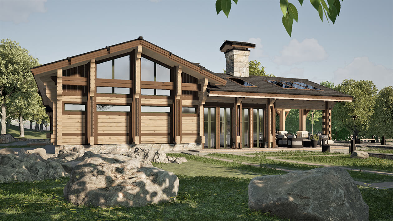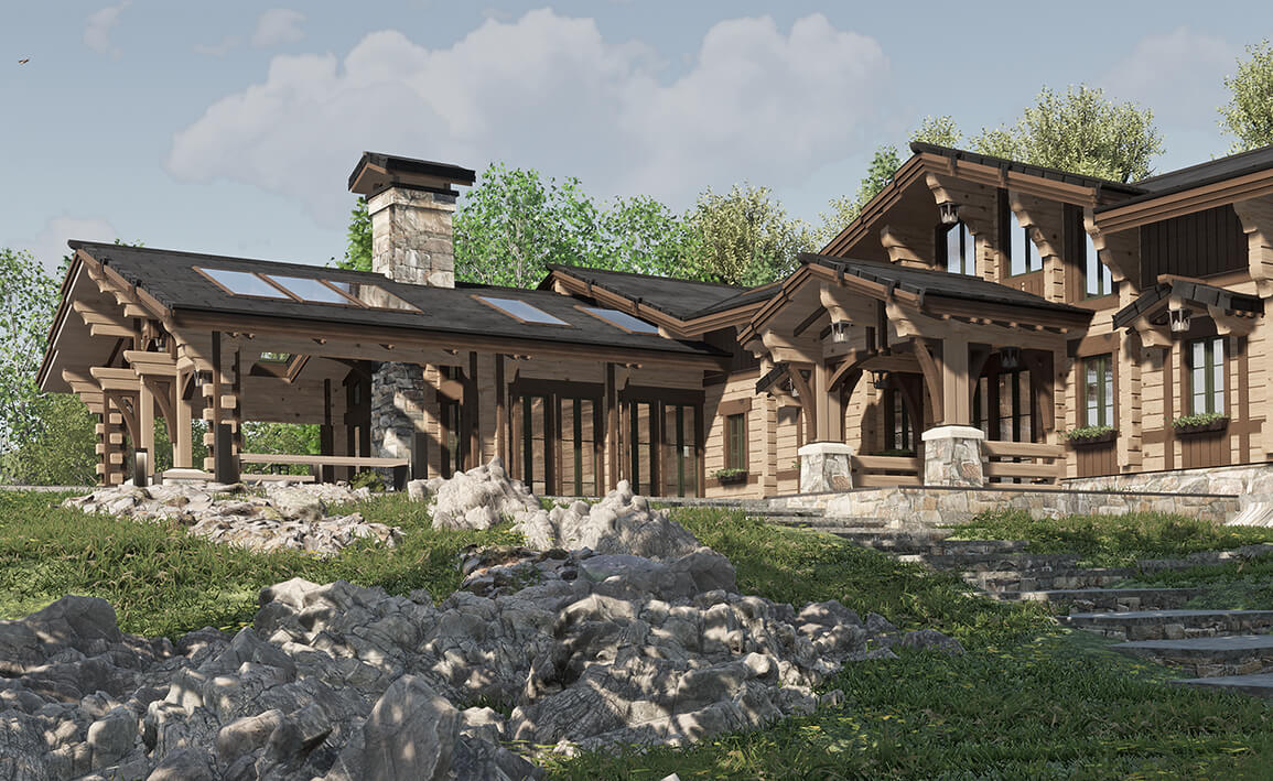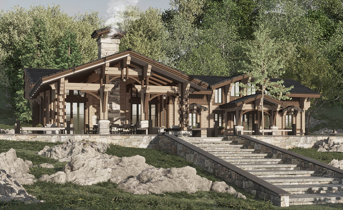Лаконичность и сдержанность являются ключевым идеологическим мотивом всего проекта. Предполагается четкая центричная композиционная схема с разделением проекта на жилую и хозяйственную часть. Асимметрия достигается за счет крылец и функциональным зонированием пространства, которое отражается соответствующими выступами сруба на плоскости фасадов.