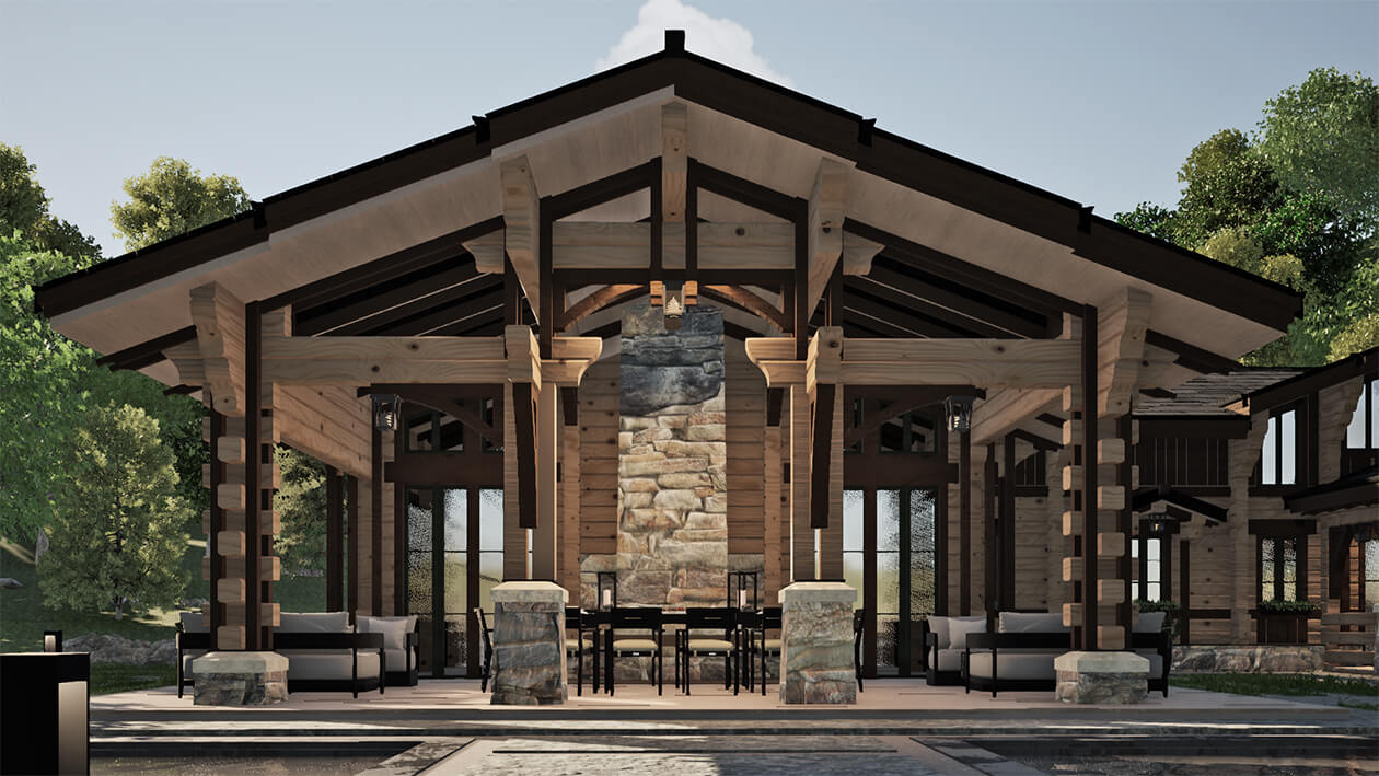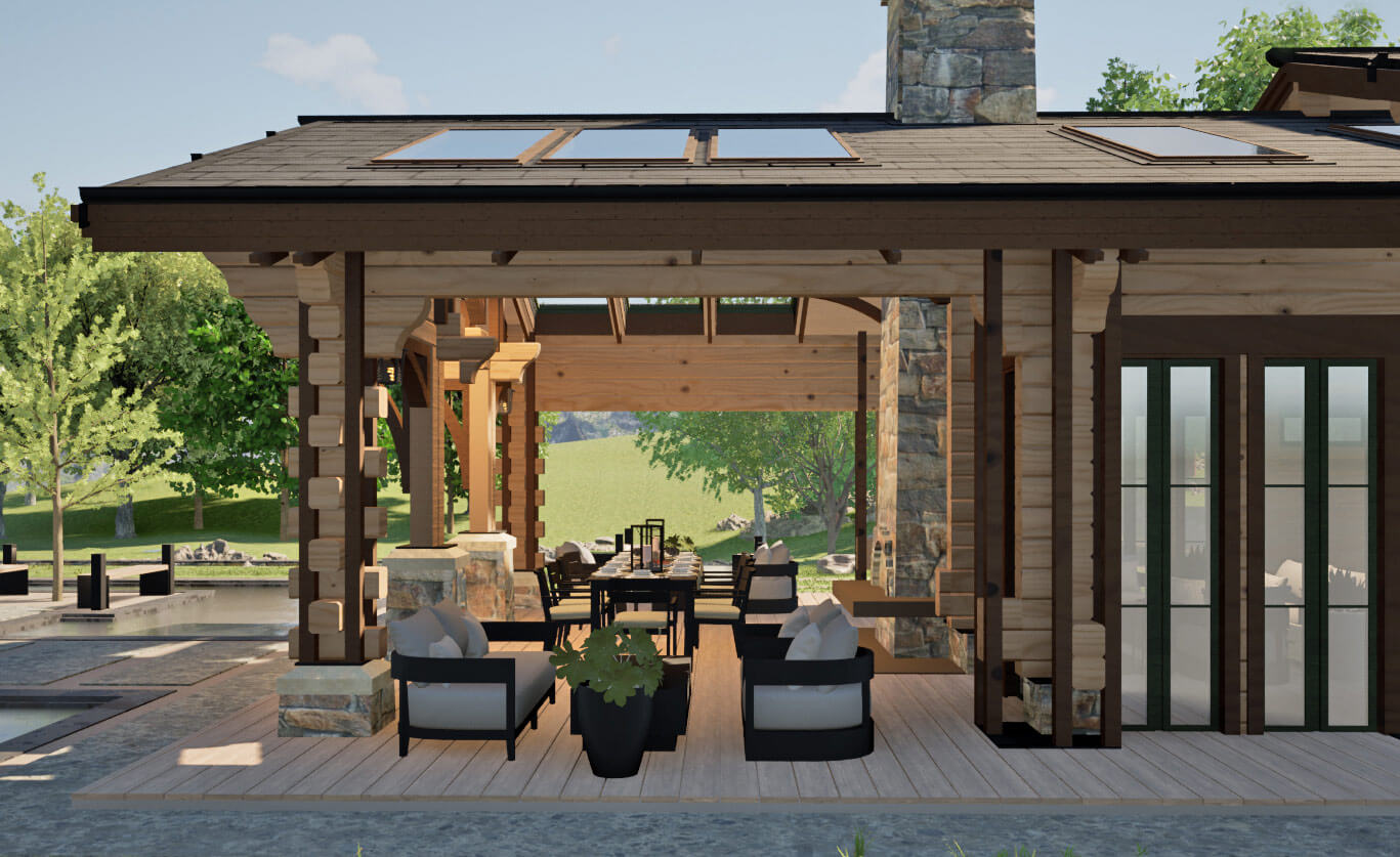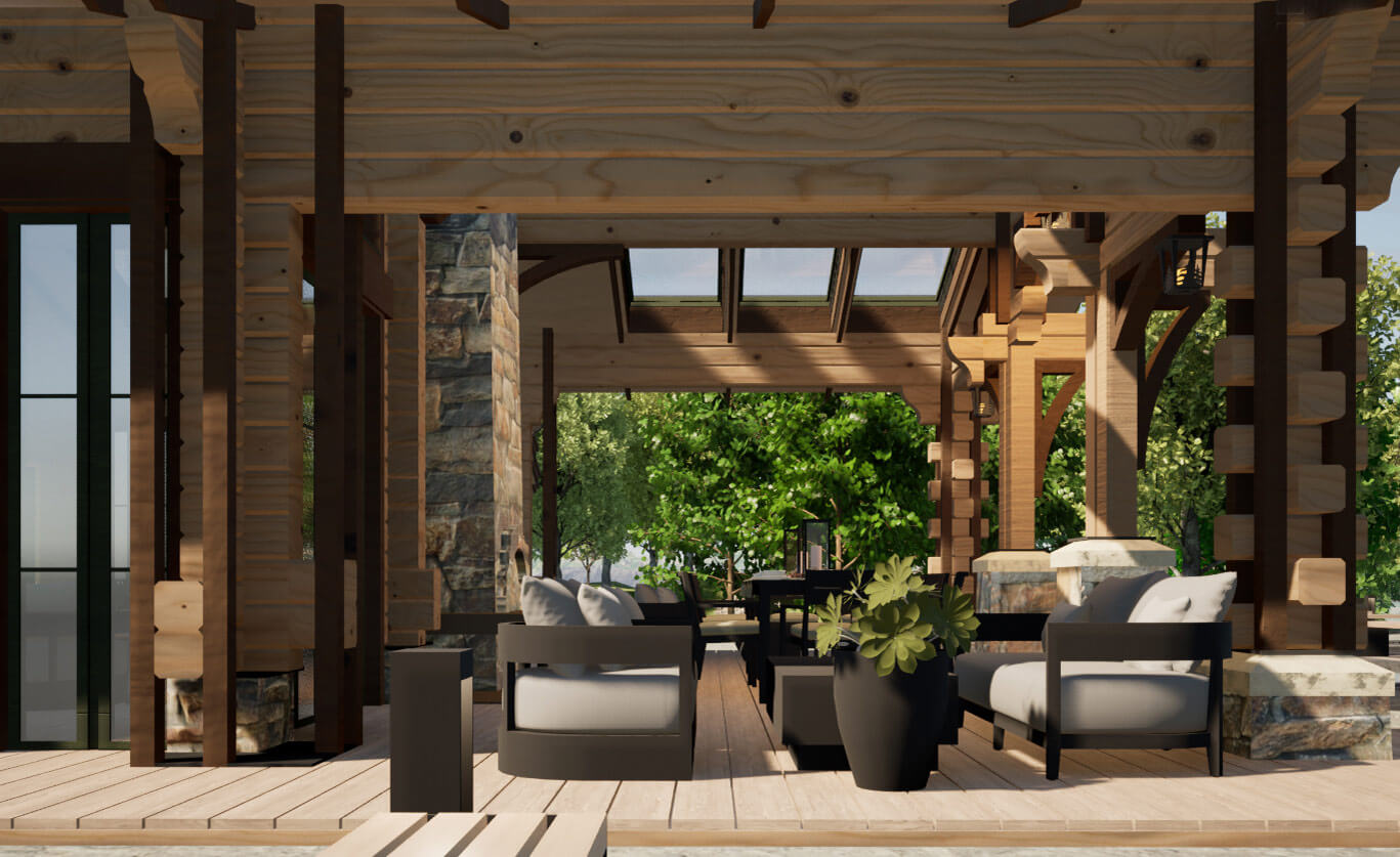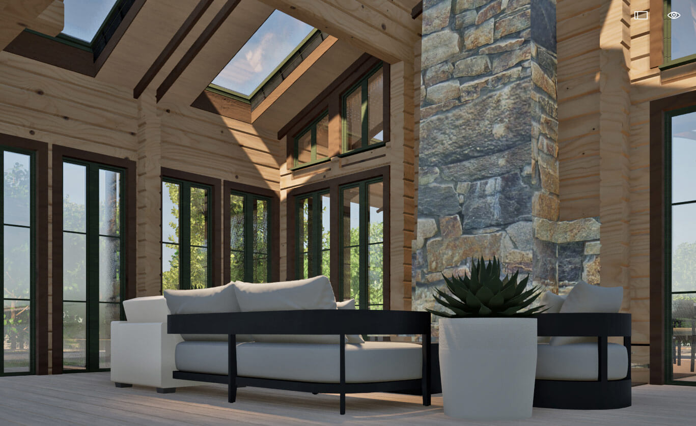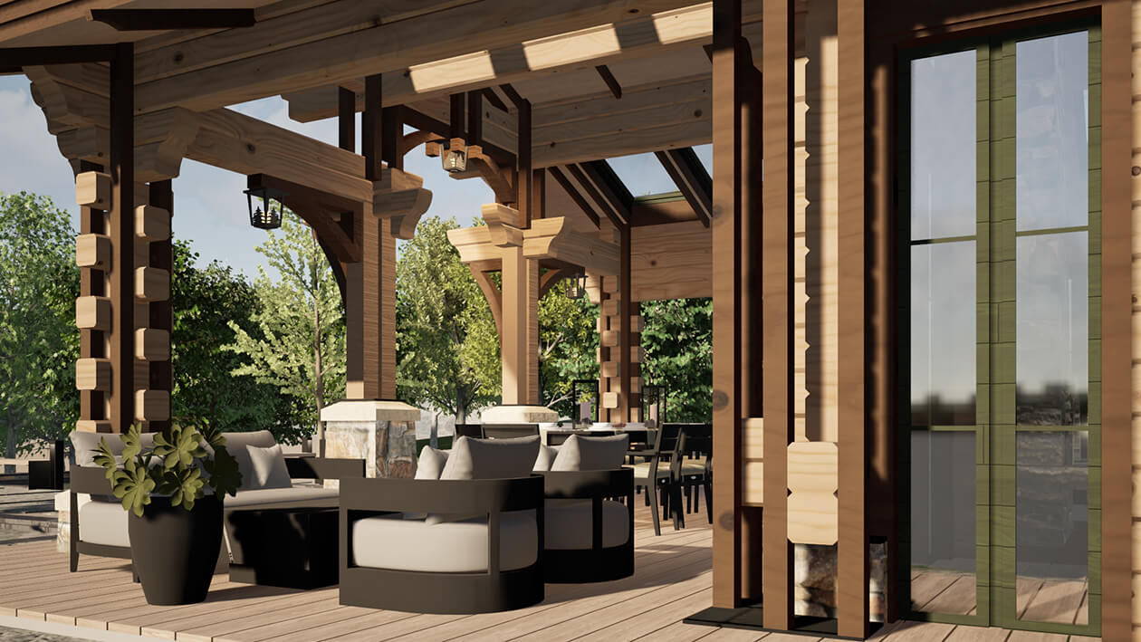 Лаконичность и сдержанность являются ключевым идеологическим мотивом всего проекта. Предполагается четкая центричная композиционная схема с разделением проекта на жилую и хозяйственную часть. Асимметрия достигается за счет крылец и функциональным зонированием пространства, которое отражается соответствующими выступами сруба на плоскости фасадов.
