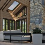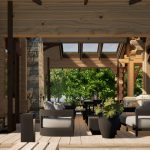 Особое внимание уделено декору и деталировке: в структуре террасы присутствуют рустованные, фактурные опоры с каменными цоколями, ручная отделка древесины, традиционные кронштейны, поддерживающие балки, и простые, но выразительные светильники в едином стиле. Характерны сдержанные орнаментальные вставки из металла и минималистичное оформление мебели. Растения в крупных кашпо вносят в пространство нотки уюта и природной гармонии.