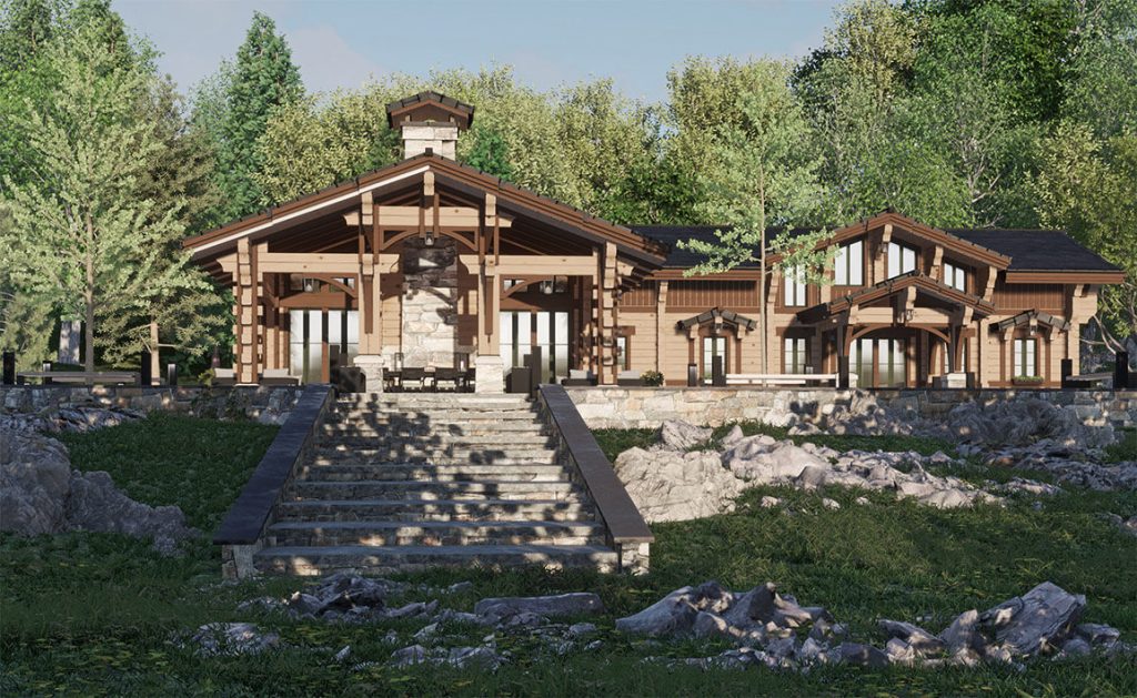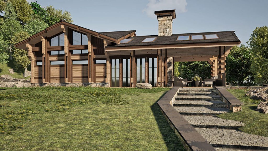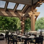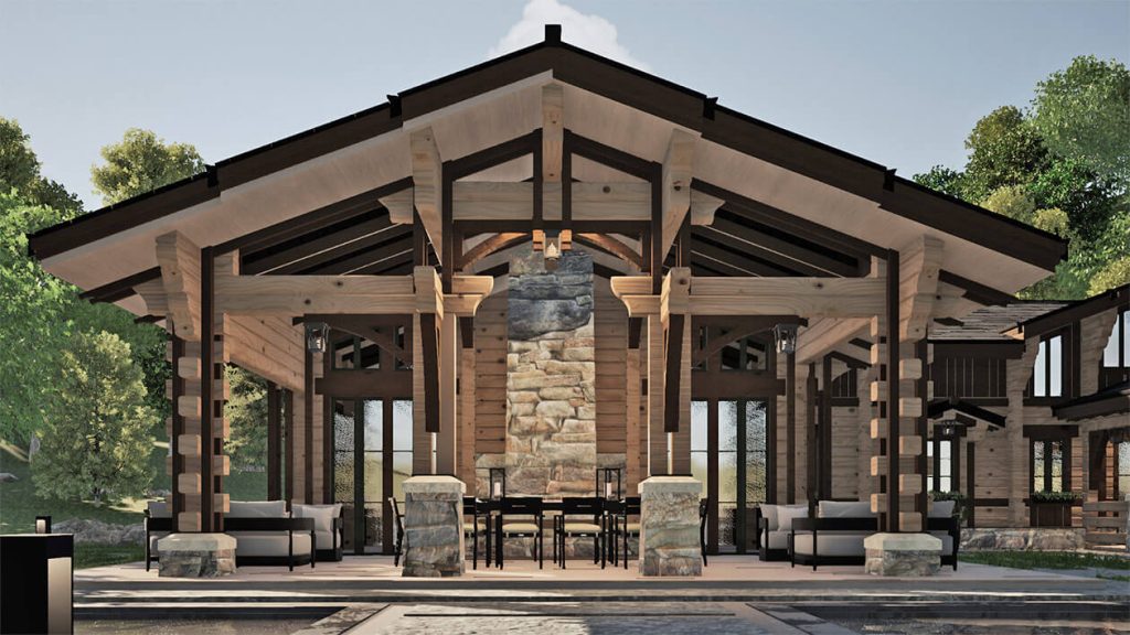 Основной акцент фасадного декора составляют грубые, но эстетичные элементы фахверка и выразительные детали резного декора в стилистике кантри. Ключевой архитектурный мотив – сочетание деревянных конструкций с облицовкой из природного камня, что усиливает ощущение единения с природой и придает террасе дополнительную монументальность.