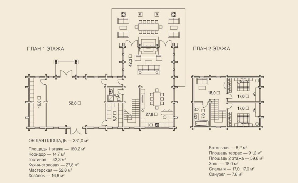 Терраса расположена под общим навесом, объединяющим пространство для отдыха и праздничных застолий. Несущая структура выполнена из профилированного бруса прямоугольного сечения 200х200 мм, что визуально подчеркивает основательность и долговечность конструкции, а также задает модульную, ритмичную организацию пространства. Конструктив и пластика сруба дополнены аскетичной, но выразительной столярной обработкой узлов крепления: используются открытые деревянные соединения, широкие выпуски и массивные консоли, характерные для русского деревянного стиля.
