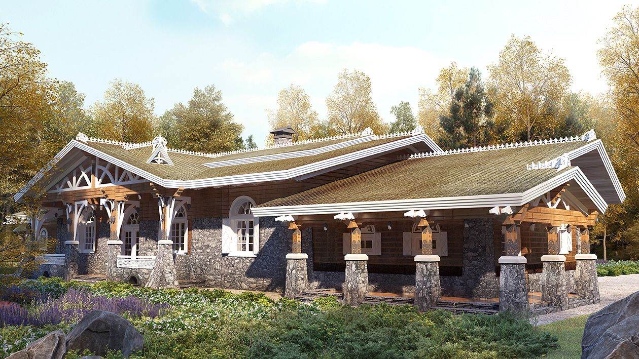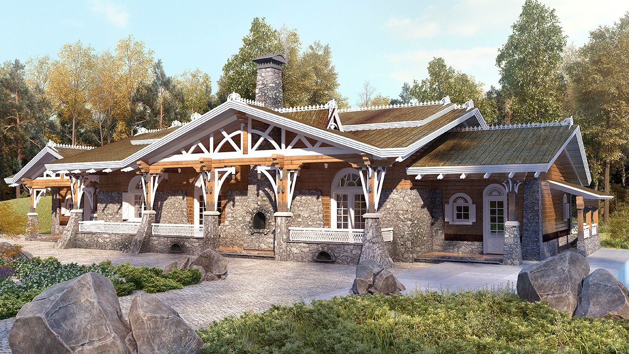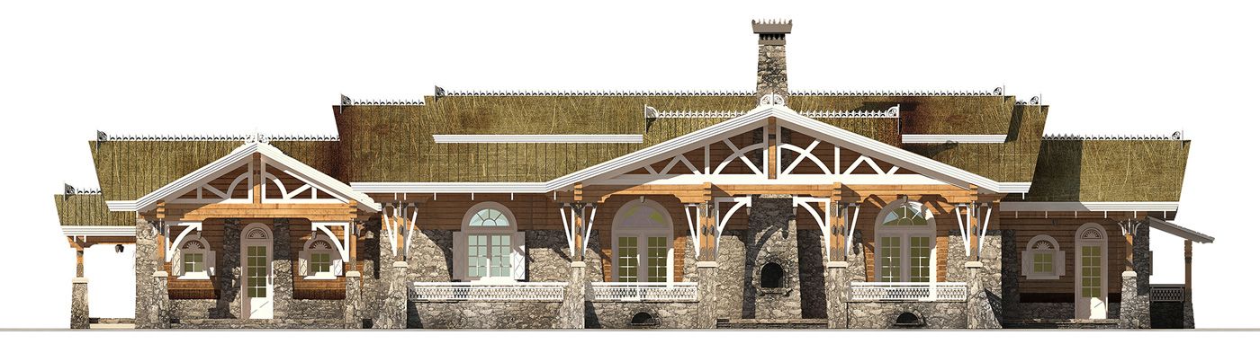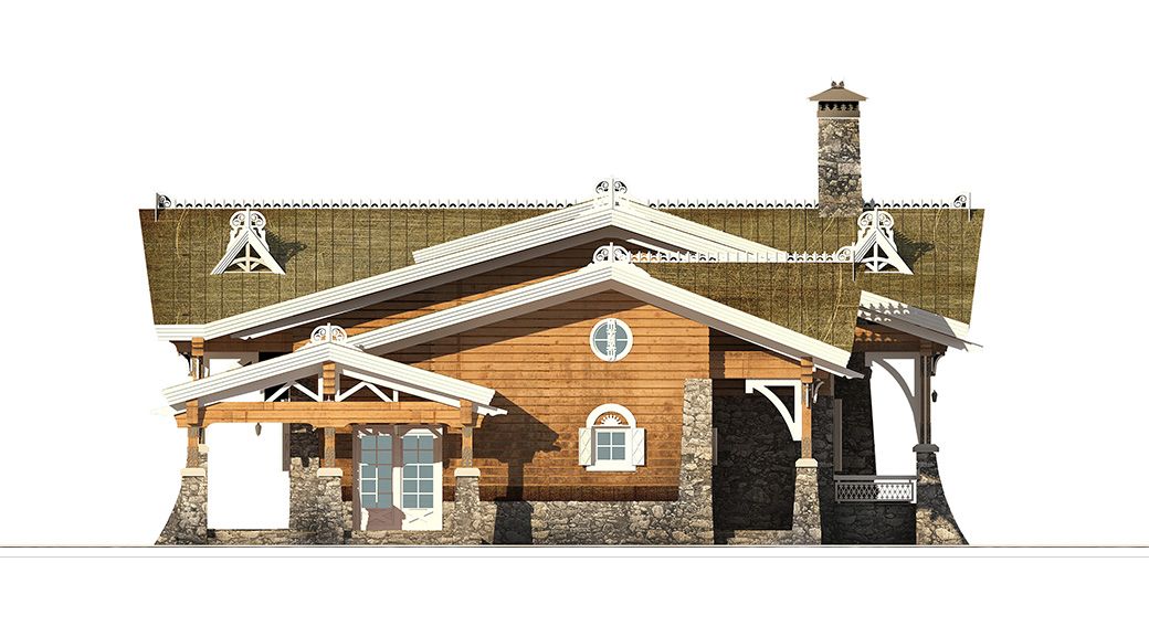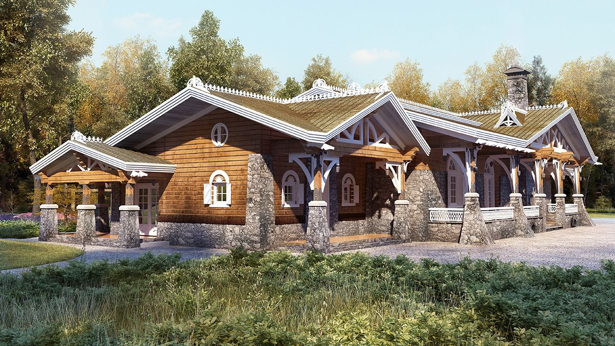 Проект одноэтажного загородного дома выполнен в авторской стилистике, сочетающей элементы кантри и русского стиля. Дом разделен на жилую часть и мастерскую с отдельным входом. Предусмотрен цокольный подвал со своим входом с улицы. Главной доминантой, разделяющей горизонтальный объем фасада, является труба дымохода с камином изнутри дома и барбекю со стороны улицы. Декоративные элементы фасада, балок и столбов завершают целостность образа.