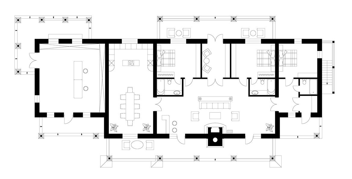 План дома организован таким образом, что вмещает в себя просторную гостиную с баром, столовую с кухней, две спальни с отдельными ванными и гостевую комнату. Мастерская может использоваться как летом, так и зимой.