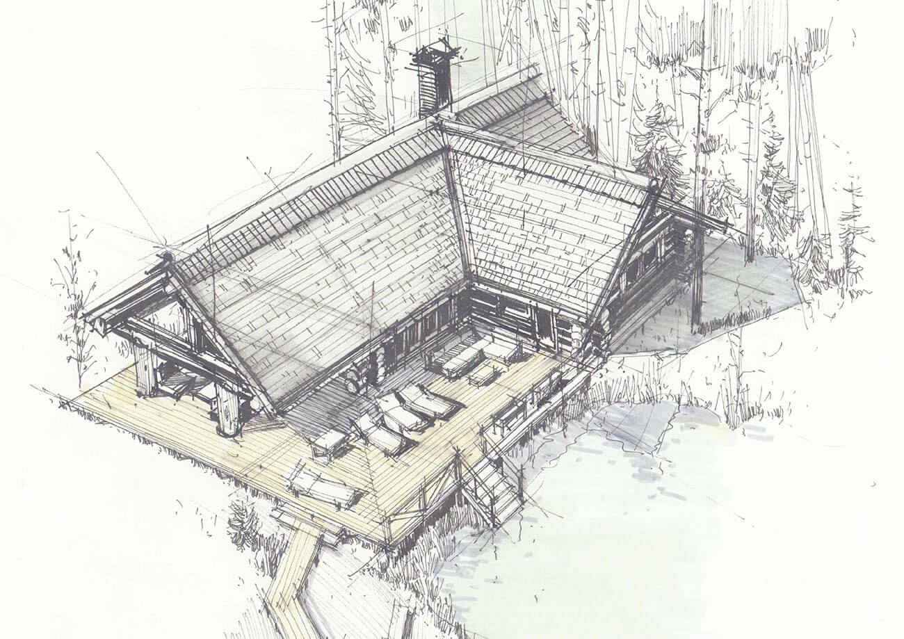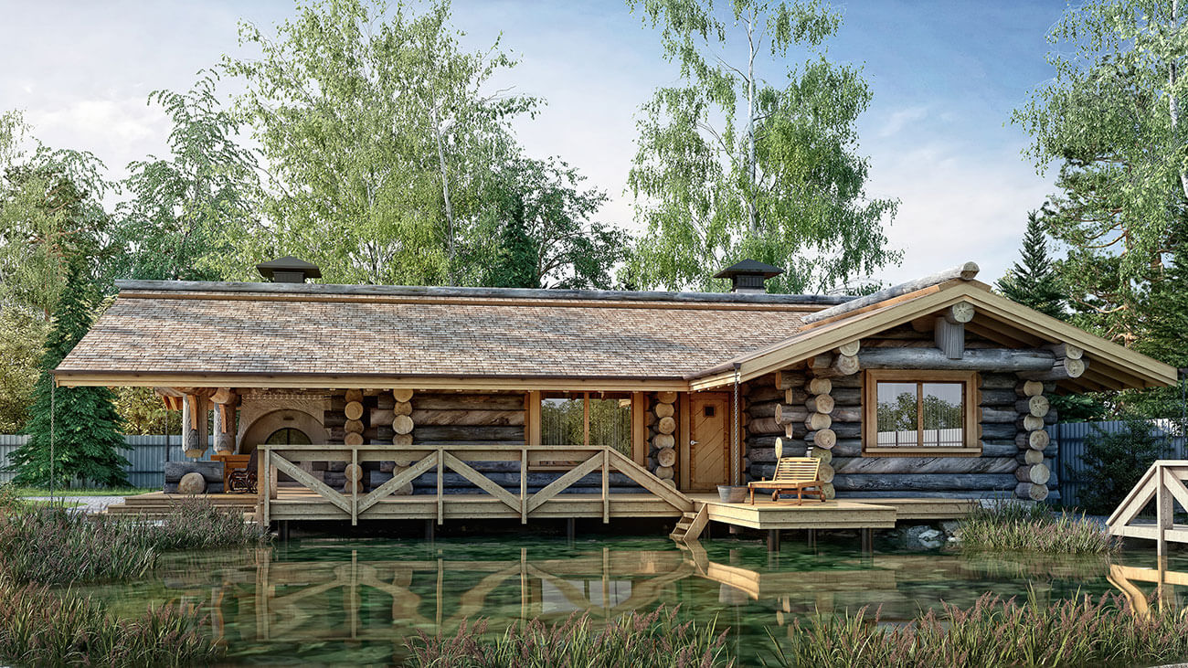 Баня запроектирована для круглогодичного использования в коттеджном поселке «Вымпел» Московской области на участке со спокойным ровным рельефом. Проектируемая баня одноэтажная, с совмещенный скатной кровлей. Архитектурное решение образа бани — объемно-пространственная композиция горизонтальной направленности, подчеркнутая линиями кровель, архитектурными деталями сруба, сочетающая современное видение с традициями деревянной архитектуры.