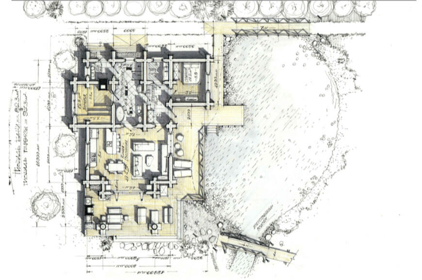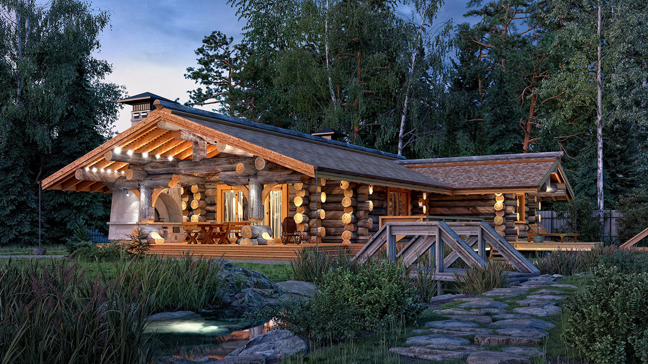 - Несущие конструкции террасы: колонны и балки из бревна КЕLO диаметром 500 мм;